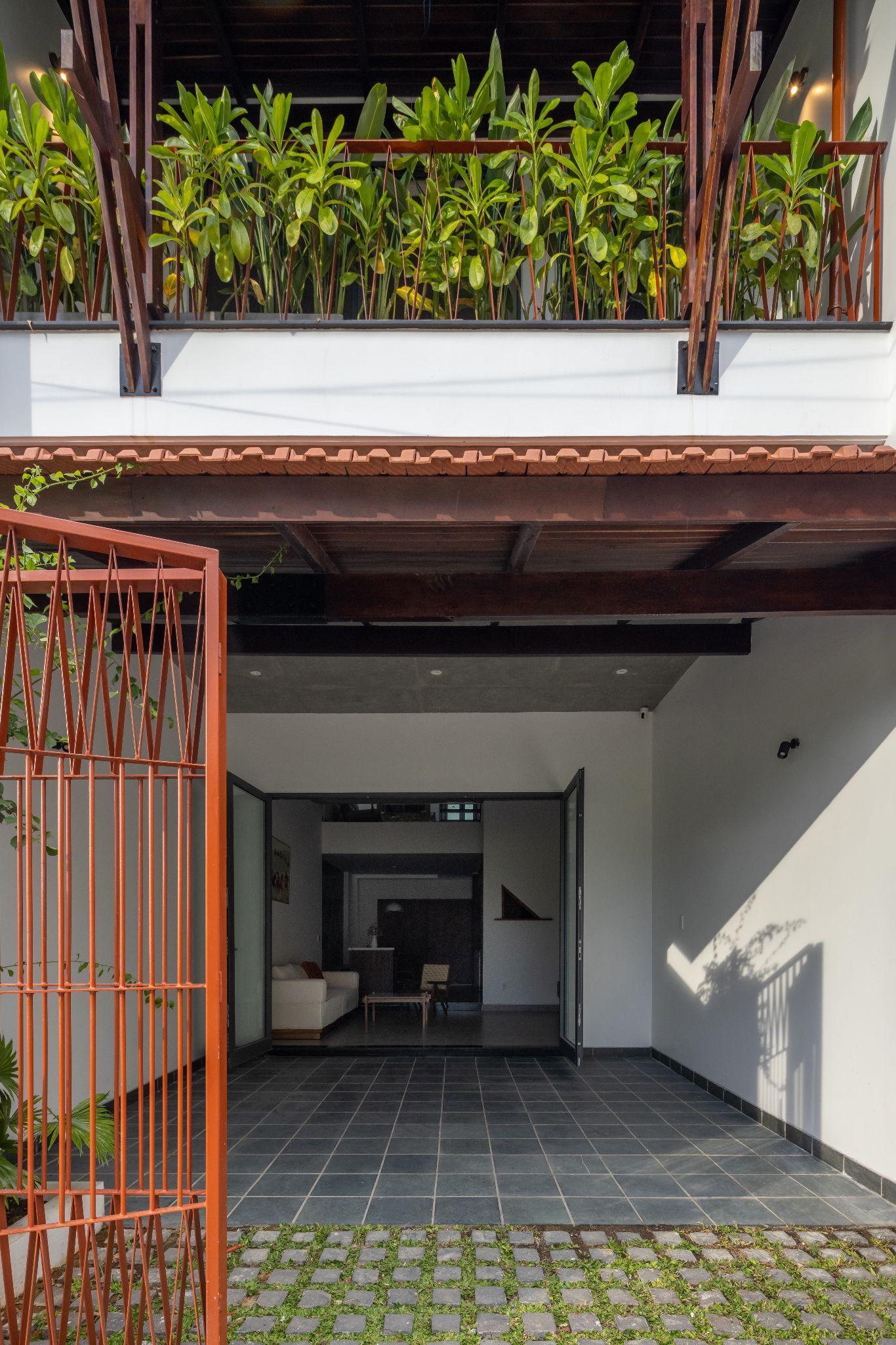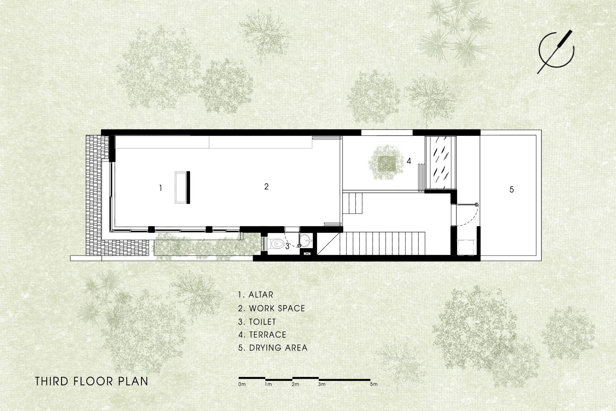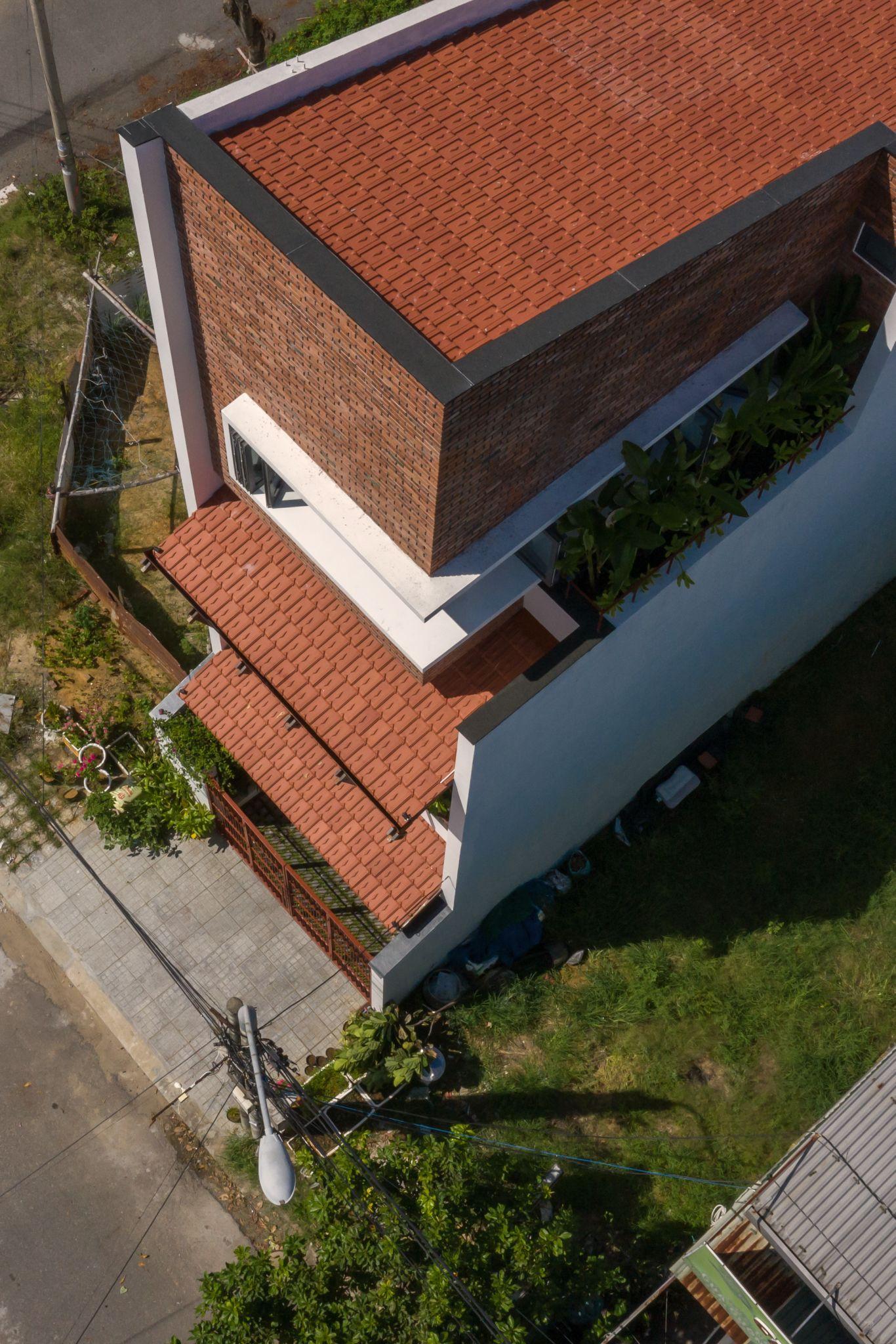 Theo đó, khối nhà ba tầng được cấu trúc bằng sự hòa trộn vật liệu địa phương: gạch đất nung làm chủ đạo cho mặt tiền và vách cầu thang; gạch kính màu được bố trí ngẫu hứng khắp ngôi nhà; mái ngói và gỗ cũ hơn 30 năm được tái sử dụng; trần bê tông thô mộc.