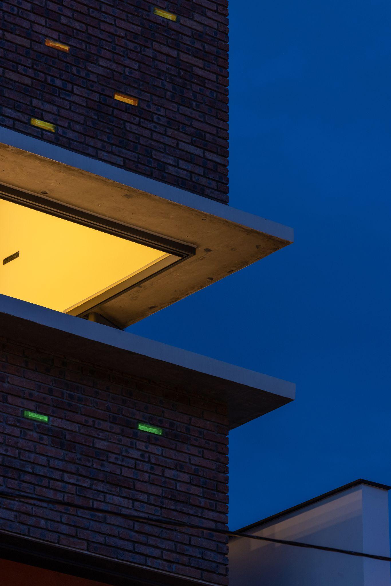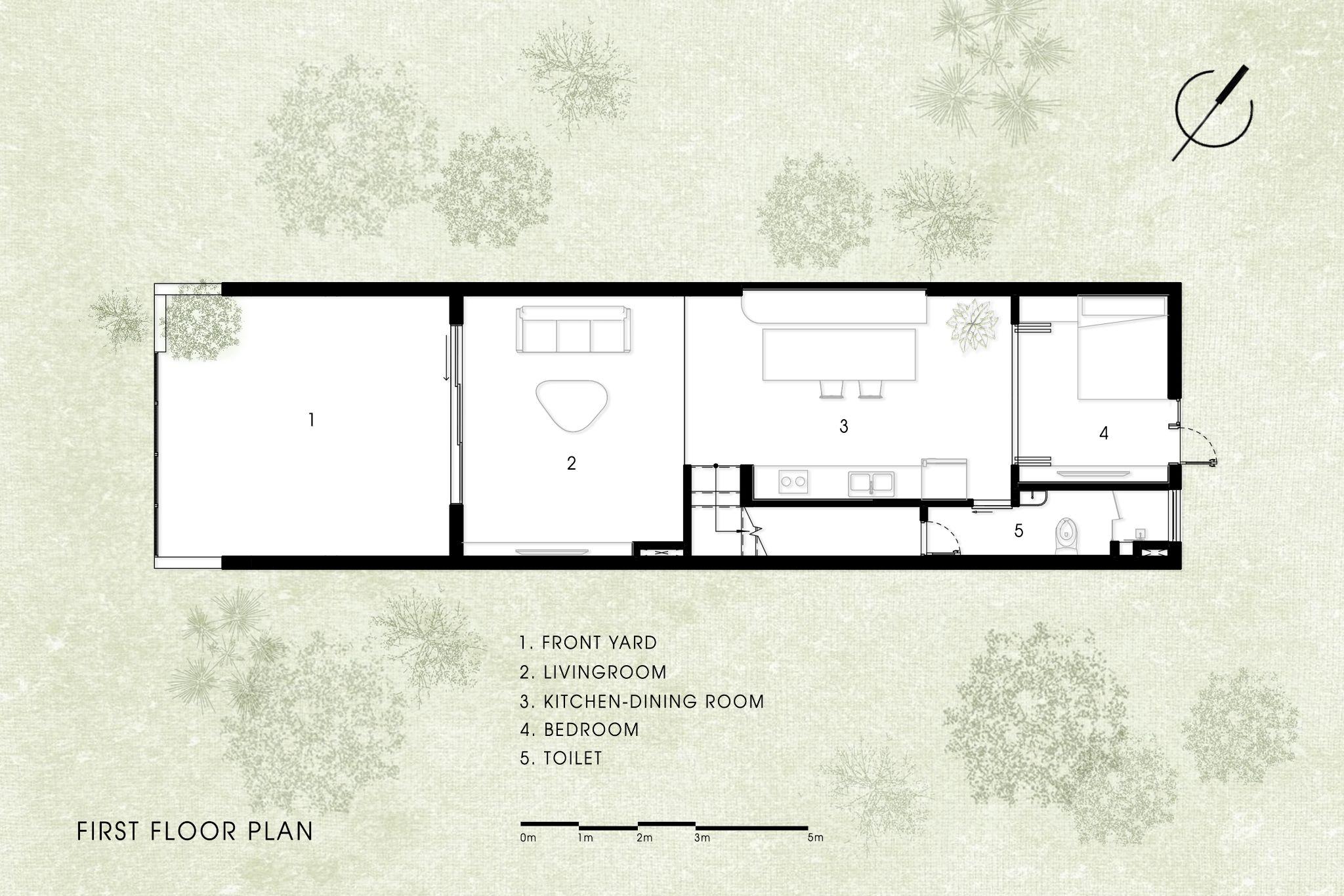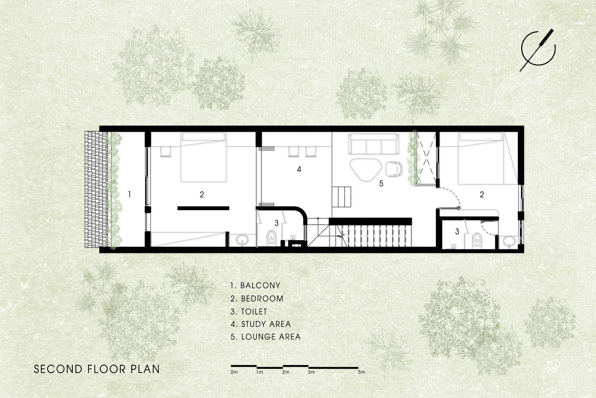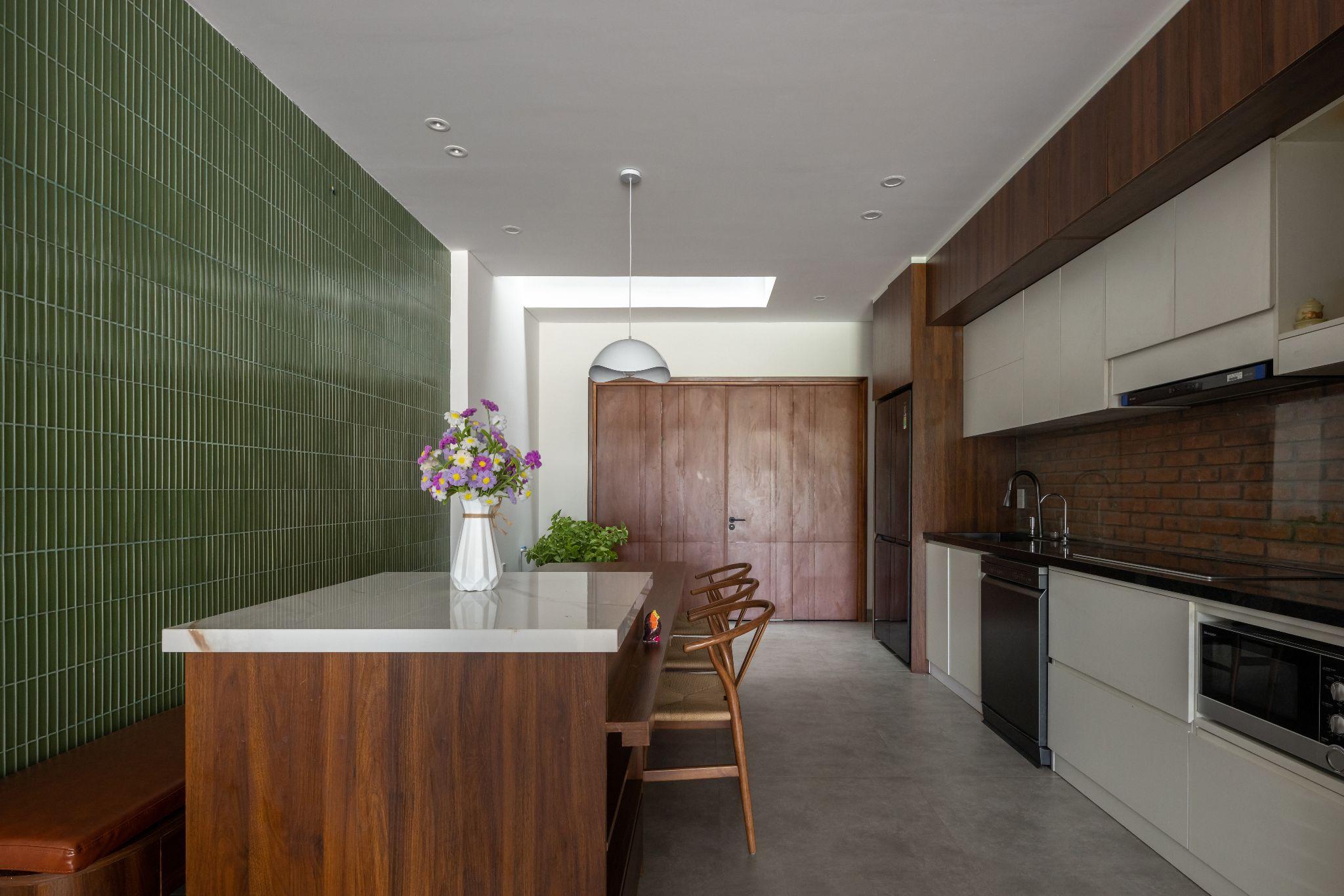 Theo đó, khối nhà ba tầng được cấu trúc bằng sự hòa trộn vật liệu địa phương: gạch đất nung làm chủ đạo cho mặt tiền và vách cầu thang; gạch kính màu được bố trí ngẫu hứng khắp ngôi nhà; mái ngói và gỗ cũ hơn 30 năm được tái sử dụng; trần bê tông thô mộc.