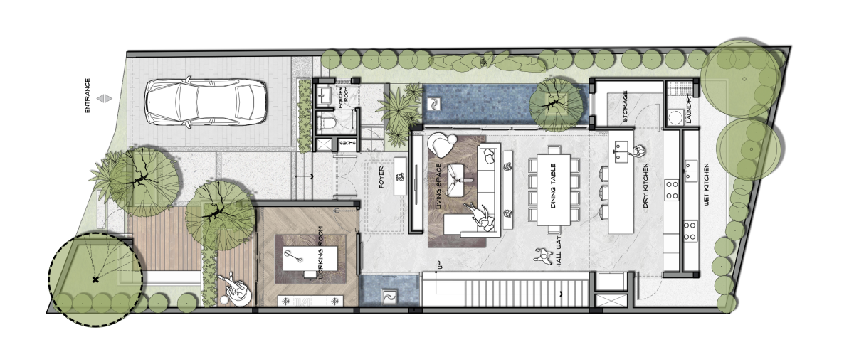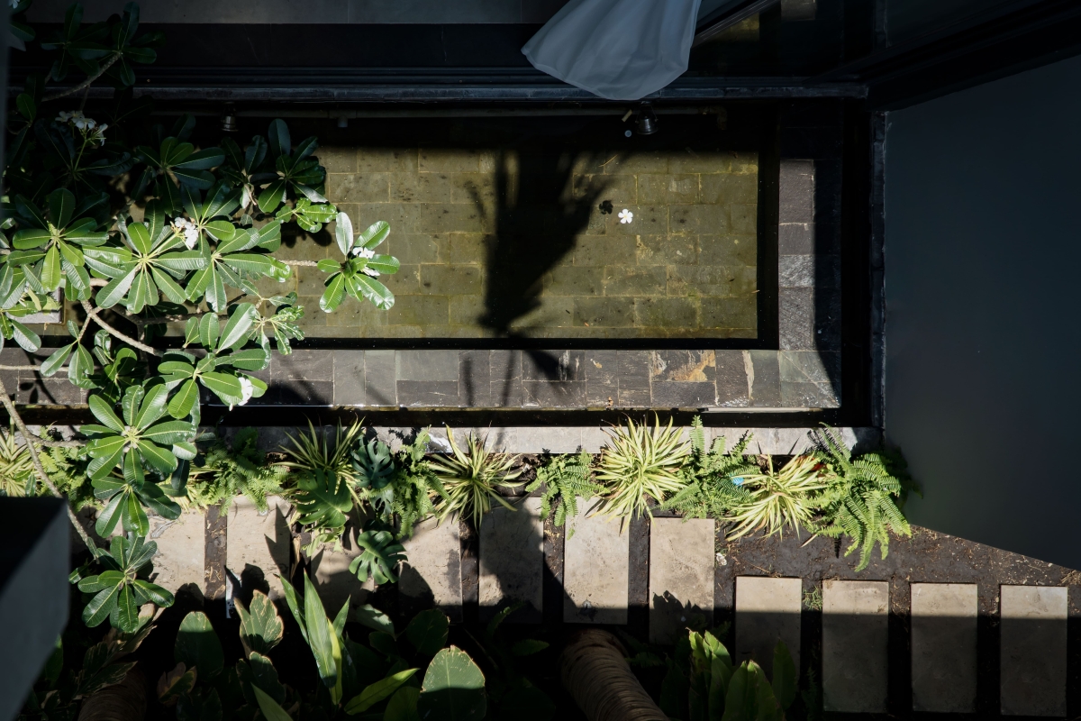 H Villa được thiết kế theo hướng tận dụng tối đa điều kiện tự nhiên sẵn có. Hệ sân trong, mặt nước và cây xanh bản địa được bố trí để tạo đối lưu không khí tự nhiên, giúp làm mát không gian và cải thiện vi khí hậu. Theo định hướng của kiến trúc sư, thiên nhiên không đóng vai trò trang trí mà trở thành một phần cấu trúc của ngôi nhà, góp phần trực tiếp vào chất lượng sống lâu dài của gia chủ.