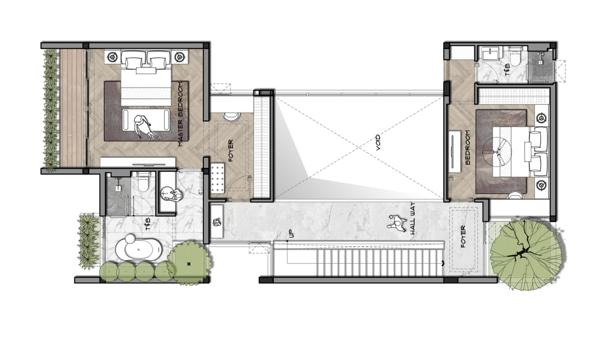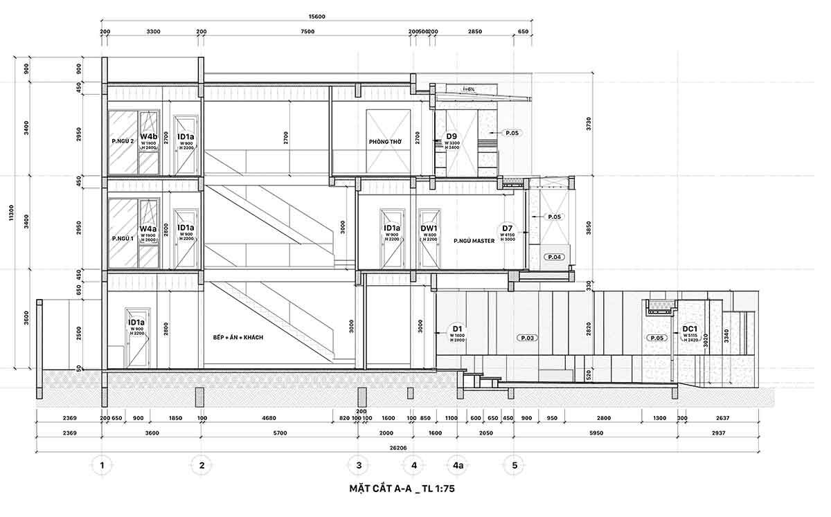 Tầng trệt là không gian sinh hoạt chung với phòng khách – bếp – bàn ăn liên thông, mở rộng ra hiên xanh và sân vườn, tạo sự kết nối tự nhiên giữa các thành viên trong gia đình. Tầng trên là không gian riêng tư gồm phòng ngủ master, phòng ngủ con và phòng làm việc, mỗi phòng đều có ánh sáng và tầm nhìn riêng. Khu thờ được bố trí ở vị trí yên tĩnh, đảm bảo sự trang nghiêm nhưng vẫn thông thoáng.