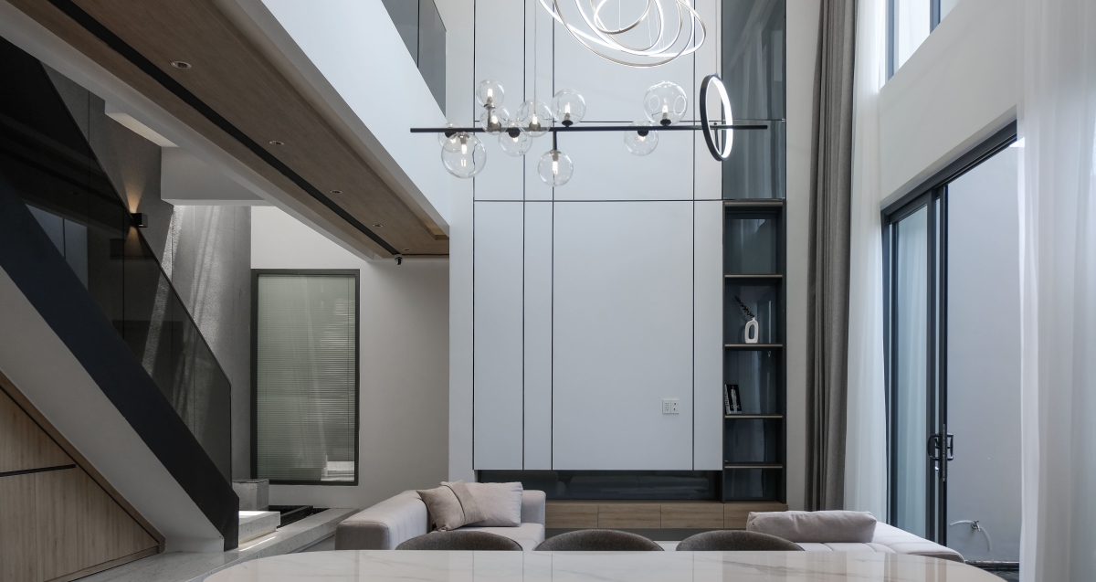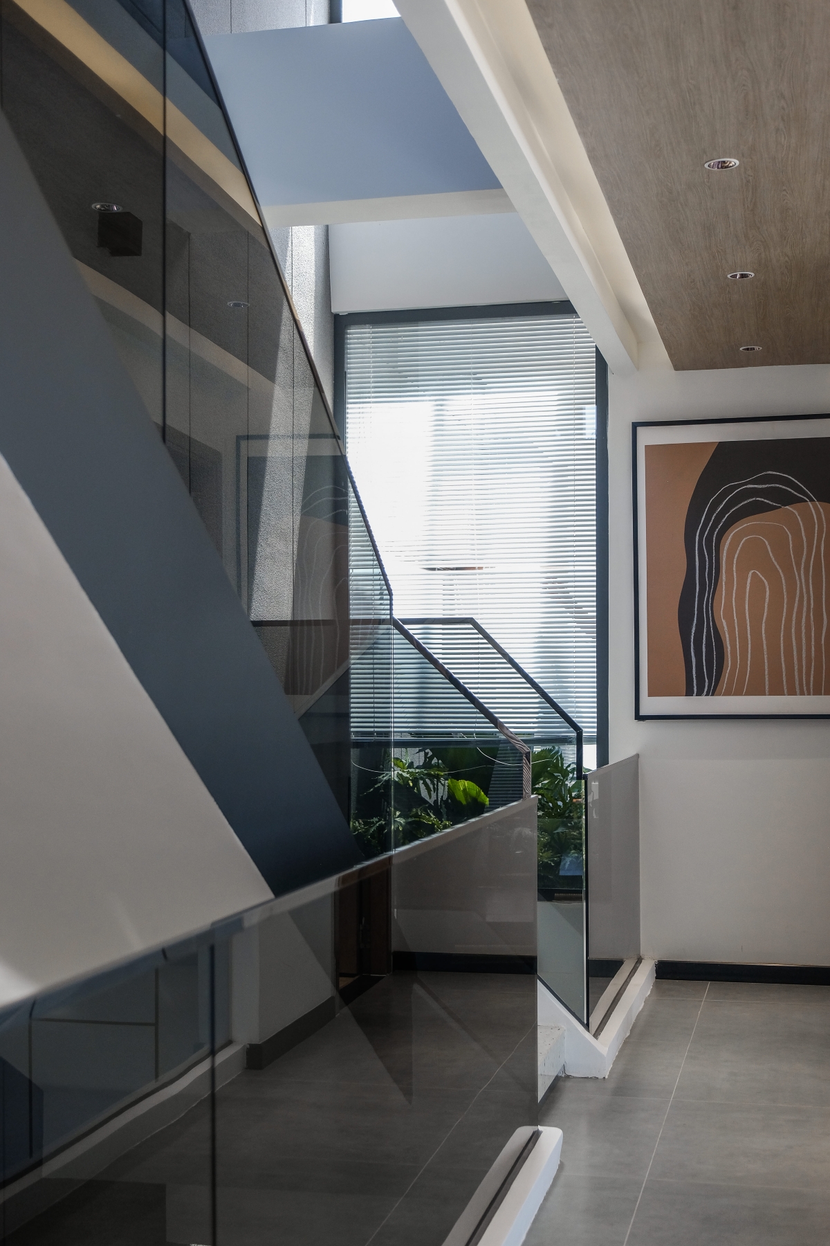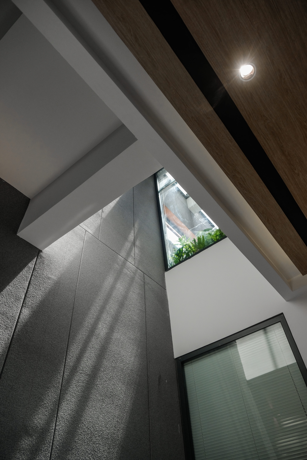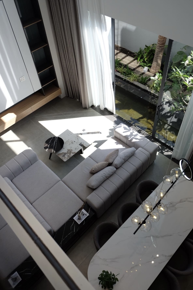 Không gian thông tầng kết hợp giếng trời trung tâm là điểm nhấn quan trọng. Giải pháp này cho phép ánh sáng lan tỏa sâu vào nội thất, đồng thời tạo ra sự biến đổi ánh sáng theo từng thời điểm trong ngày, mang lại cảm giác không gian luôn chuyển động và “thở” cùng thời gian.