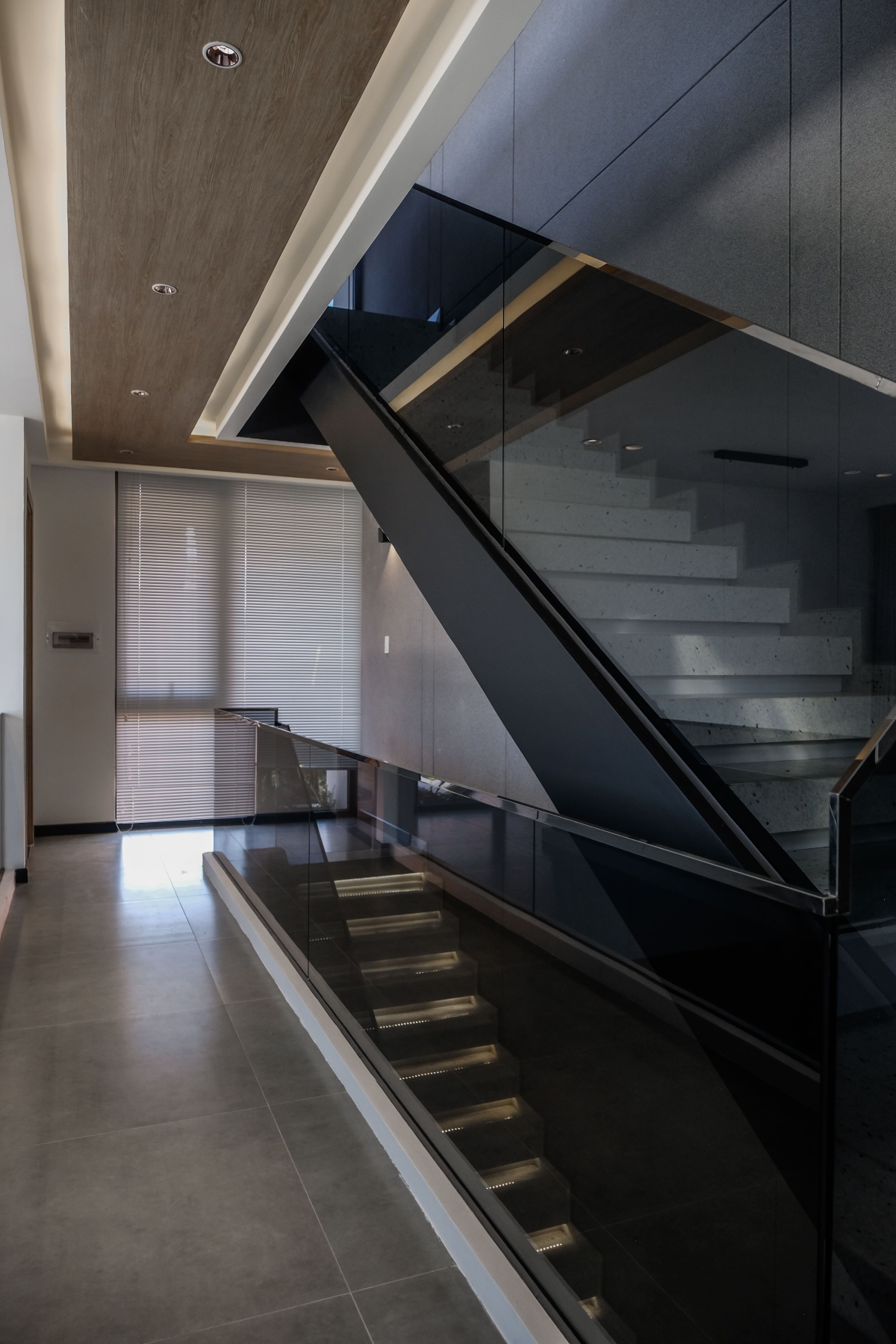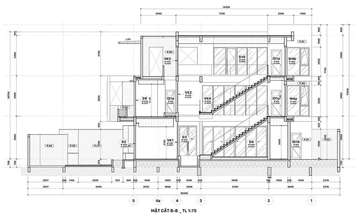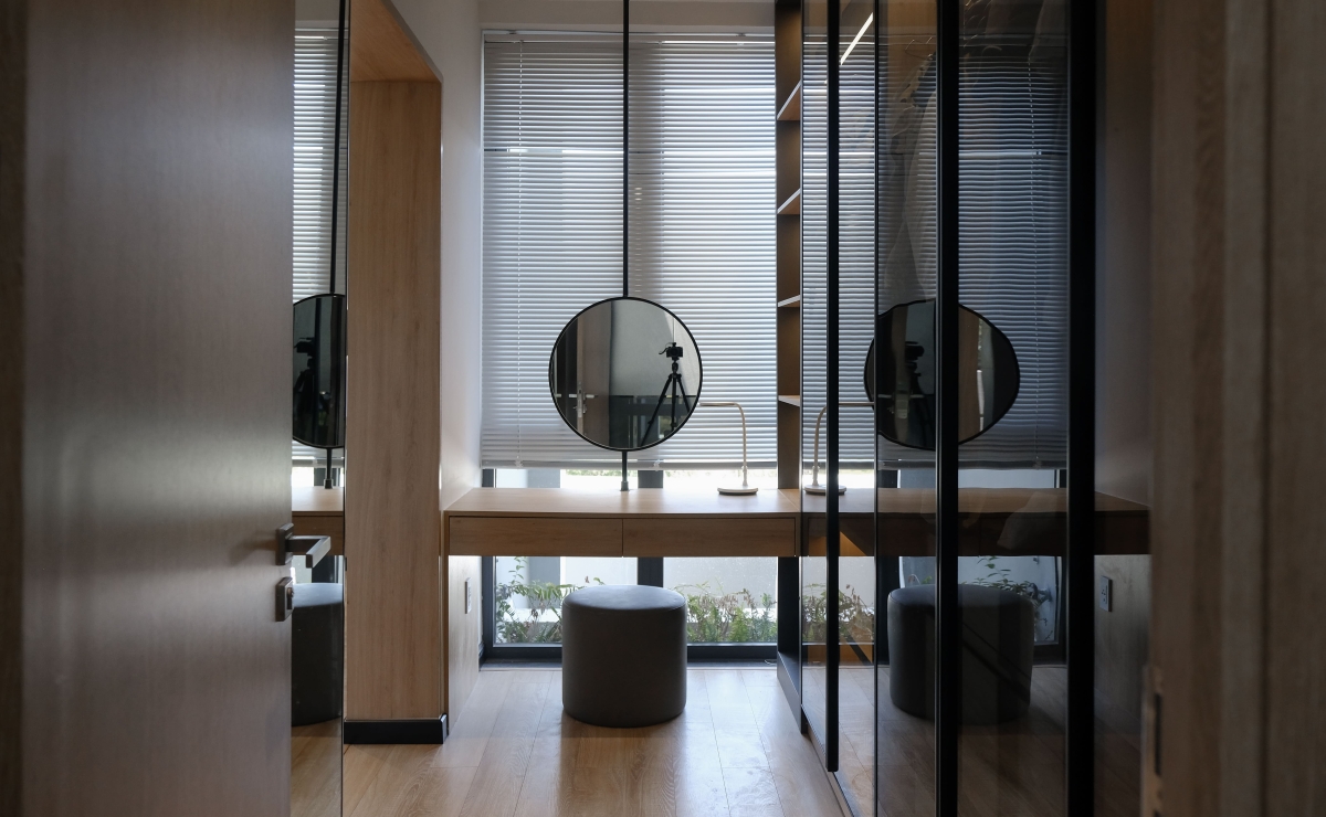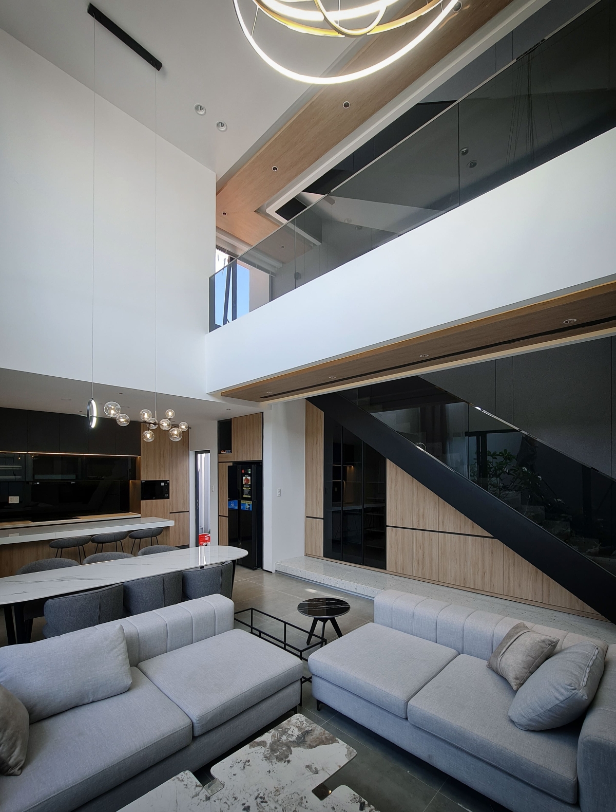 Không gian thông tầng kết hợp giếng trời trung tâm là điểm nhấn quan trọng. Giải pháp này cho phép ánh sáng lan tỏa sâu vào nội thất, đồng thời tạo ra sự biến đổi ánh sáng theo từng thời điểm trong ngày, mang lại cảm giác không gian luôn chuyển động và “thở” cùng thời gian.