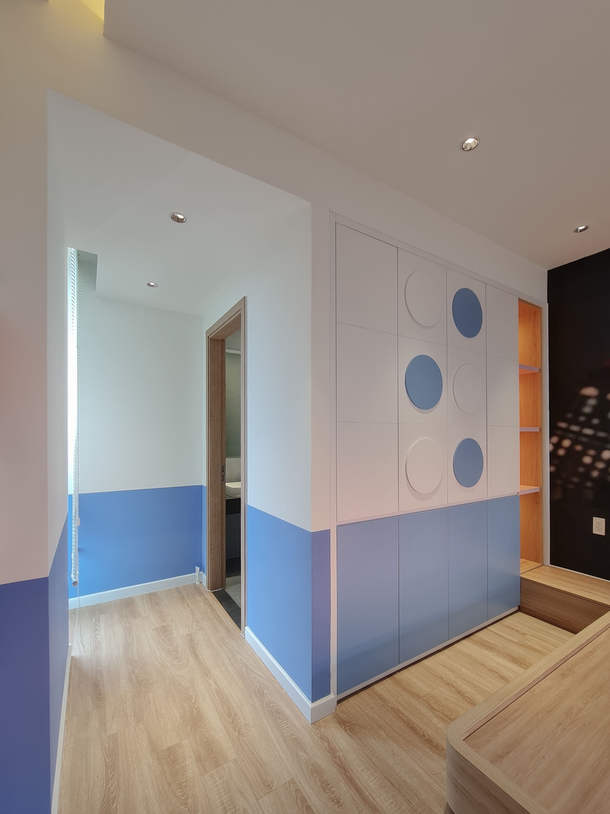 Phòng ngủ trẻ em được thiết kế cá nhân hóa với đồ họa tường sinh động, nội thất tích hợp và ánh sáng tự nhiên, khuyến khích sự sáng tạo và phát triển.