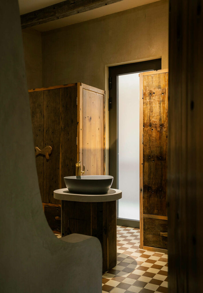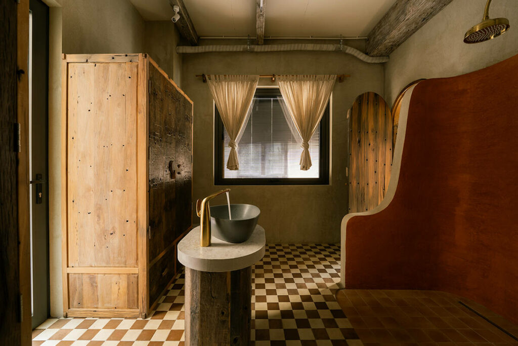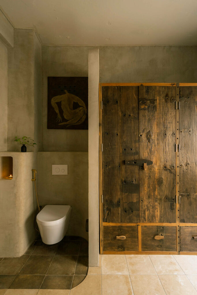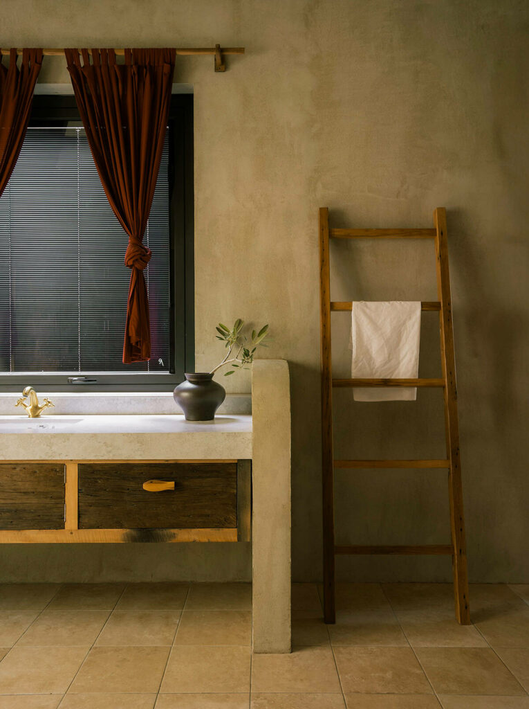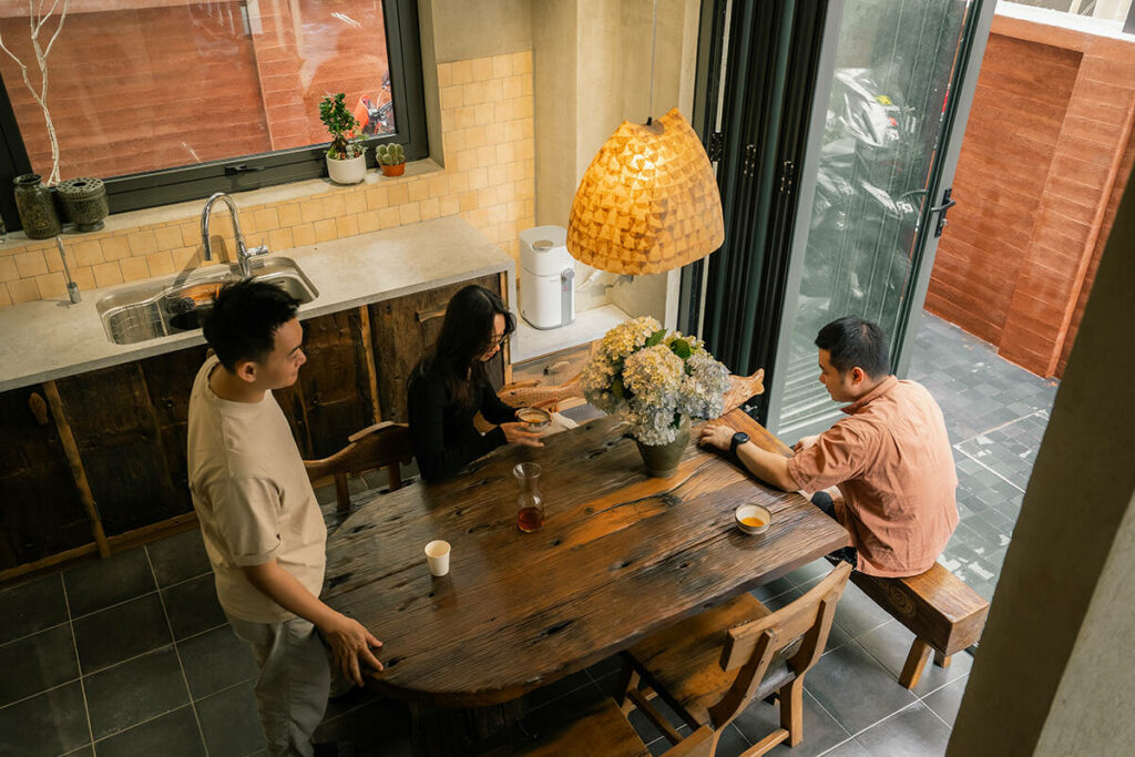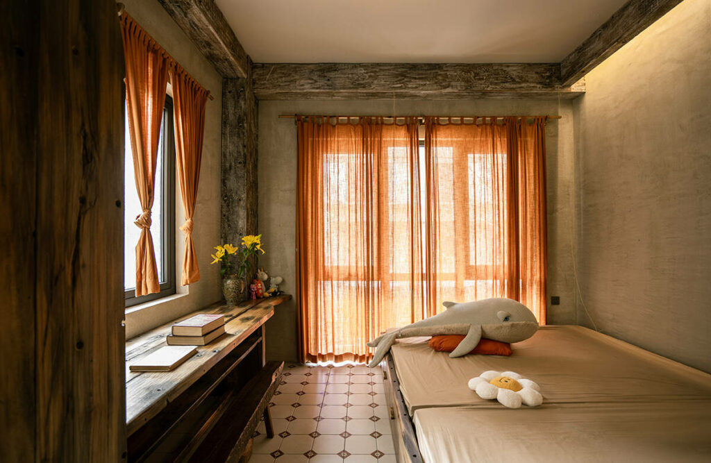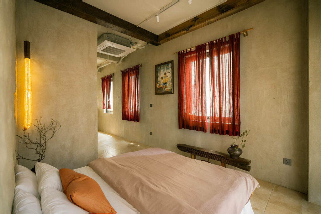 Không dừng lại ở vỏ kiến trúc, phần nội thất tiếp tục kể một chương khác của công trình. Gỗ Táu được tái chế từ những con tàu cũ, trở thành chất liệu chính cho hầu hết vật dụng. Đây vừa là giải pháp “xanh”, mà là sự tái sinh có chủ đích: những vết xước, dấu đinh hay thớ gỗ già đều là một phần của ký ức vật liệu, mang đến chiều sâu lịch sử cho một không gian sống đương đại. Kết hợp cùng vải lanh thủ công nhuộm tự nhiên và ánh sáng hắt từ những chiếc đèn được chế tác riêng, tổng thể nội thất tạo ra một trạng thái xúc cảm ấm cúng và thật sự yên tĩnh.