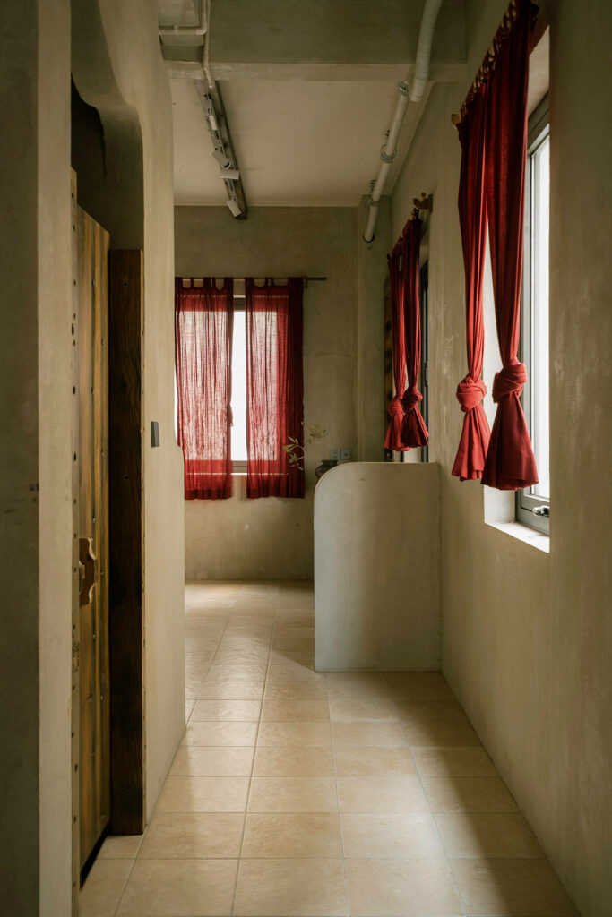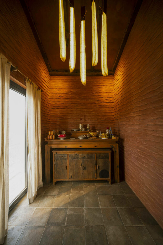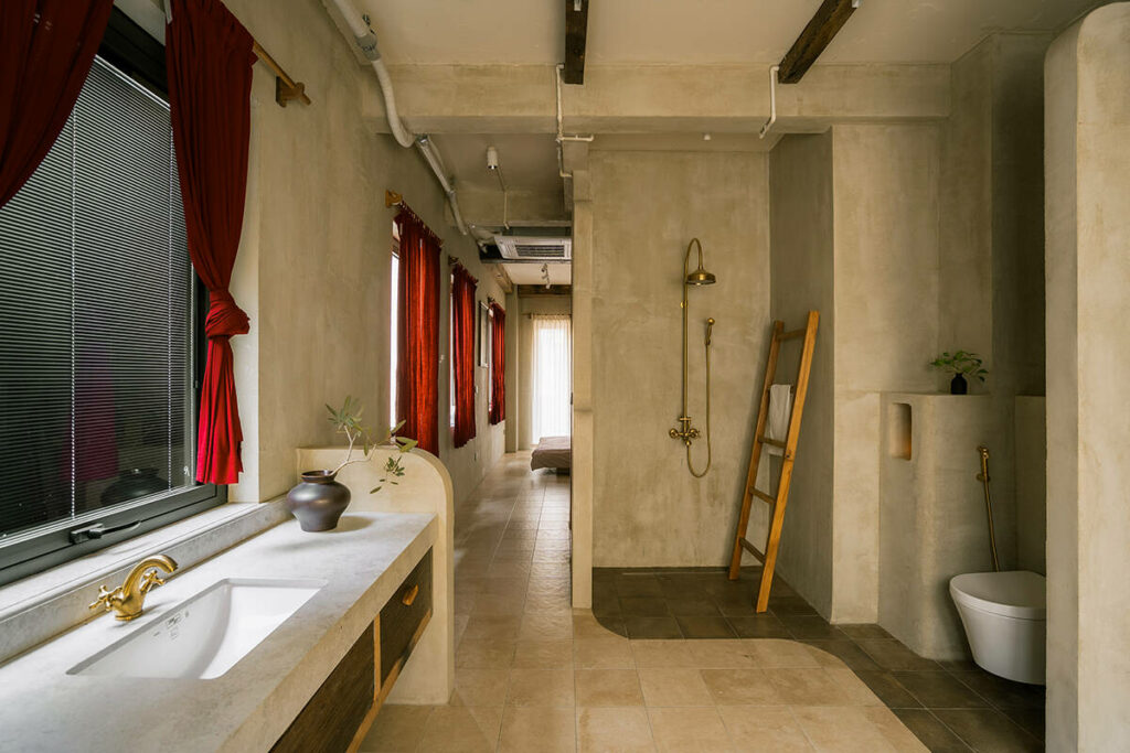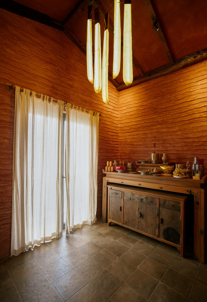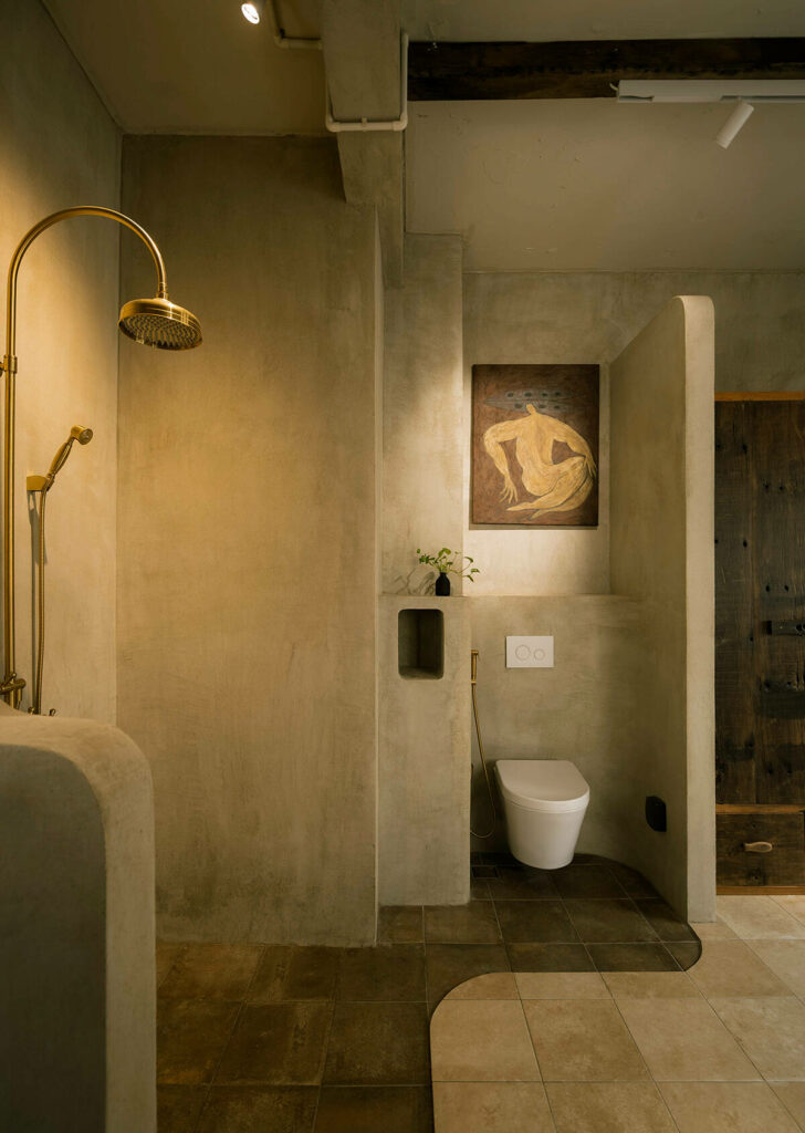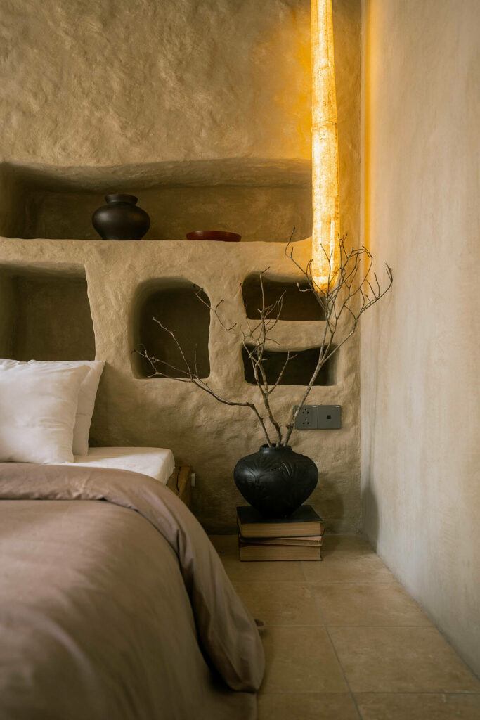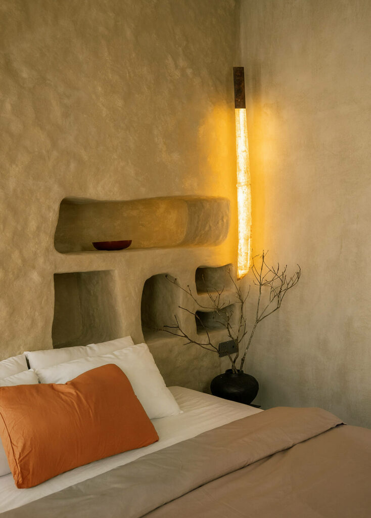 Không dừng lại ở vỏ kiến trúc, phần nội thất tiếp tục kể một chương khác của công trình. Gỗ Táu được tái chế từ những con tàu cũ, trở thành chất liệu chính cho hầu hết vật dụng. Đây vừa là giải pháp “xanh”, mà là sự tái sinh có chủ đích: những vết xước, dấu đinh hay thớ gỗ già đều là một phần của ký ức vật liệu, mang đến chiều sâu lịch sử cho một không gian sống đương đại. Kết hợp cùng vải lanh thủ công nhuộm tự nhiên và ánh sáng hắt từ những chiếc đèn được chế tác riêng, tổng thể nội thất tạo ra một trạng thái xúc cảm ấm cúng và thật sự yên tĩnh.