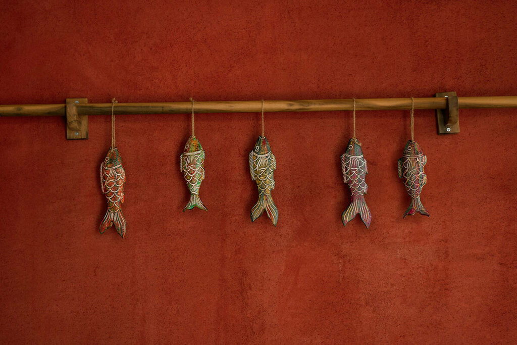 Hình cá lớn, cá nhỏ bằng nhiều loại vật liệu khác nhau được trang trí khắp nơi