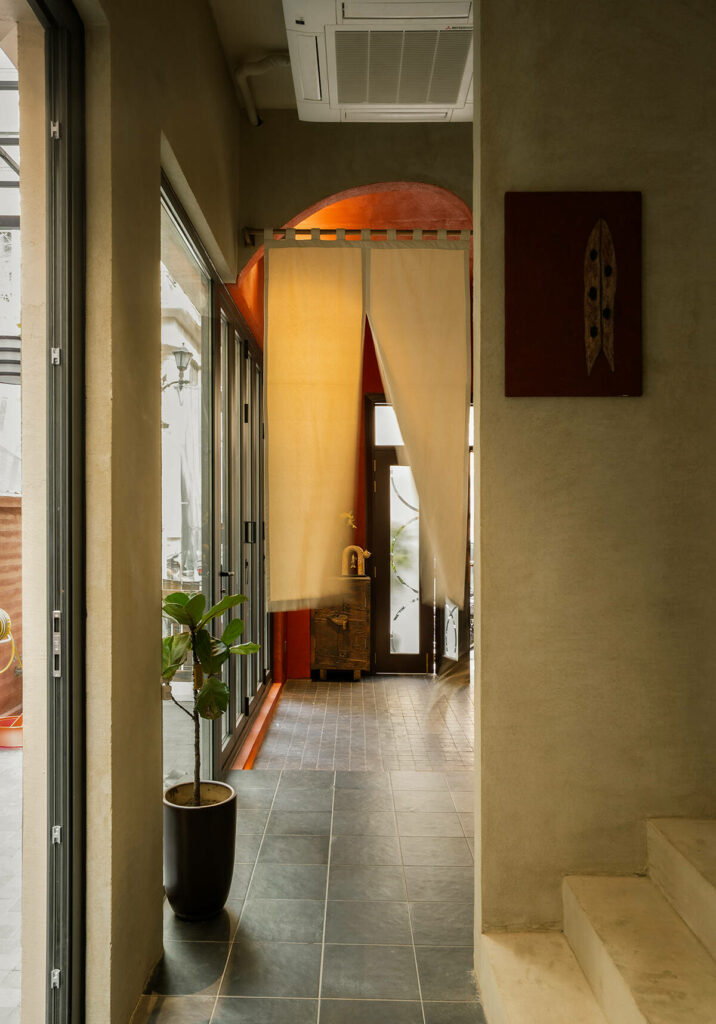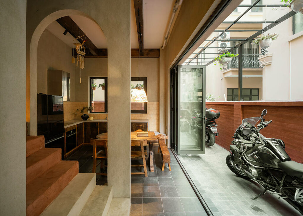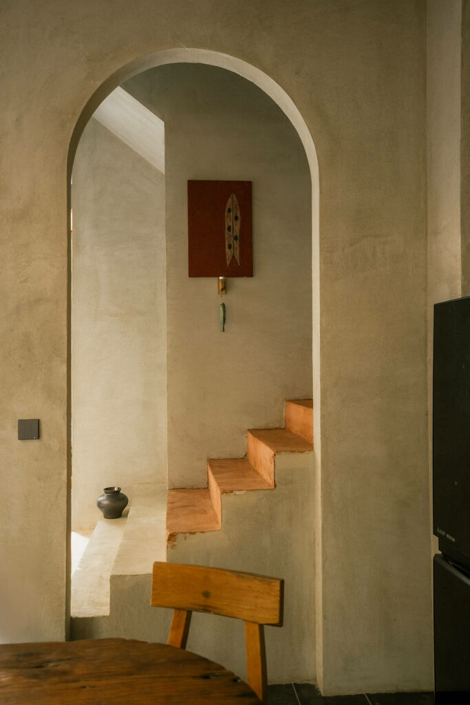 Kiến trúc sư chọn triết lý Wabi-Sabi làm nền tảng cho sự sáng tạo. Thay vì chạy theo sự hoàn hảo, công trình chọn bước đi ngược lại: tôn vinh cái đẹp của sự không hoàn chỉnh, của dấu vết thời gian và cảm giác mộc mạc. Vật liệu thô như gạch trần, vữa hiệu ứng, bê tông không bị che giấu mà được giữ lại nguyên trạng, như một cách để kiến trúc đối thoại trực tiếp với người ở. Điều này không chỉ là một lựa chọn thẩm mỹ, mà còn là một tuyên ngôn về sự bền vững và tính cá nhân hóa trong thiết kế. Ở “Hang Cá”, dấu vết thi công không bị xem là “khiếm khuyết” mà trở thành một phần của câu chuyện.