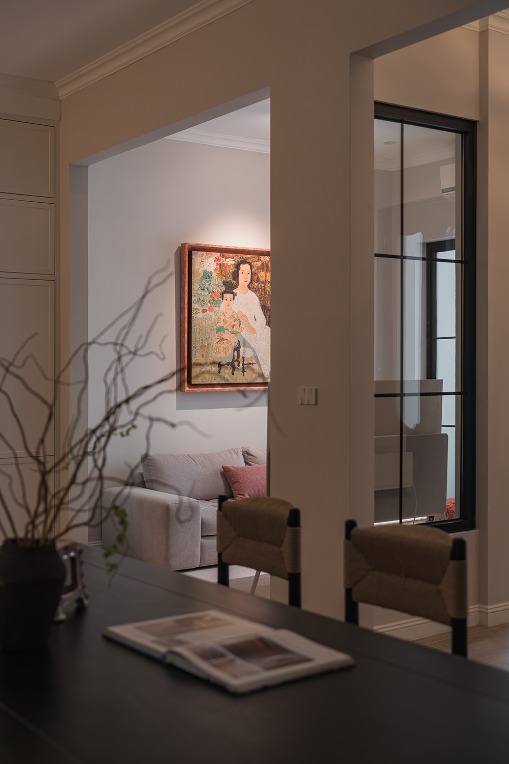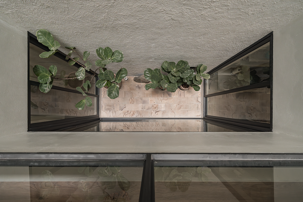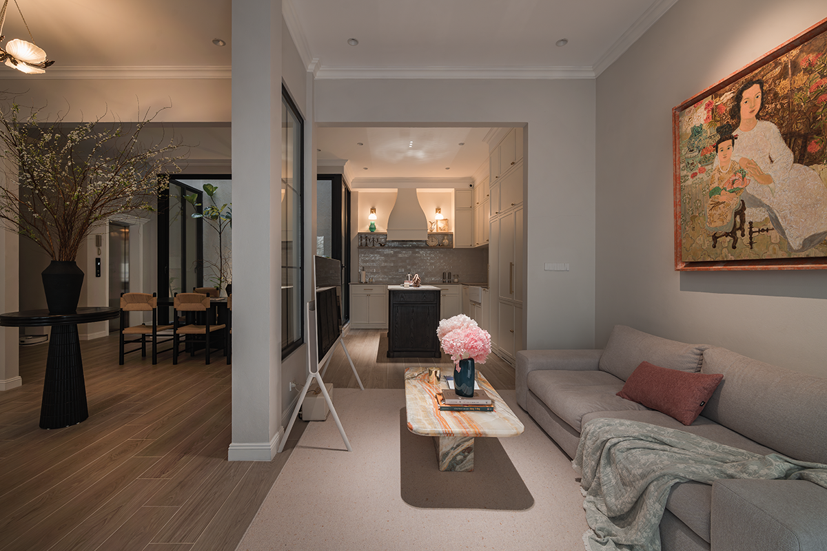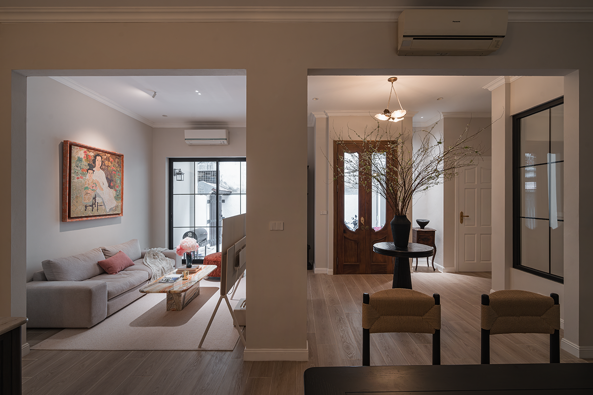 Phòng khách liên thông với bếp và bàn ăn, tạo cảm giác mở rộng. Hệ lưới cột cũ giới hạn về mặt tổ chức không gian nay đã được xử lý bằng cách sử dụng vật liệu và ánh sáng để tăng chiều sâu và độ thoáng. Giếng trời được bố trí ở cuối nhà là điểm nhấn ánh sáng tự nhiên, mang lại cảm giác thư giãn, trái ngược hoàn toàn với hiện trạng cũ. Tầng 1 gồm phòng ngủ cho ông và con gái, khoảng sân phía trước là nơi có thể thư giãn, chăm cây, hoặc đơn giản là hít thở không khí trong lành.