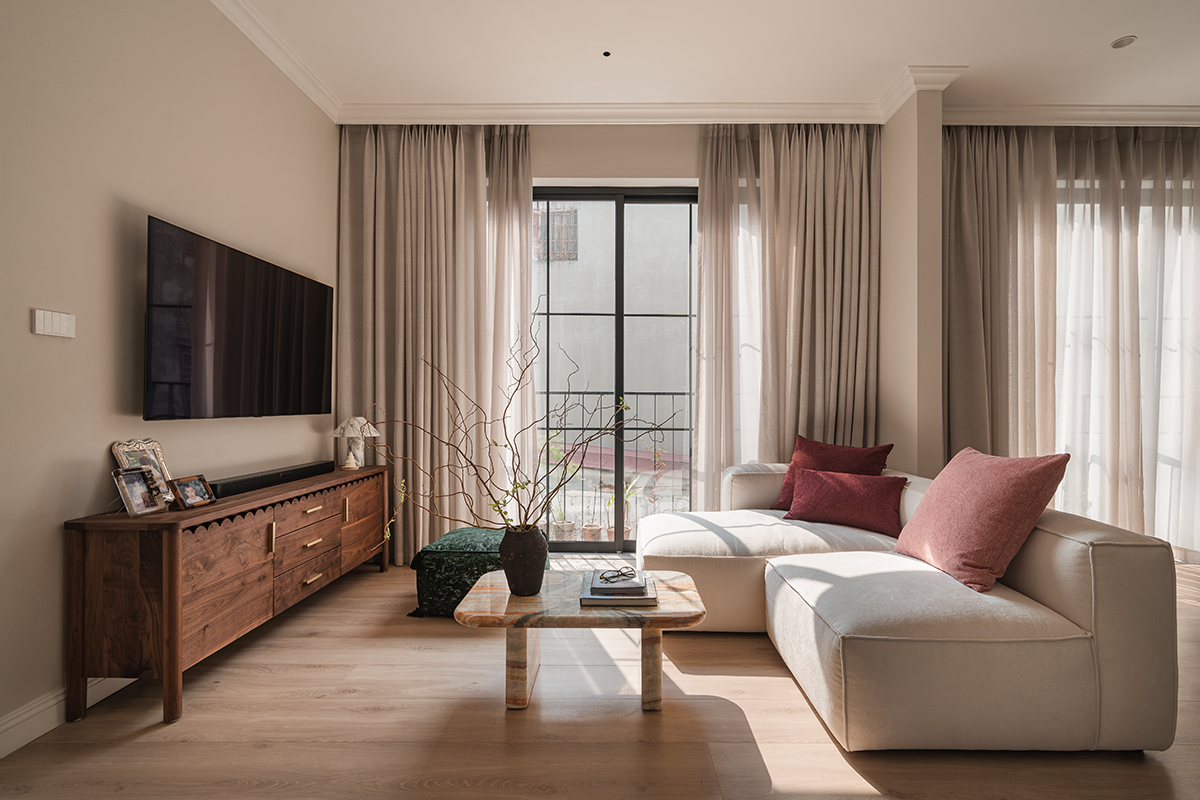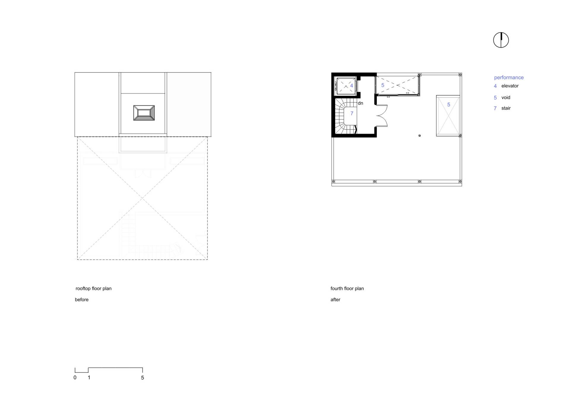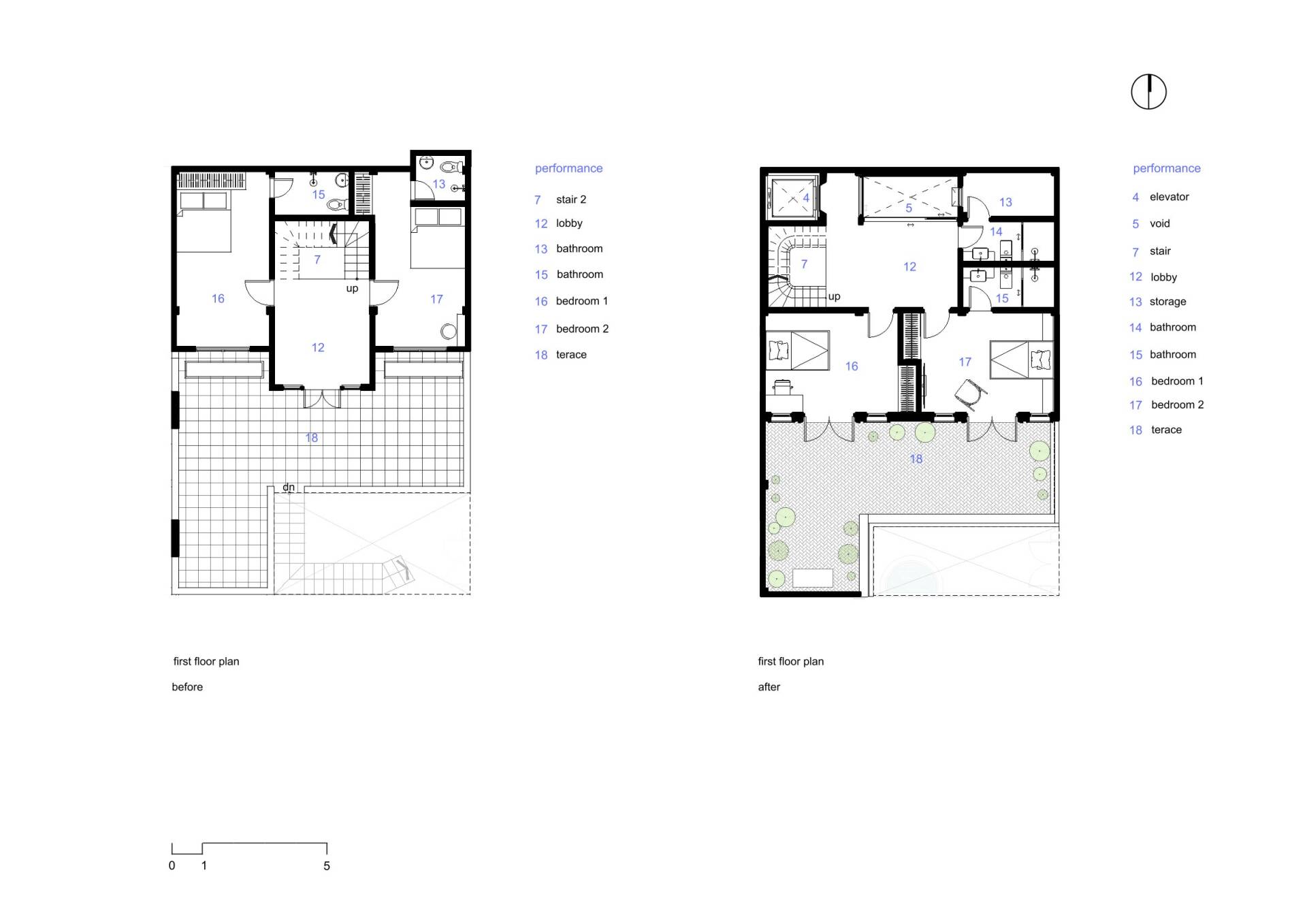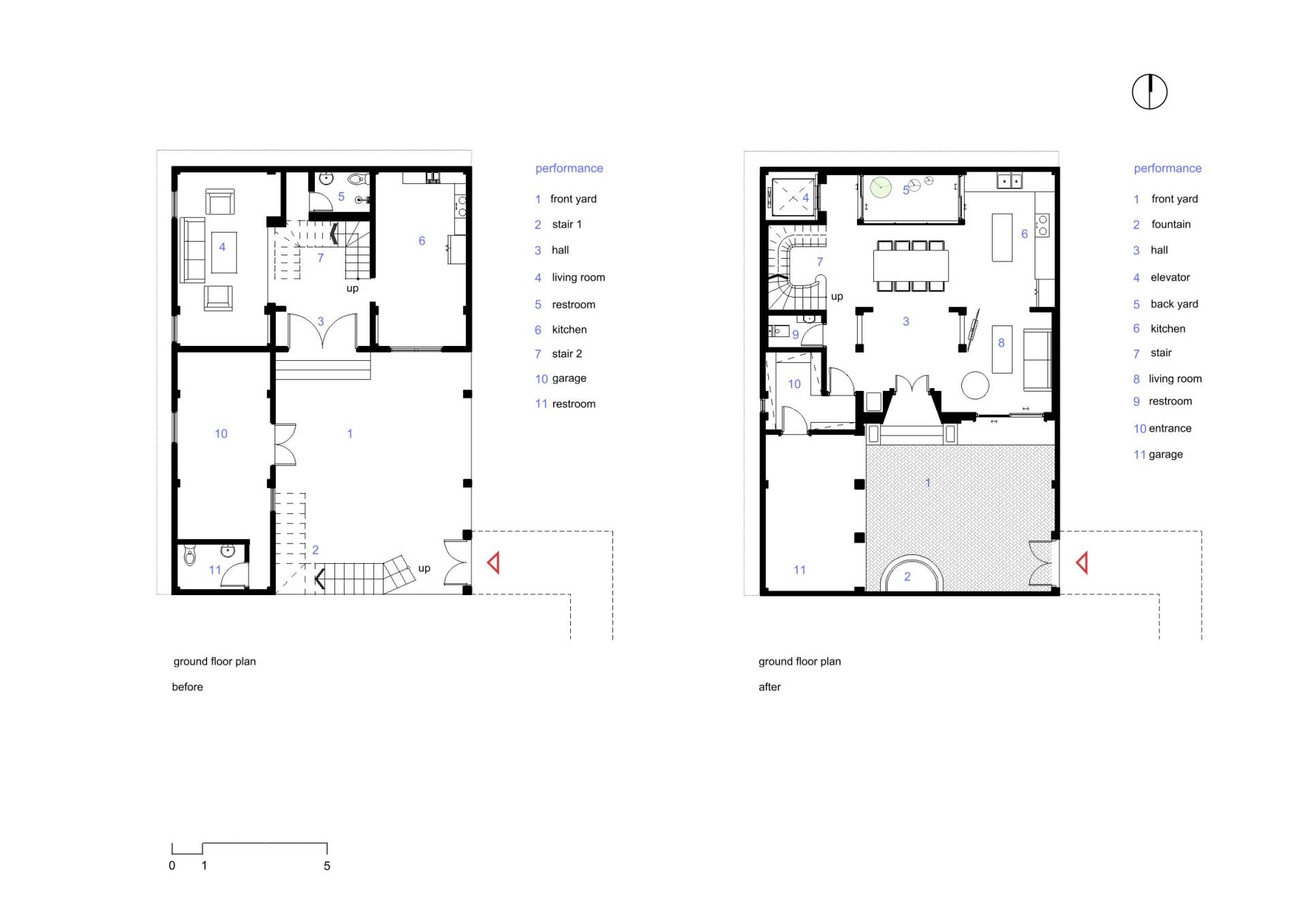 Phòng khách liên thông với bếp và bàn ăn, tạo cảm giác mở rộng. Hệ lưới cột cũ giới hạn về mặt tổ chức không gian nay đã được xử lý bằng cách sử dụng vật liệu và ánh sáng để tăng chiều sâu và độ thoáng. Giếng trời được bố trí ở cuối nhà là điểm nhấn ánh sáng tự nhiên, mang lại cảm giác thư giãn, trái ngược hoàn toàn với hiện trạng cũ. Tầng 1 gồm phòng ngủ cho ông và con gái, khoảng sân phía trước là nơi có thể thư giãn, chăm cây, hoặc đơn giản là hít thở không khí trong lành.