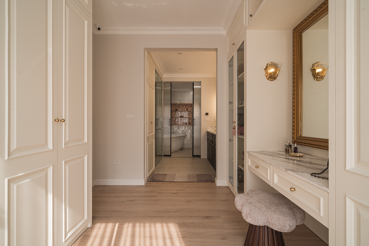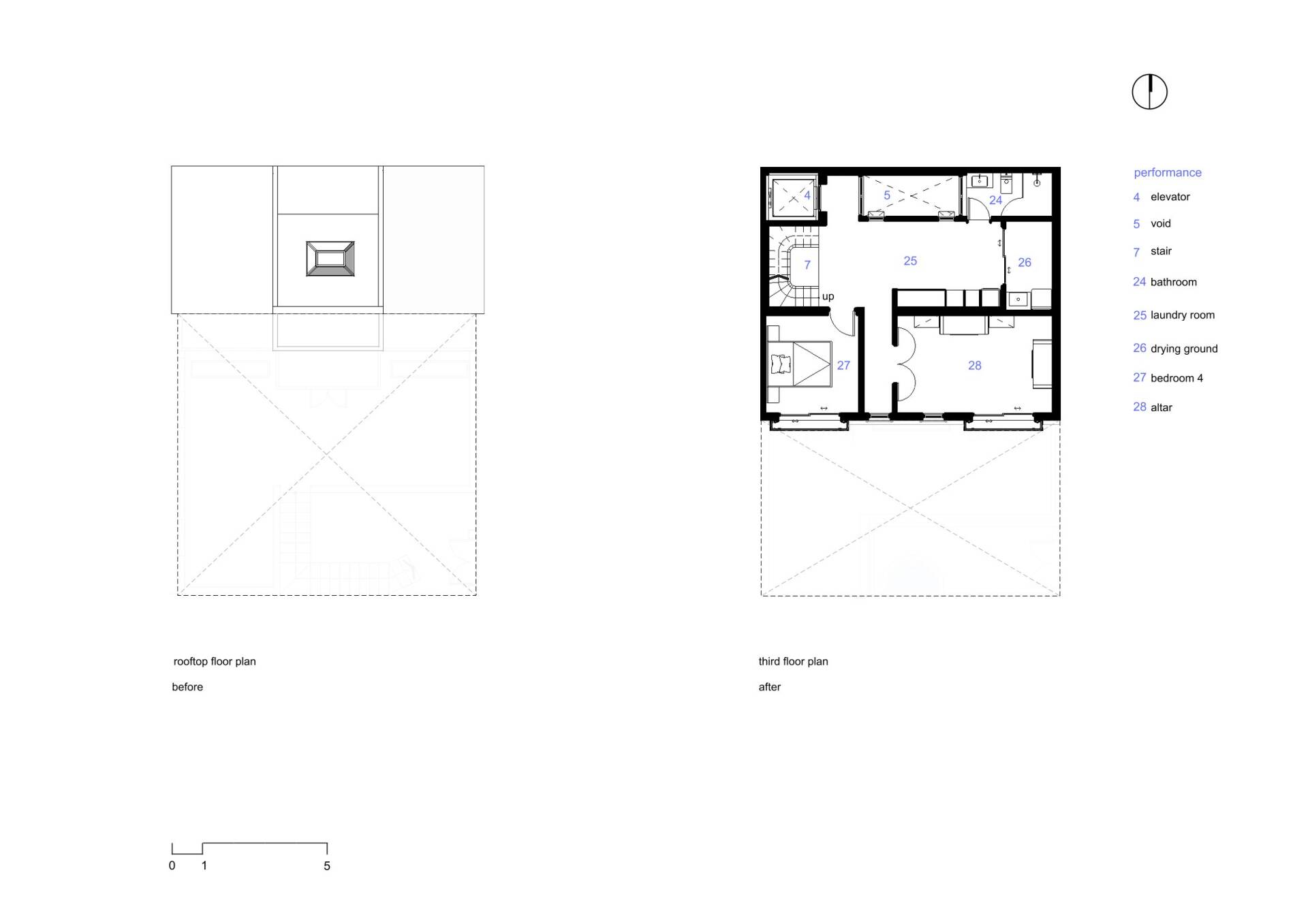 Tầng 2 được tổ chức như một master suite với đầy đủ chức năng: làm việc, ngủ, thay đồ và phòng tắm. Mỗi khu vực đều được tiếp xúc trực tiếp với ánh sáng tự nhiên, nhấn mạnh triết lý “ánh sáng là chất liệu không thể thiếu trong kiến trúc”. Tầng 3 là phòng dành cho khách, phòng giặt và khu thờ. Các không gian được bố trí gọn gàng nhưng vẫn đảm bảo tính riêng tư và tiện nghi.