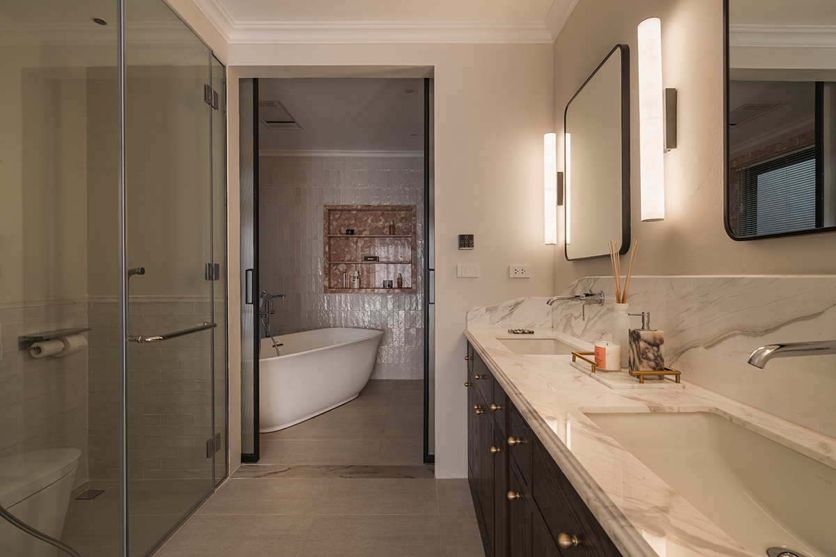 Vì làm việc trong ngành thời trang nên chủ nhà rất tinh tế trong cách chọn lựa vật liệu hoàn thiện. Gạch lát sân, thiết bị vệ sinh, hệ đèn trang trí, màu sơn tường đều là “sân khấu” để thể hiện gu thẩm mỹ và phong cách cá nhân. Điều này đòi hỏi kiến trúc sư không chỉ thiết kế tốt về công năng mà còn có sự đồng điệu với khách hàng ở mặt cảm xúc thẩm mỹ.