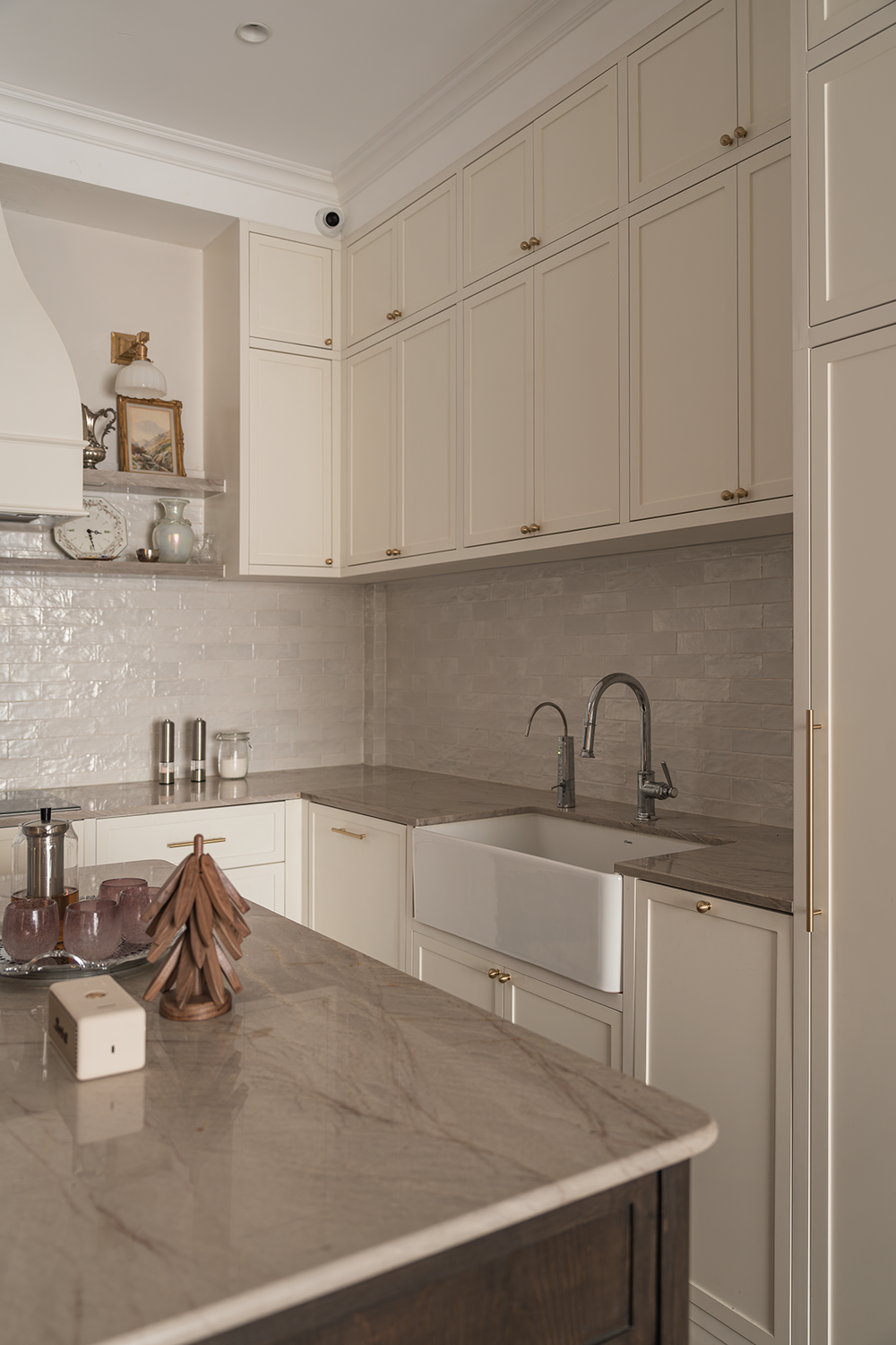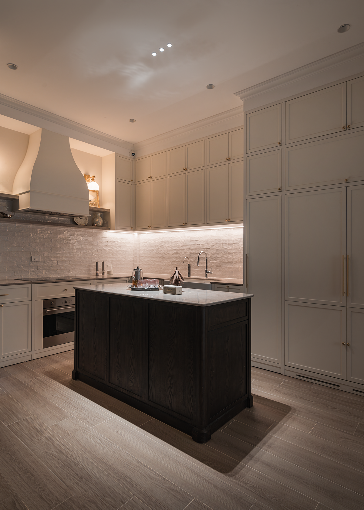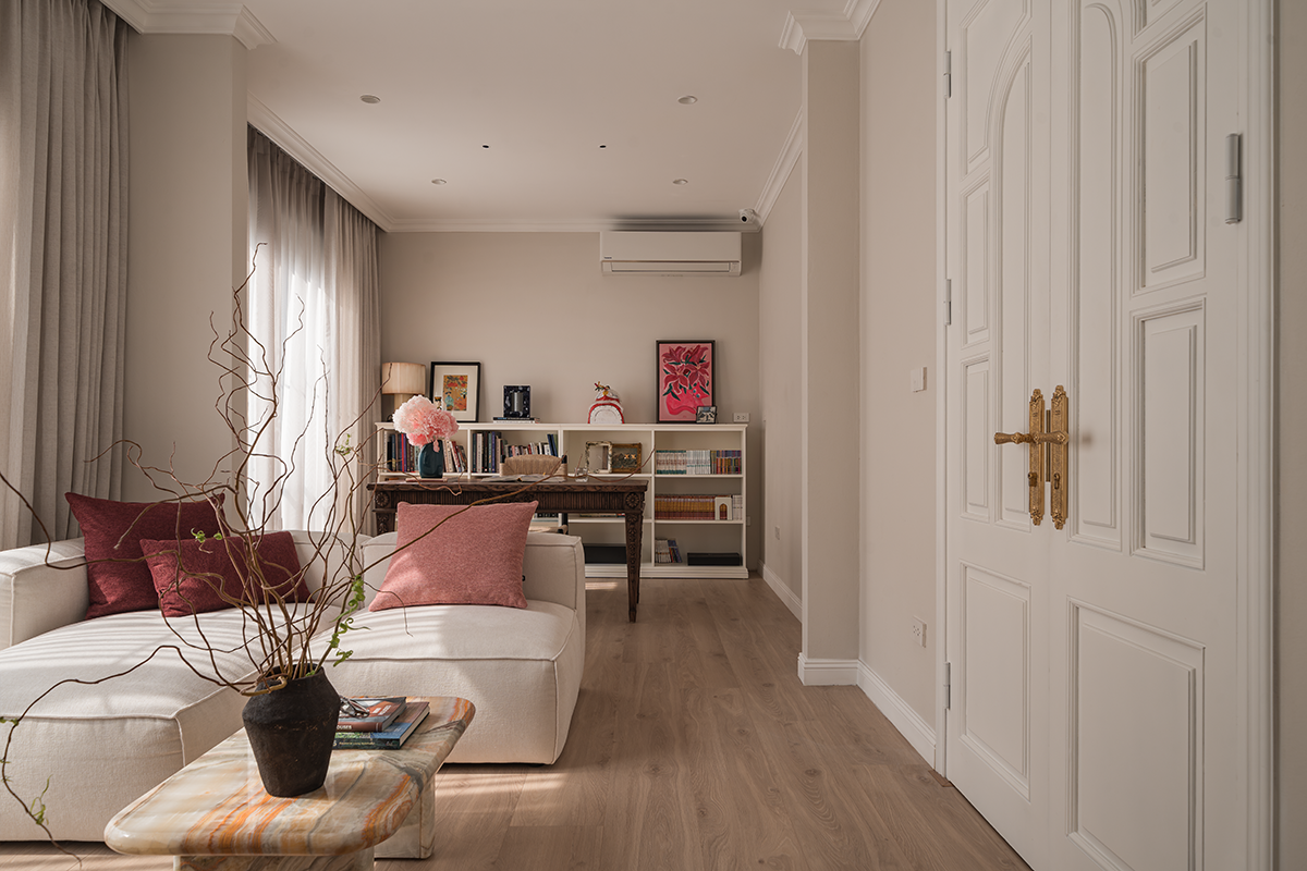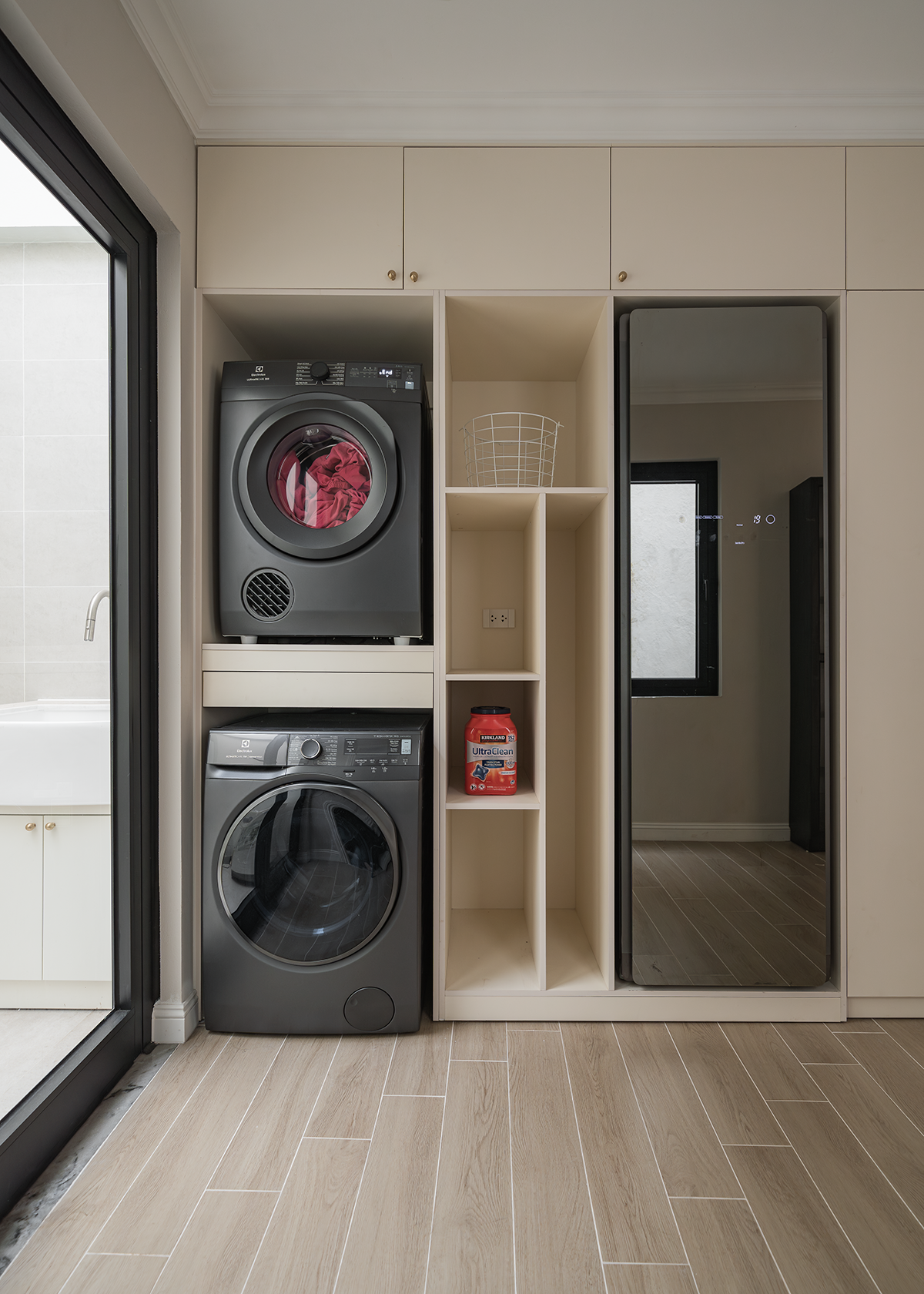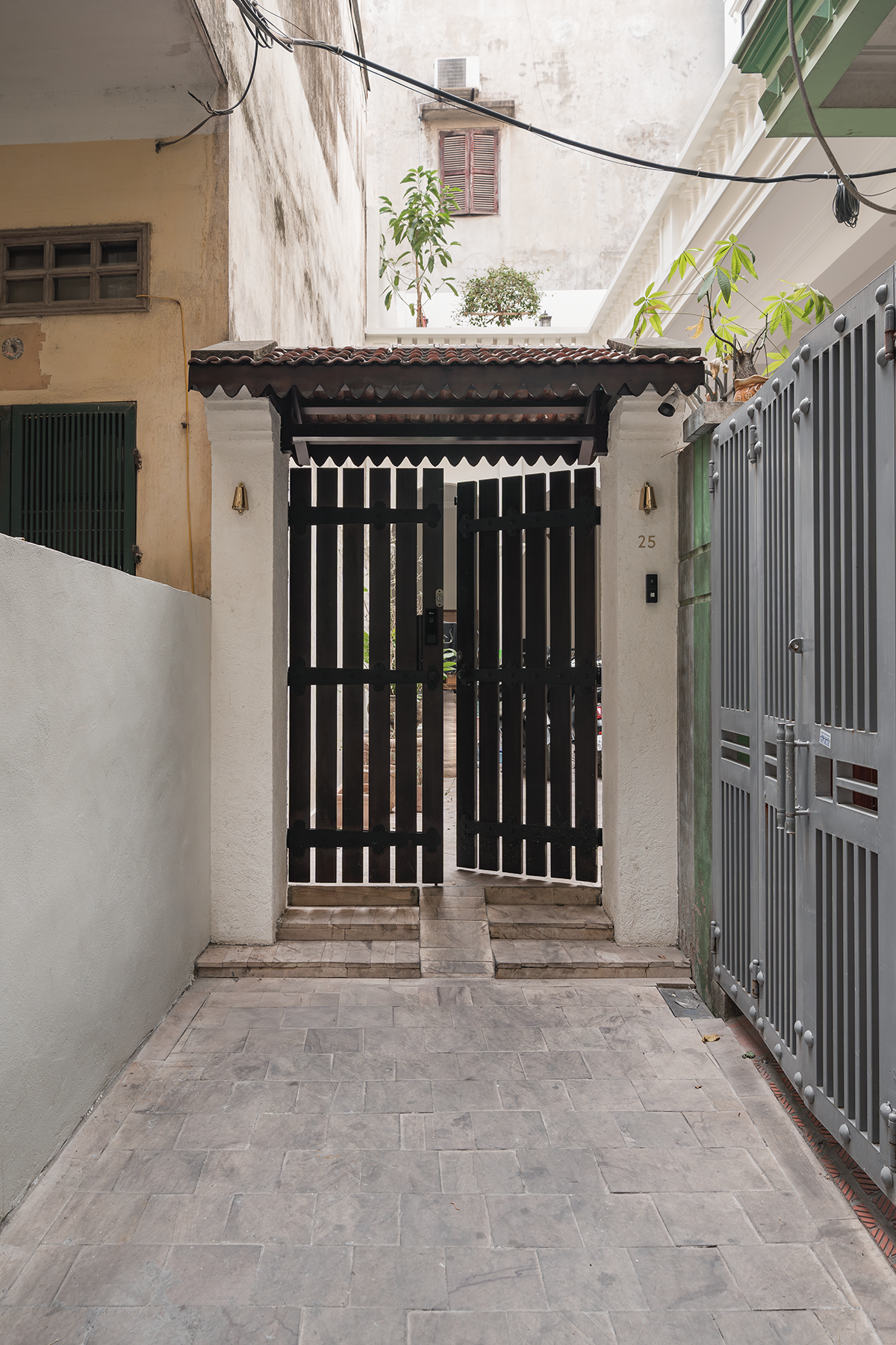 Tầng trệt được xem là tầng giao tiếp chính, vừa là nơi tiếp khách vừa là không gian sinh hoạt chung. Lấy lợi thế khoảng sân rộng rãi, nhóm thiết kế tạo ra nhiều hơn một lối vào, tựa như cho các công trình “biệt thự” chứ không phải “nhà ống truyền thống”. Khách có thể đi từ sảnh chính, còn gia chủ thì đi từ gara, qua không gian đệm gồm phòng thay giày, restroom, tạo nên một chu trình sinh hoạt rõ ràng, thuận tiện, sạch sẽ và riêng tư.