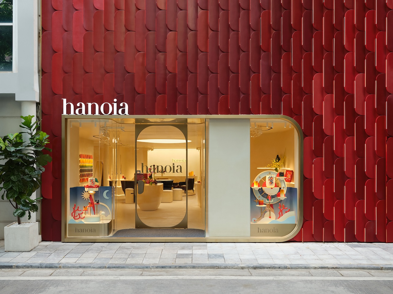Điểm nhấn ấn tượng nhất của công trình là cấu trúc trần phát sáng “lơ lửng”, tạo ra bầu không khí chiêm nghiệm và tĩnh tại. Từ phía ngoài phố, mặt tiền là sự kết hợp độc đáo giữa kính trong suốt và những mảng sơn mài đỏ sẫm biểu tượng. Khi đêm xuống, hệ thống ánh sáng làm sống dậy chiều sâu của vật liệu sơn mài qua những chuyển động của bóng đổ, biến Hanoia Press Club thành một biểu tượng mới của kiến trúc bán lẻ – nơi thủ công truyền thống hòa quyện hoàn hảo với hơi thở hiện đại.