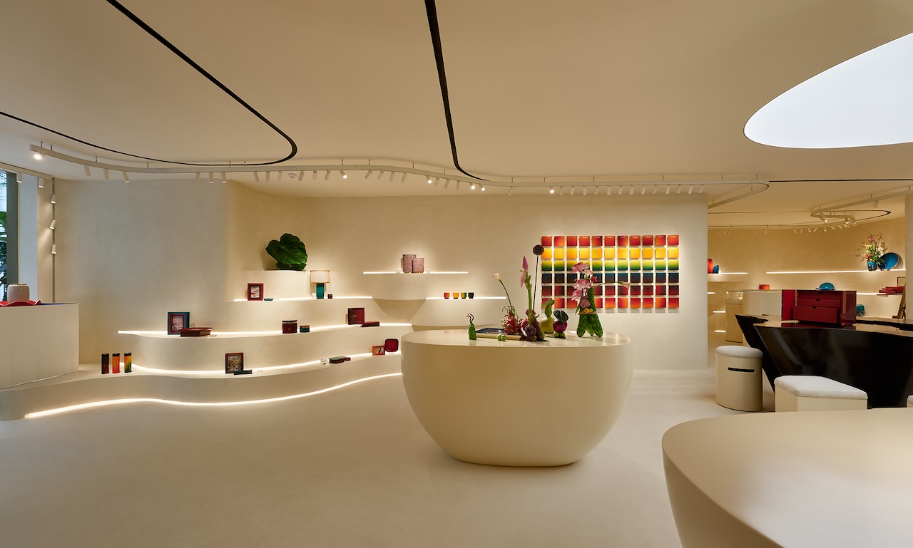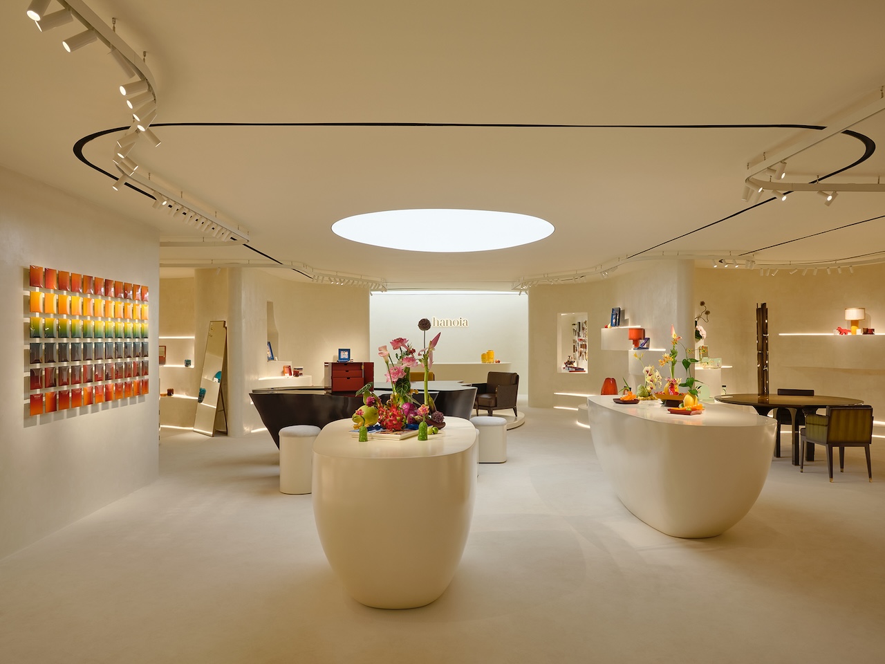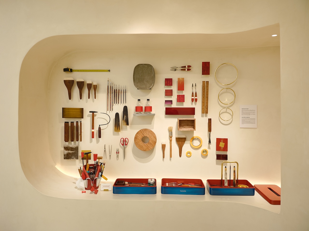 Giá trị cốt lõi của không gian nằm ở sự liên tục và mềm mại. Thay cho những vách ngăn cứng nhắc, kiến trúc sư đã tạo ra một địa hình uốn lượn với các bục trưng bày giật cấp nhẹ nhàng vươn lên từ mặt sàn. Toàn bộ sàn, trần và kệ trưng bày đều mang gam màu trung tính, tạo nên một phông nền tĩnh lặng để tôn vinh tối đa các tác phẩm thủ công. Những hốc tường được tạo hình điêu khắc khéo léo, dẫn dắt khách tham quan vào một hành trình dạo bước tự nhiên, nơi mỗi sản phẩm đều kể một câu chuyện riêng biệt.