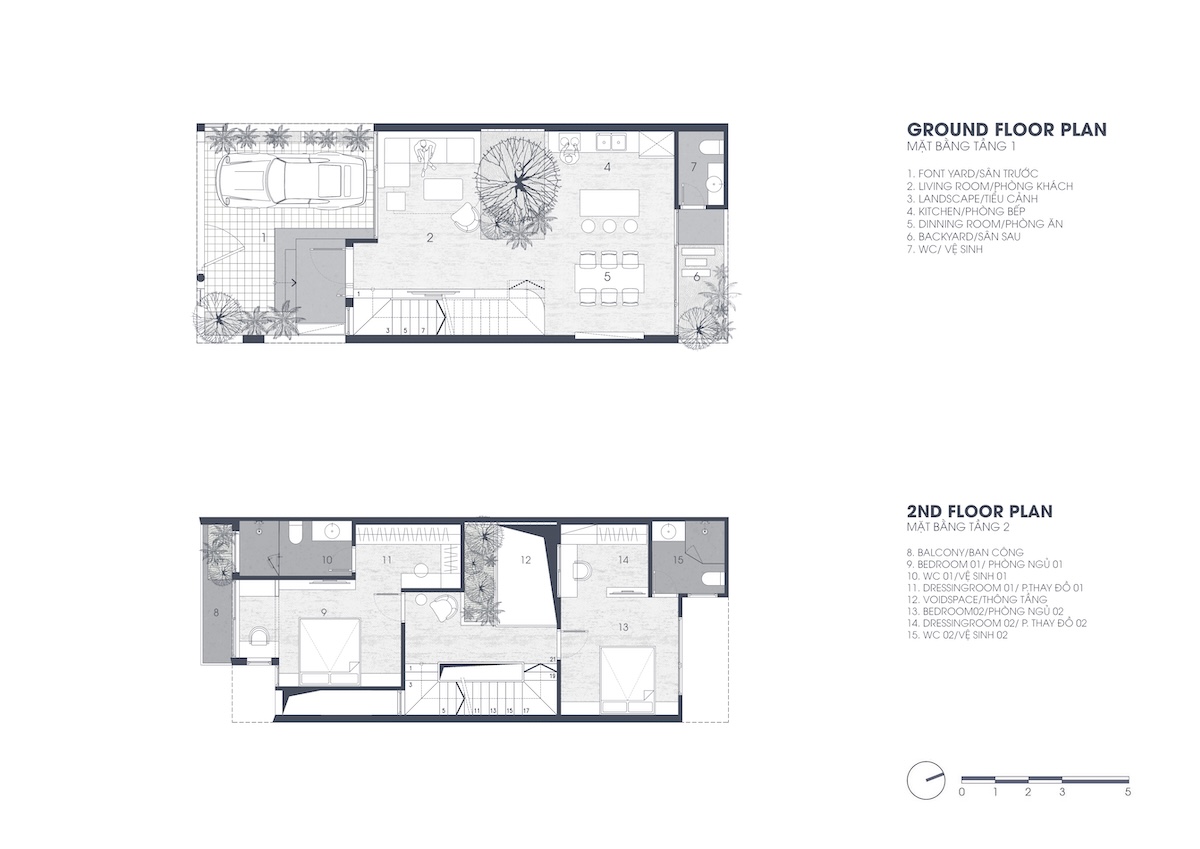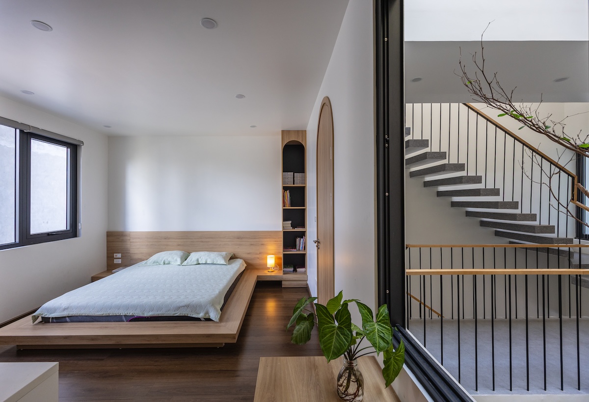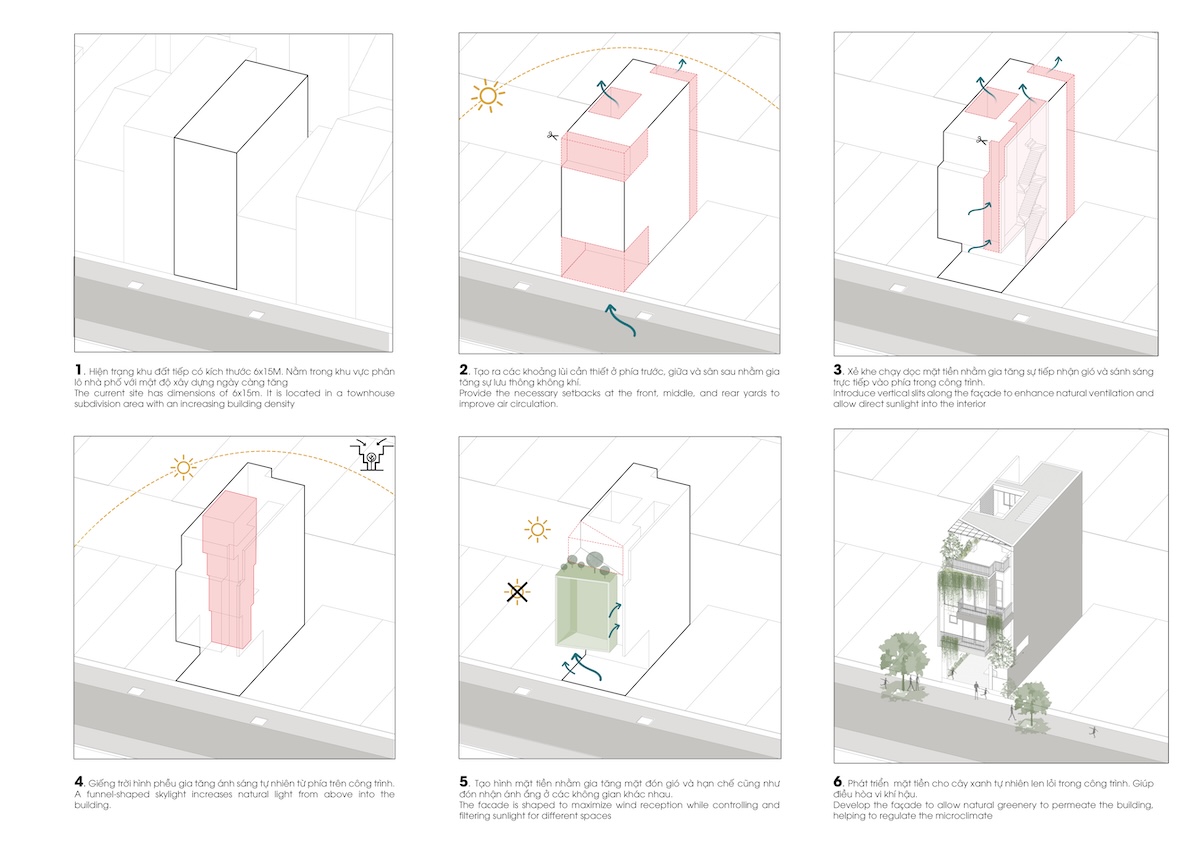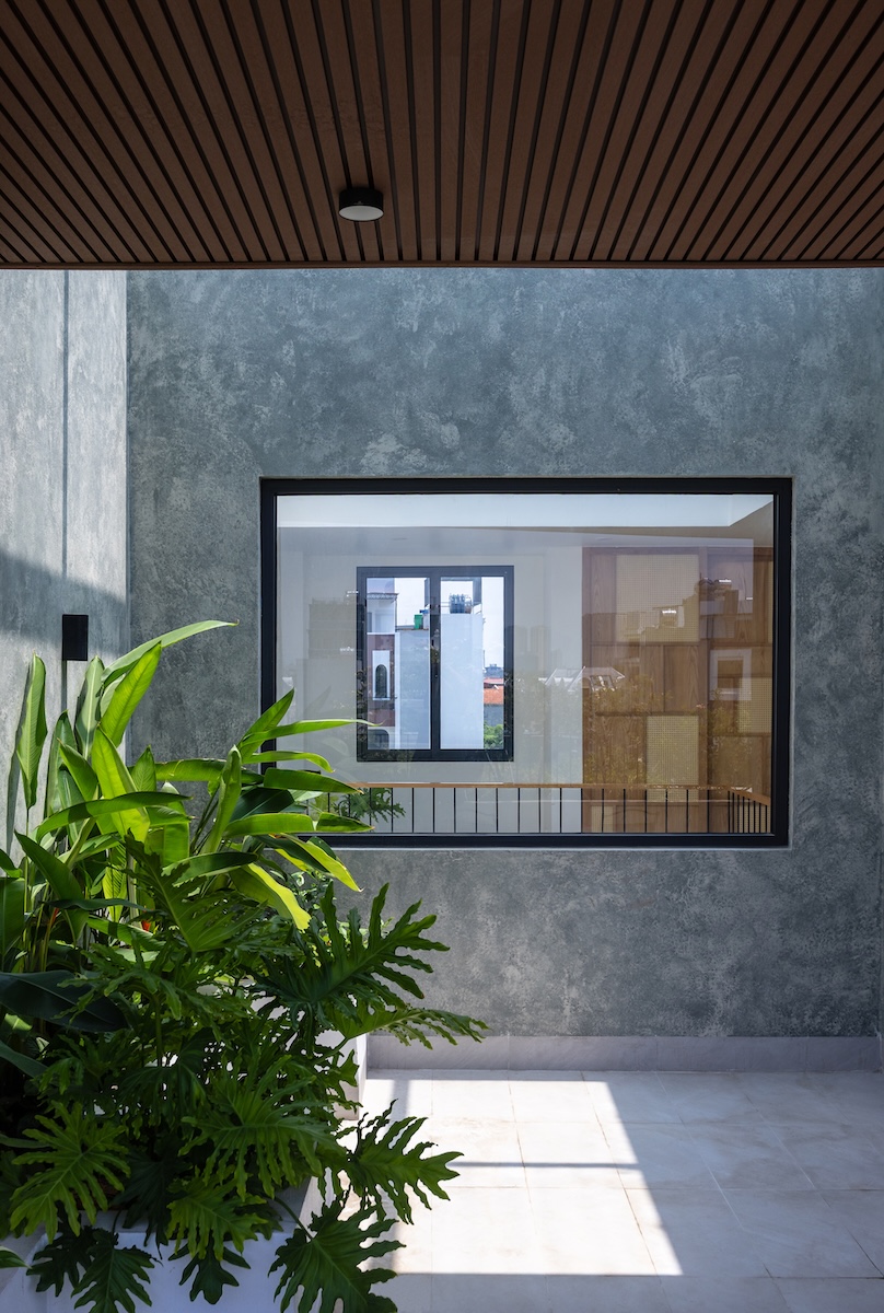 Với diện tích 6x15m, một kích thước chưa lý tưởng để bố trí sân vườn hay tạo ra các khoảng lùi ở trước sau ngôi nhà. Chúng tôi lựa chọn giải pháp tổ chức thông gió theo phương thẳng đứng, bằng cách bố trí các khoảng thông tầng tại giếng trời và sân sau, kết hợp với các khoảng trống ở sân trước và trên mái. Điều này không chỉ giúp lưu thông không khí và đón sáng hiệu quả, mà còn tạo ra các khoảng đệm để giảm thiểu tiếng ồn, bụi và ô nhiễm vào bên trong ngôi nhà.