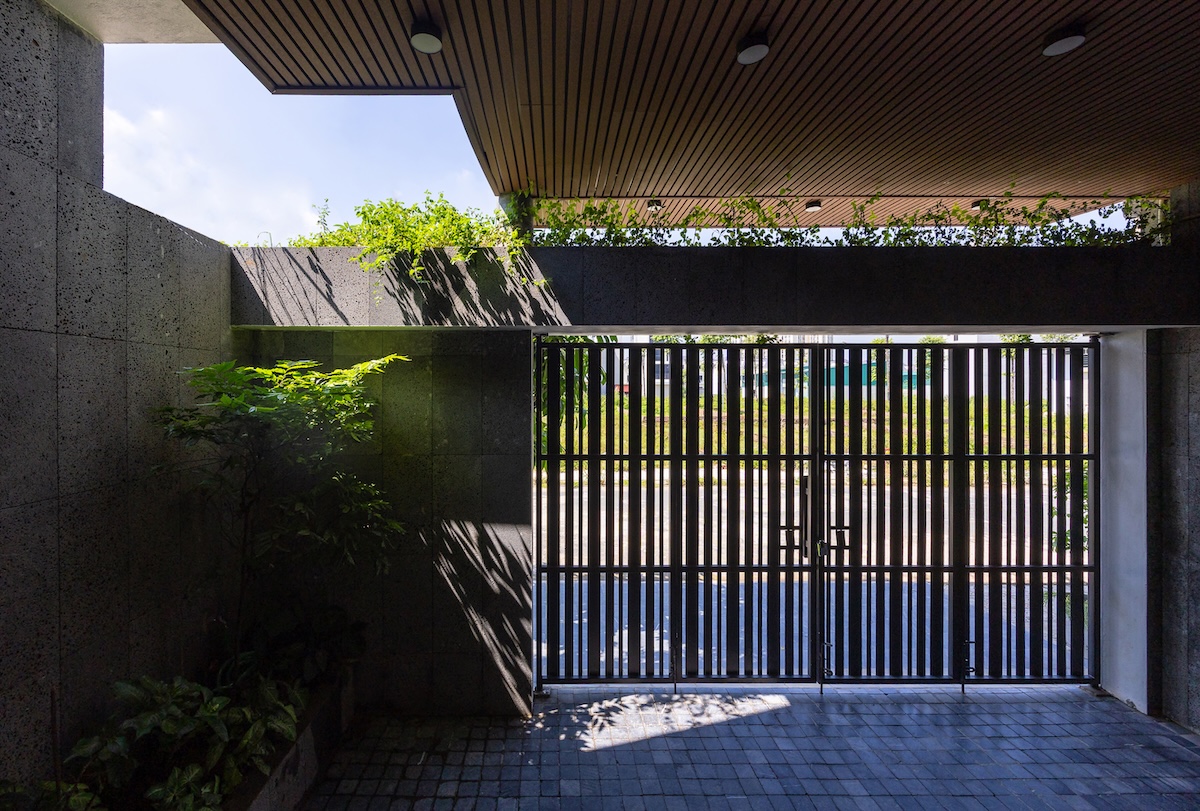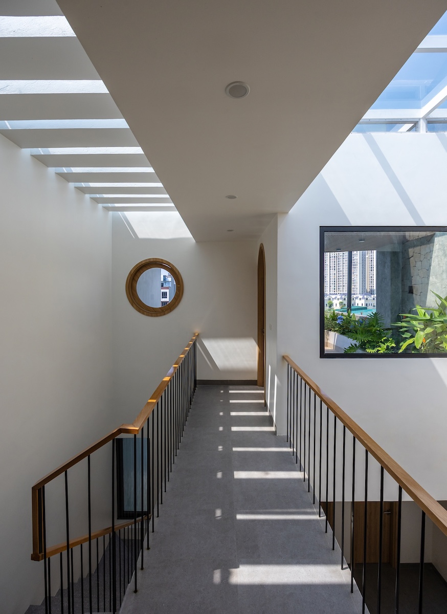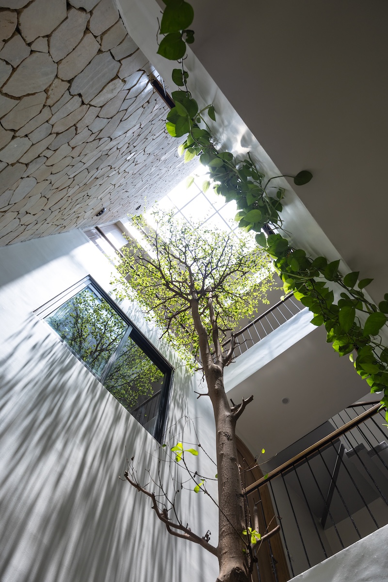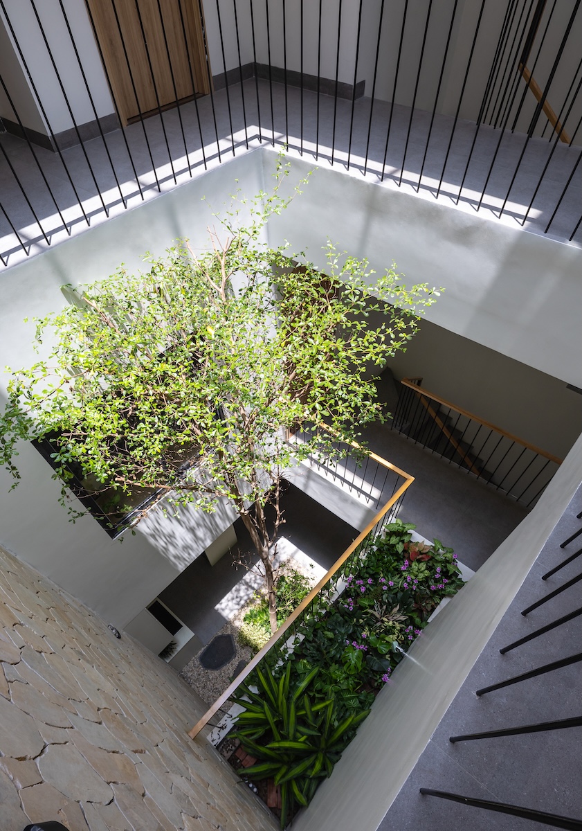 Trên cùng là mái giếng trời kết hợp một khu vườn nhỏ, điều này đóng vai trò như lớp cách nhiệt tự nhiên cho các không gian bên trong. Chính cấu trúc đặc – rỗng đan xen một cách có chủ đích đã mở ra khả năng sống linh hoạt, trong lành và gắn kết với tự nhiên. Điều đang dần trở thành “xa xỉ” trong bối cảnh đô thị ngày nay.