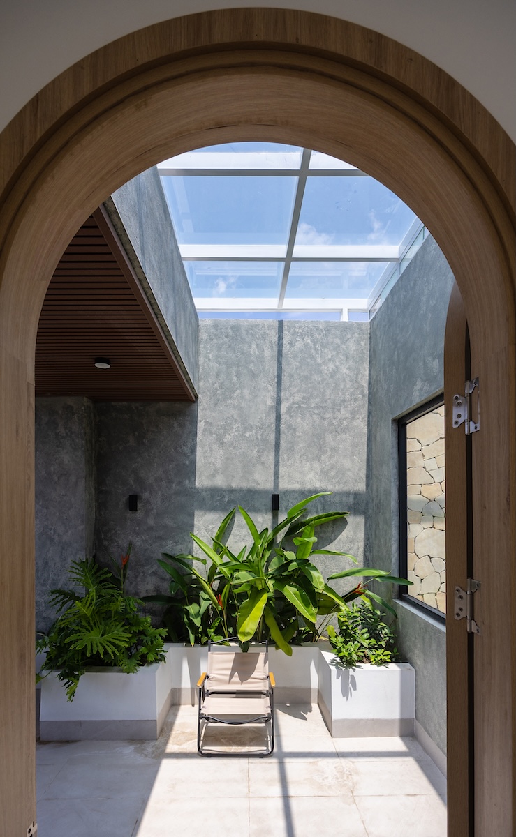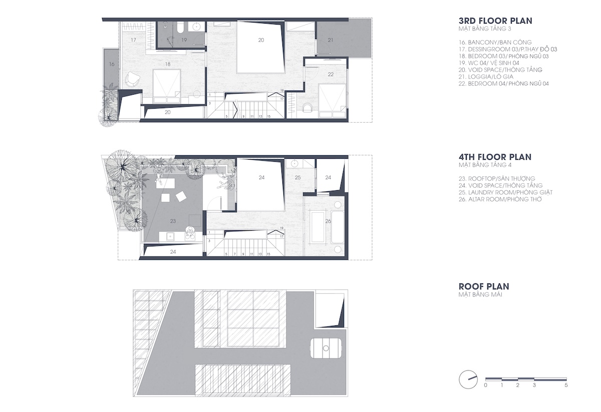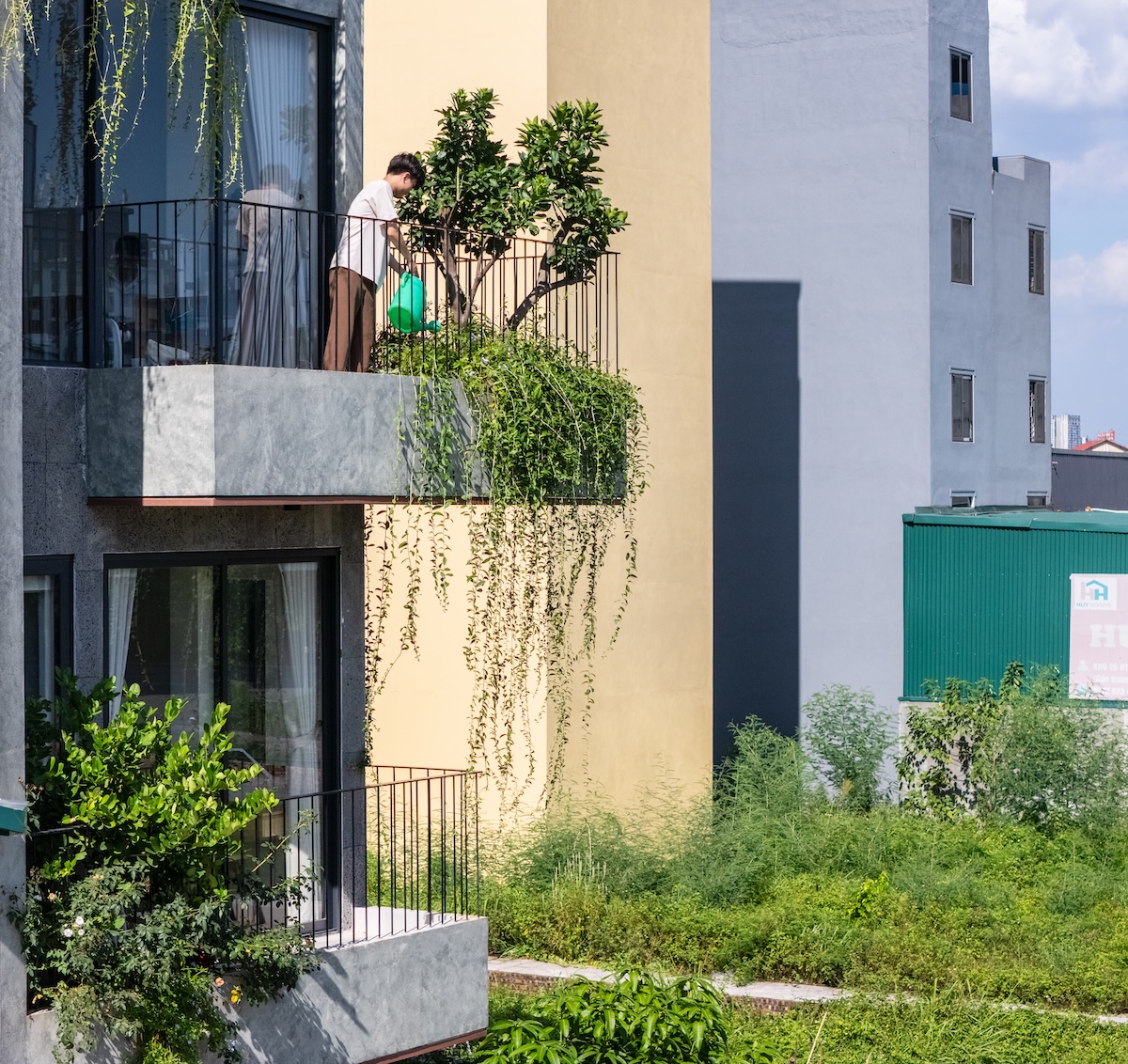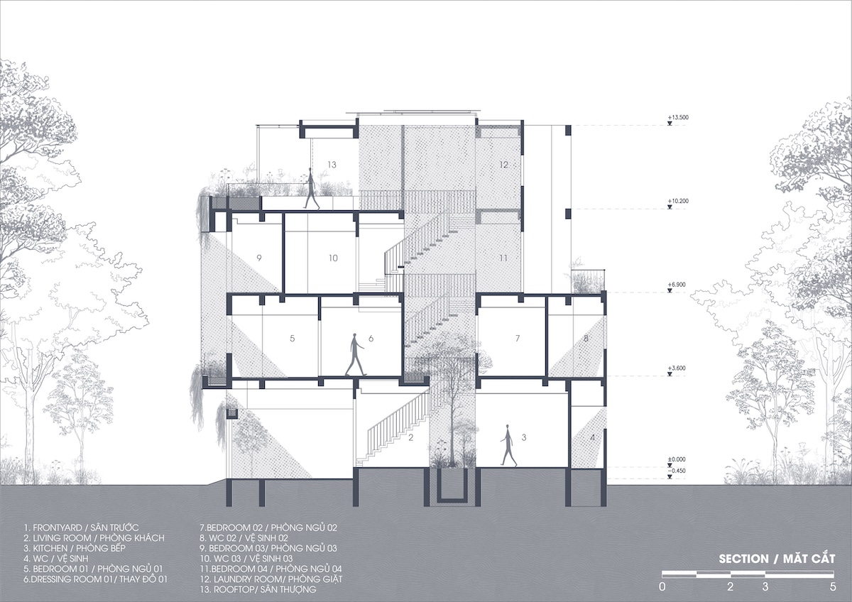 Trên cùng là mái giếng trời kết hợp một khu vườn nhỏ, điều này đóng vai trò như lớp cách nhiệt tự nhiên cho các không gian bên trong. Chính cấu trúc đặc – rỗng đan xen một cách có chủ đích đã mở ra khả năng sống linh hoạt, trong lành và gắn kết với tự nhiên. Điều đang dần trở thành “xa xỉ” trong bối cảnh đô thị ngày nay.