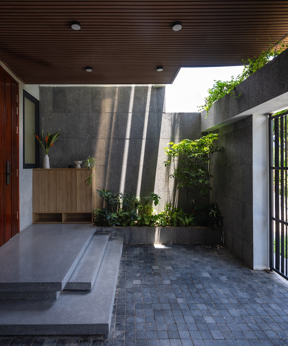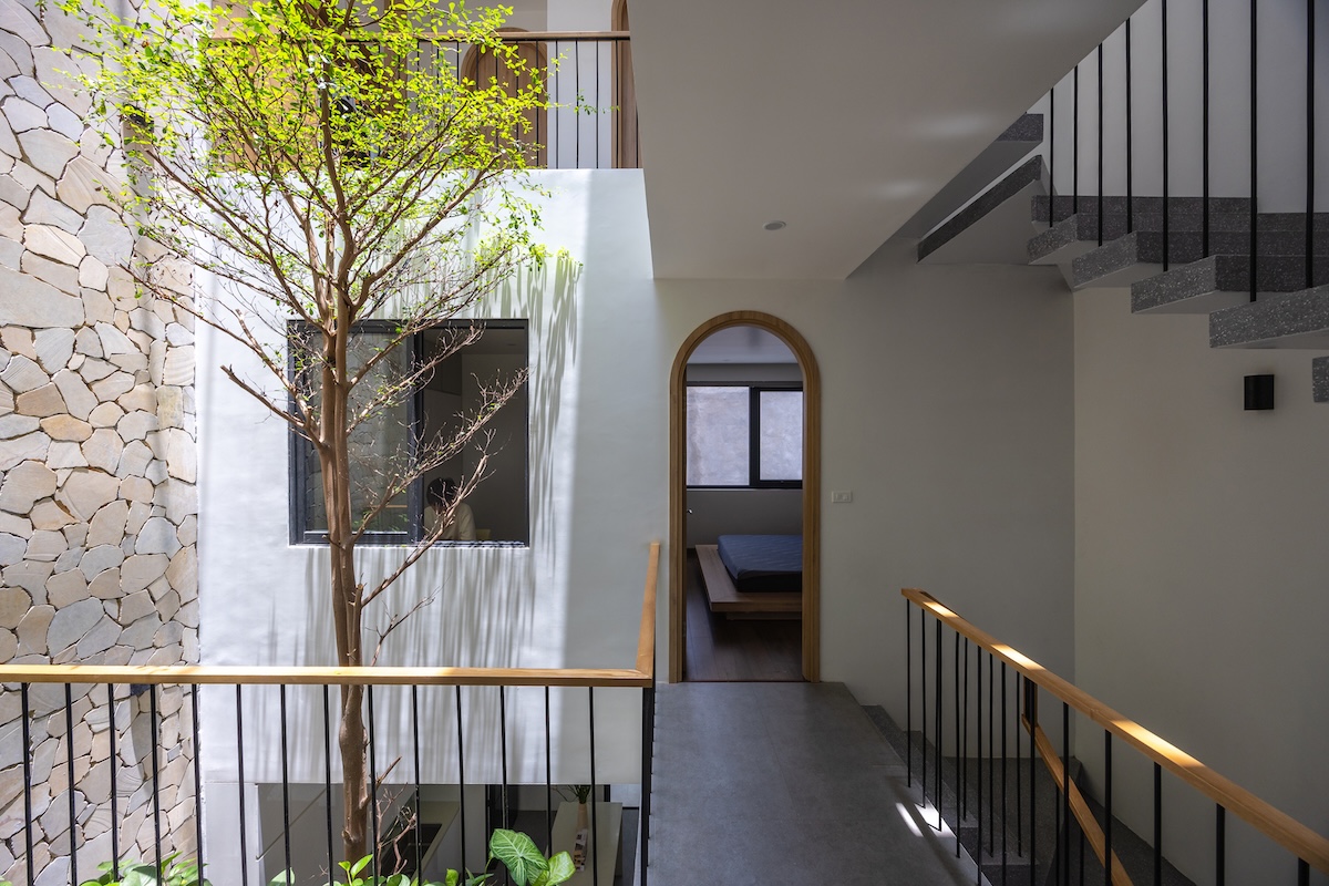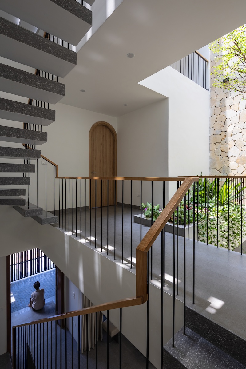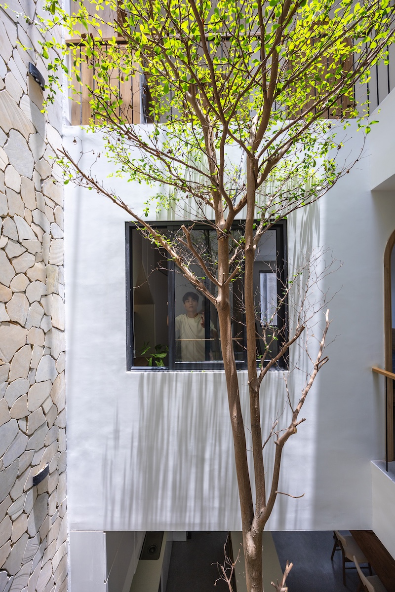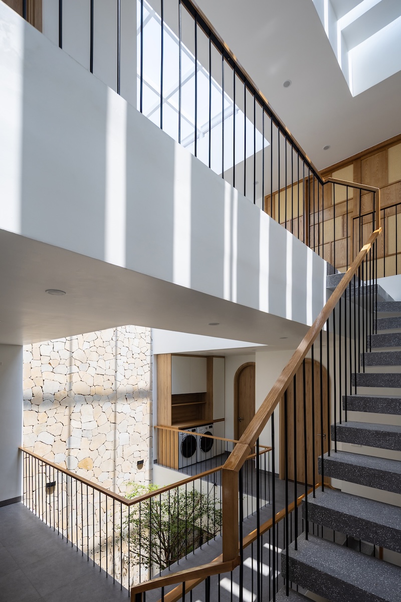 Ngoại thất của công trình sử dụng sơn bê tông kết hợp đá ong, đá bazan và hệ thống cây xanh tự nhiên. Điều này không chỉ giúp giảm hấp thụ nhiệt mà còn tạo nên diện mạo thô mộc, tự nhiên và bền vững theo thời gian. Ở khu vực giếng trời, mảng đá rối tự nhiên được bố trí xuyên suốt tạo điểm nhấn thị giác và kết nối không gian giữa các tầng, nơi các thành viên có thể tương tác và và gắn kết với nhau hơn.