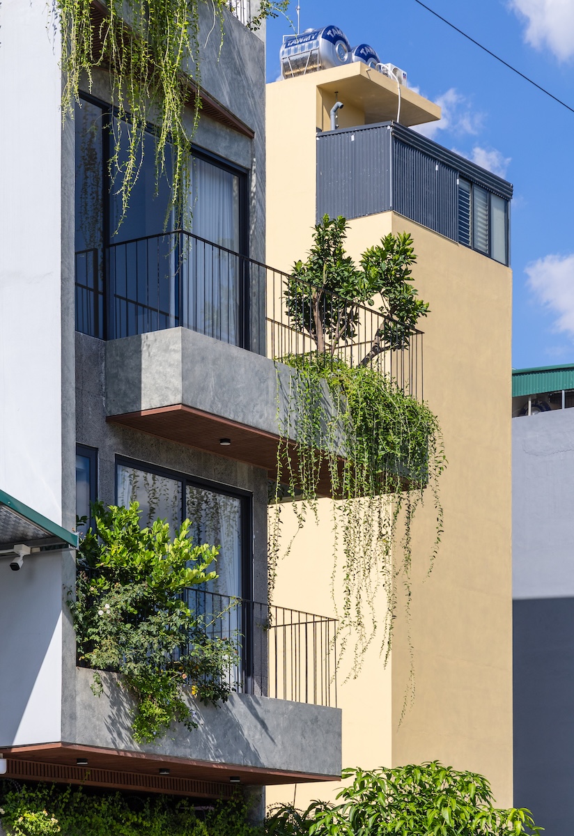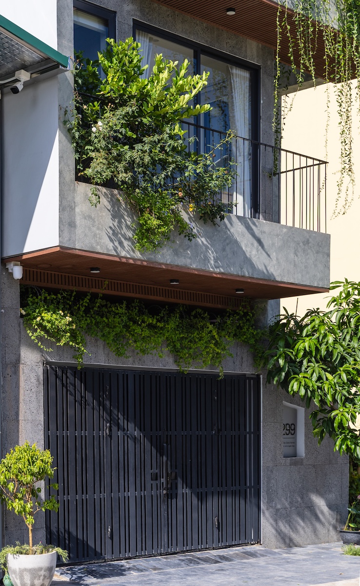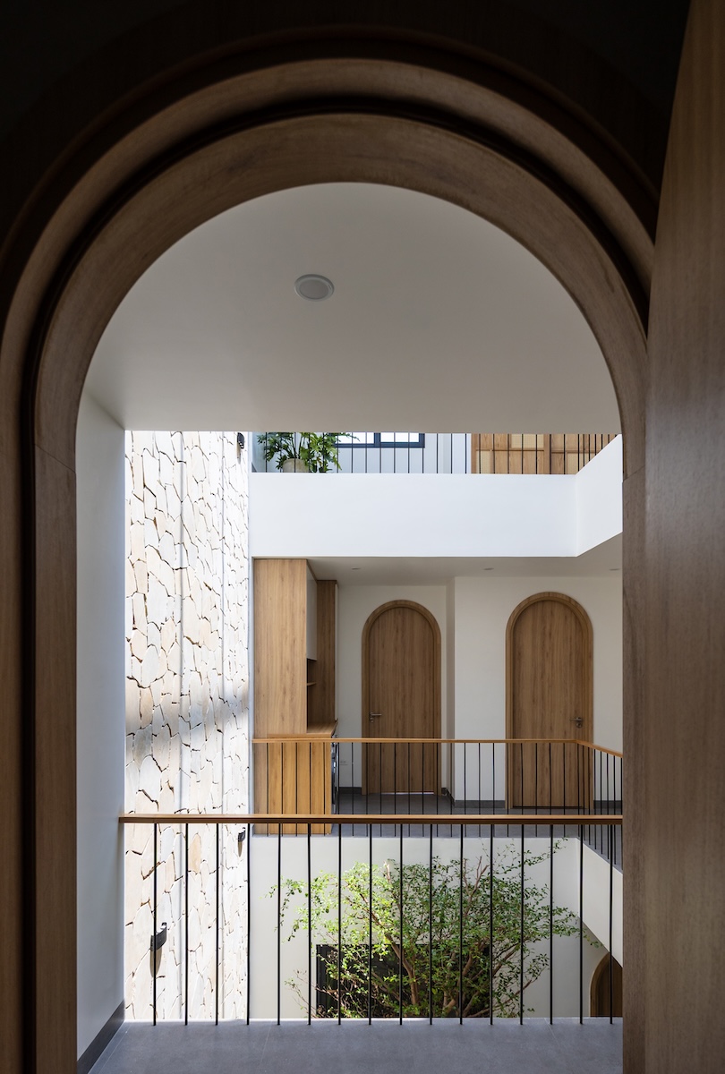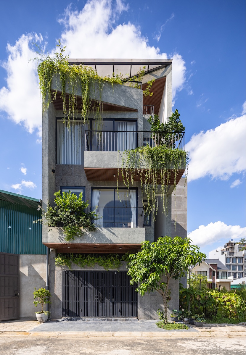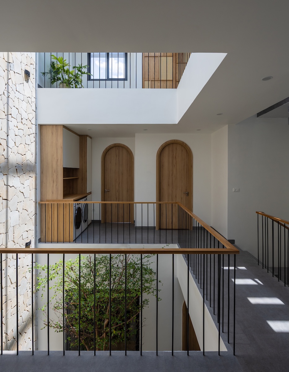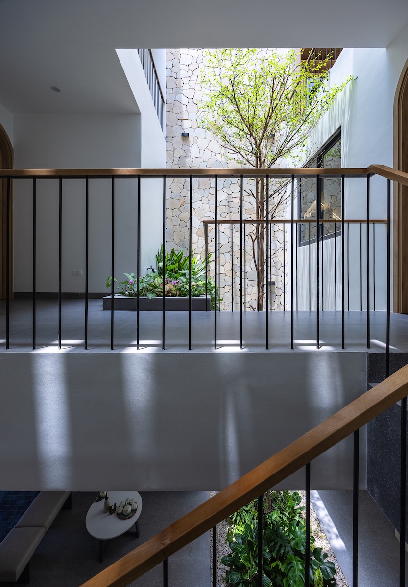 Ngoại thất của công trình sử dụng sơn bê tông kết hợp đá ong, đá bazan và hệ thống cây xanh tự nhiên. Điều này không chỉ giúp giảm hấp thụ nhiệt mà còn tạo nên diện mạo thô mộc, tự nhiên và bền vững theo thời gian. Ở khu vực giếng trời, mảng đá rối tự nhiên được bố trí xuyên suốt tạo điểm nhấn thị giác và kết nối không gian giữa các tầng, nơi các thành viên có thể tương tác và và gắn kết với nhau hơn.