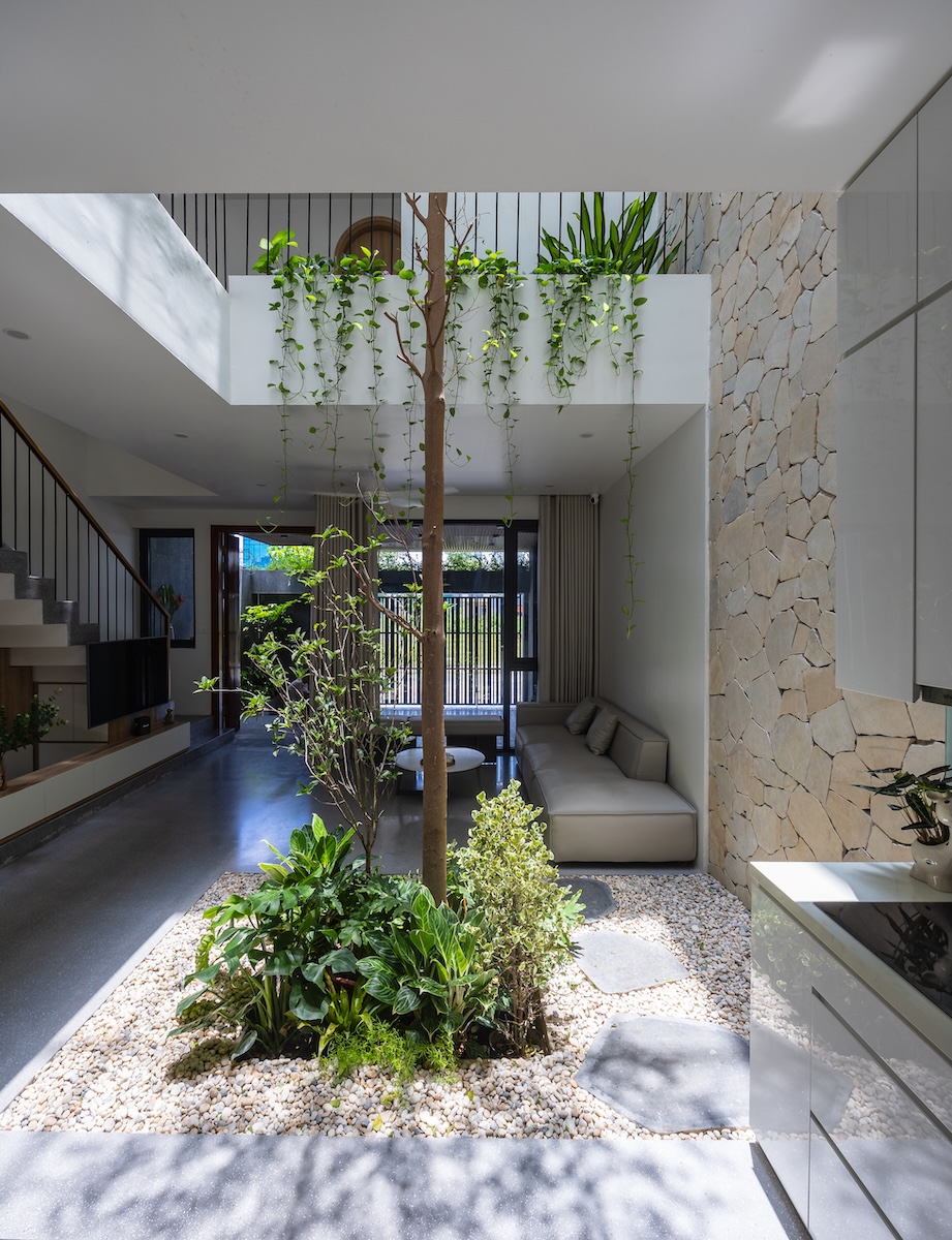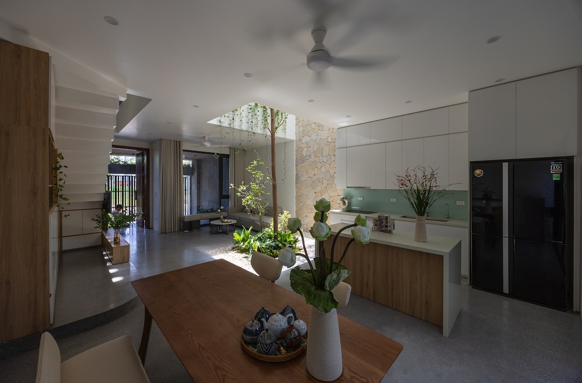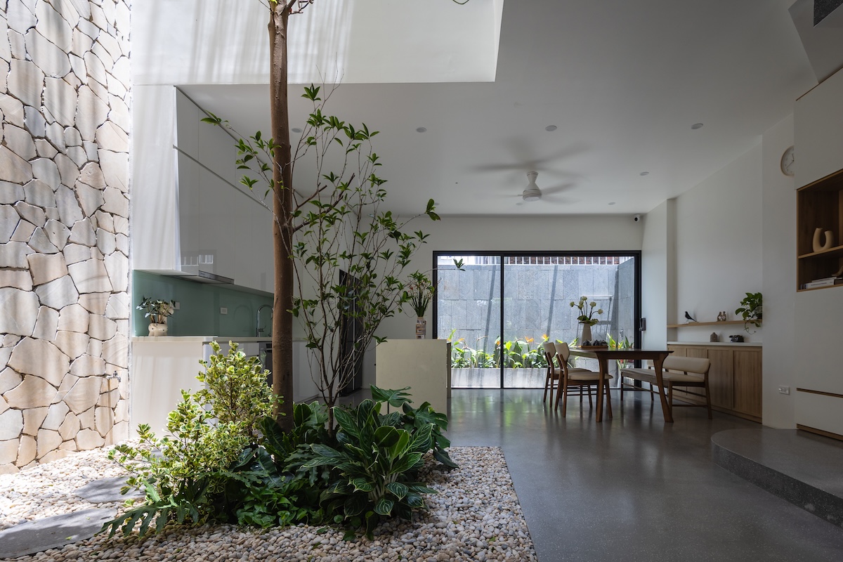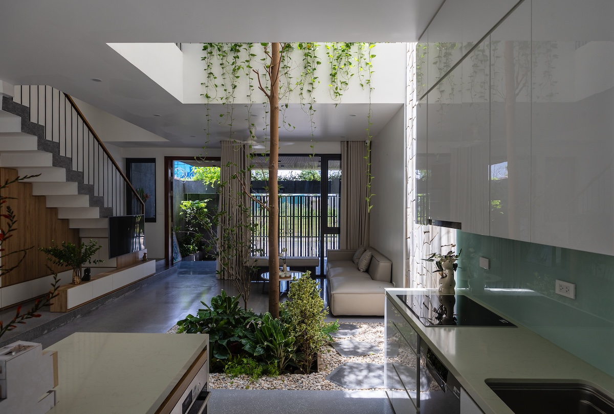 Mặc dù diện tích xây dựng không lớn, các không gian chức năng vẫn được tổ chức một cách khoa học và đều nhận được ánh sáng và không khí tự nhiên. Các mảng xanh được bố trí len lỏi trong công trình góp phần điều hòa vi khí hậu và còn mang lại cảm giác gần gũi với thiên nhiên, giúp gia chủ cảm nhận được sự thư thái và bình yên khi trở về nhà.