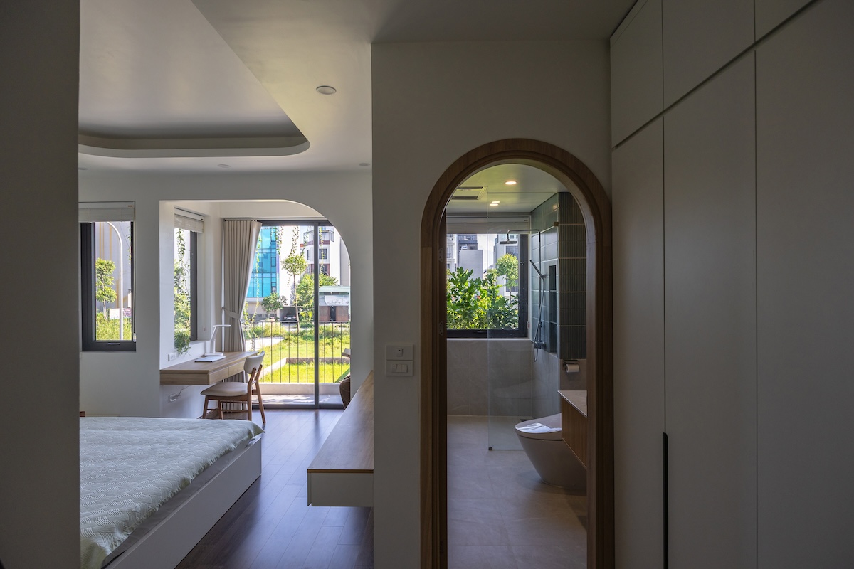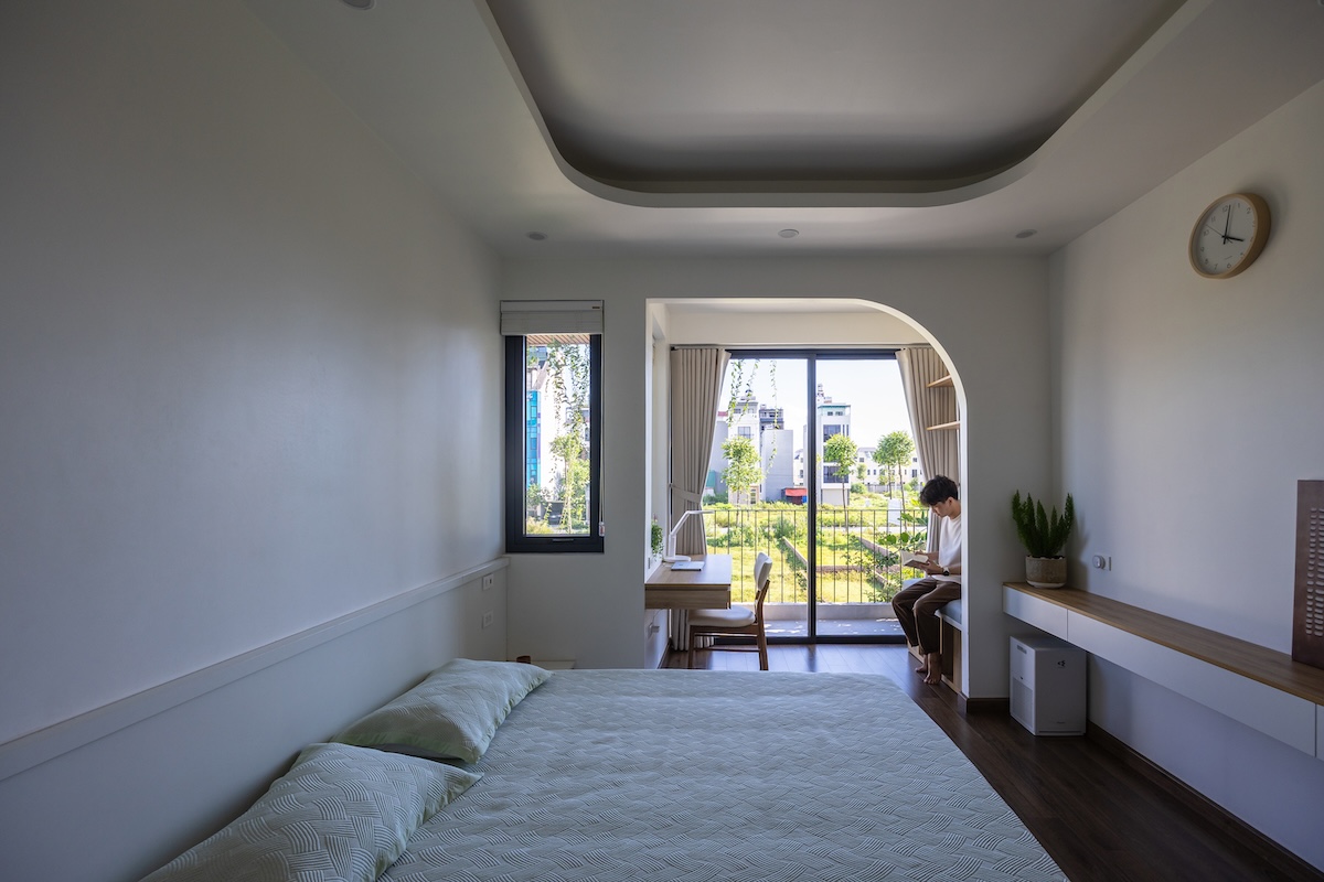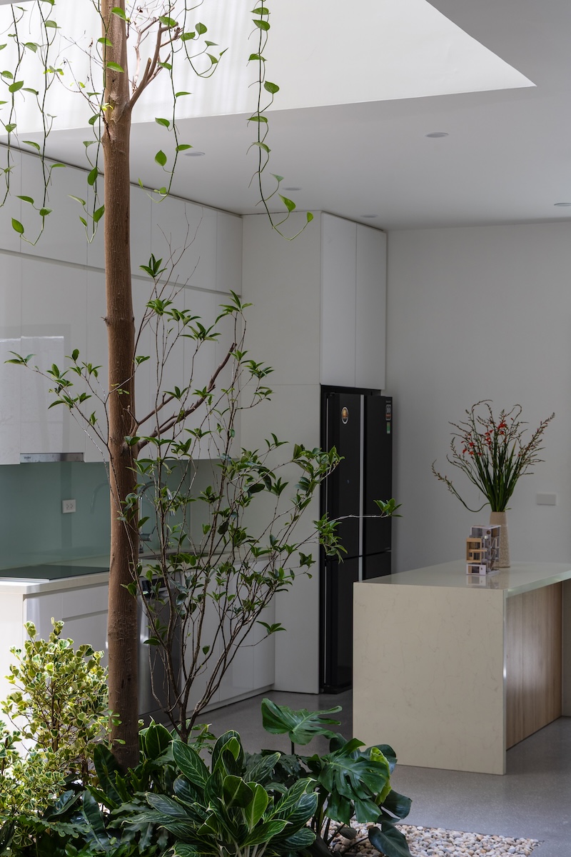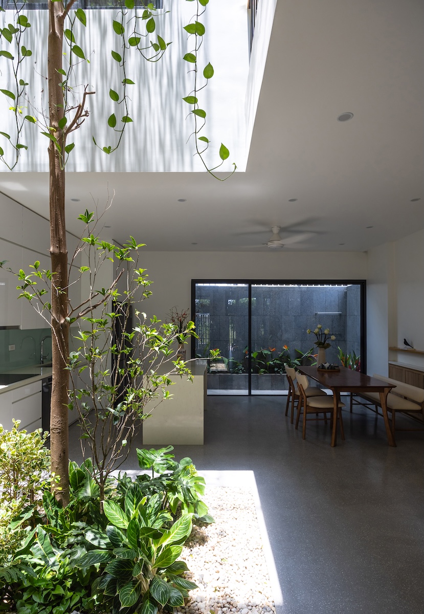 Mặc dù diện tích xây dựng không lớn, các không gian chức năng vẫn được tổ chức một cách khoa học và đều nhận được ánh sáng và không khí tự nhiên. Các mảng xanh được bố trí len lỏi trong công trình góp phần điều hòa vi khí hậu và còn mang lại cảm giác gần gũi với thiên nhiên, giúp gia chủ cảm nhận được sự thư thái và bình yên khi trở về nhà.