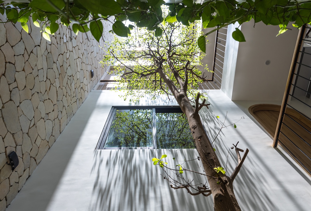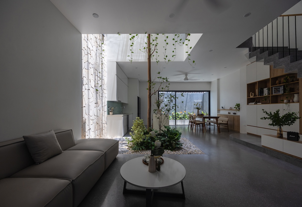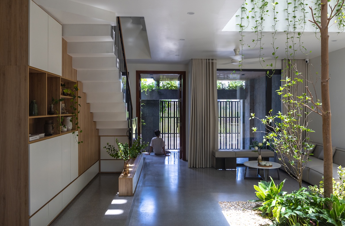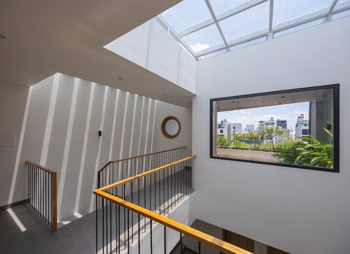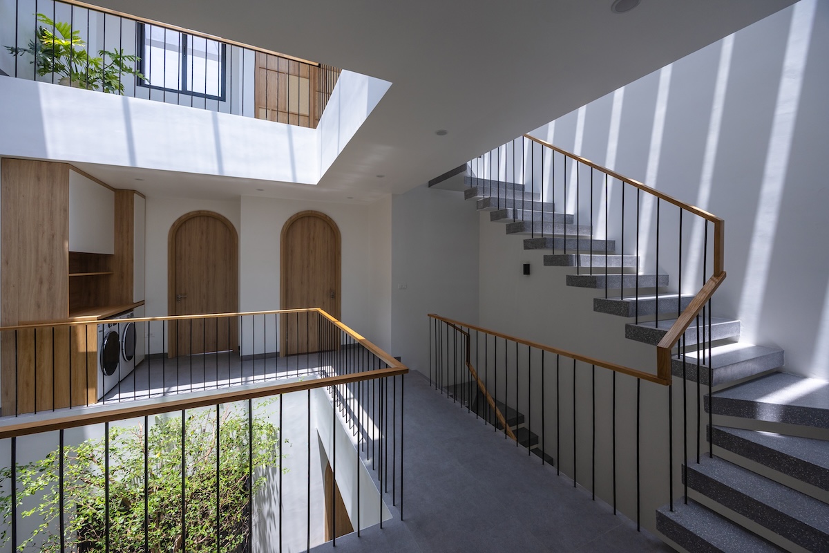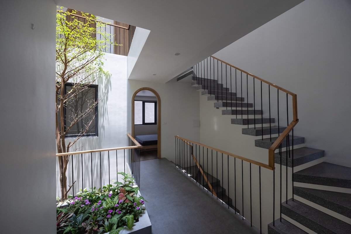 Bằng việc hy sinh một phần diện tích để tạo khe thoáng chạy dọc theo mặt tiền. “Ống dẫn gió” tự nhiên được hình thành cho phép không khí từ mặt ngoài tiếp cận trực tiếp vào lõi công trình mà không cần qua các không gian khác. Luồng gió dẫn thẳng vào trung tâm ngôi nhà, nơi kết hợp cùng giếng trời hình phễu được mở rộng từ dưới lên trên. Điều này tạo nên hiệu ứng đối lưu mạnh mẽ, tăng cường khả năng thông gió và đưa ánh sáng tự nhiên lan tỏa xuống toàn bộ công trình.