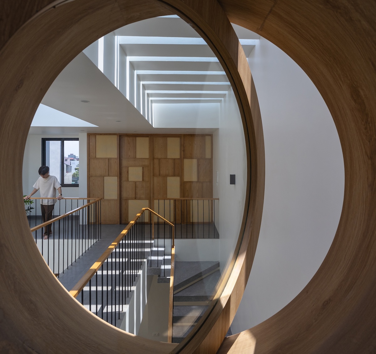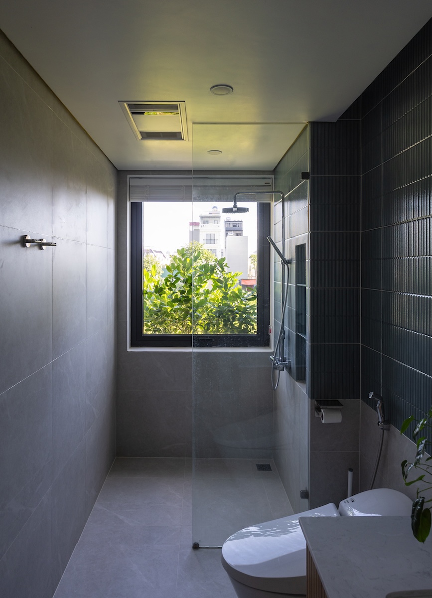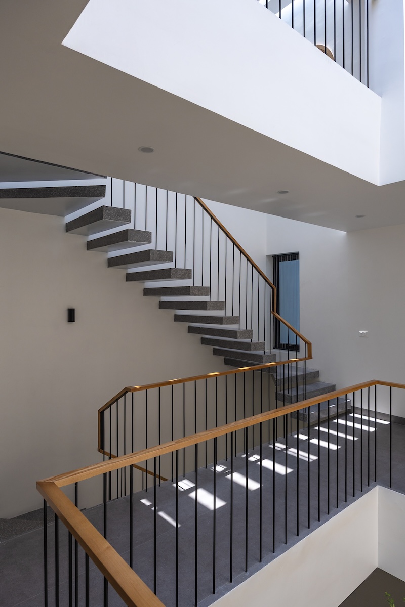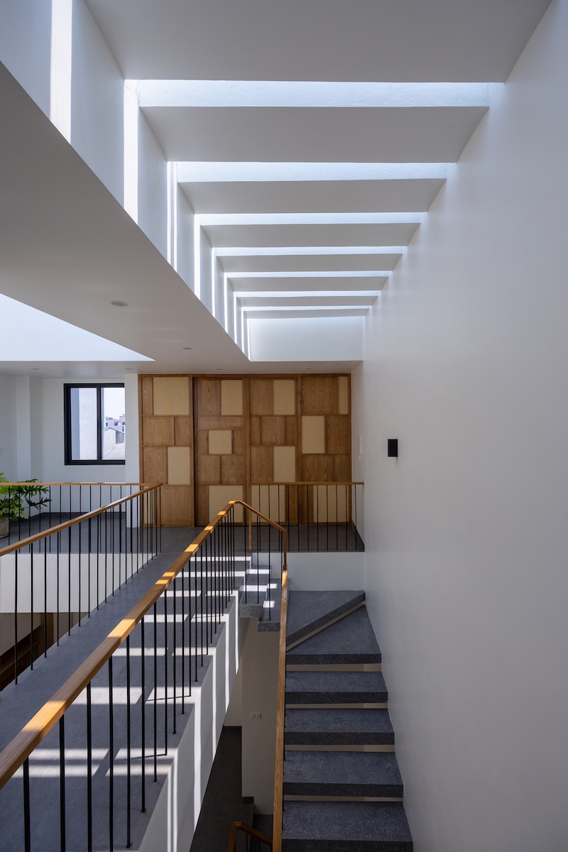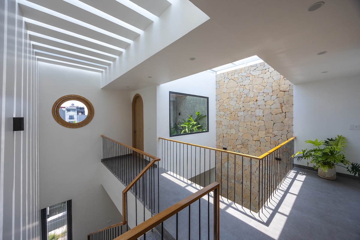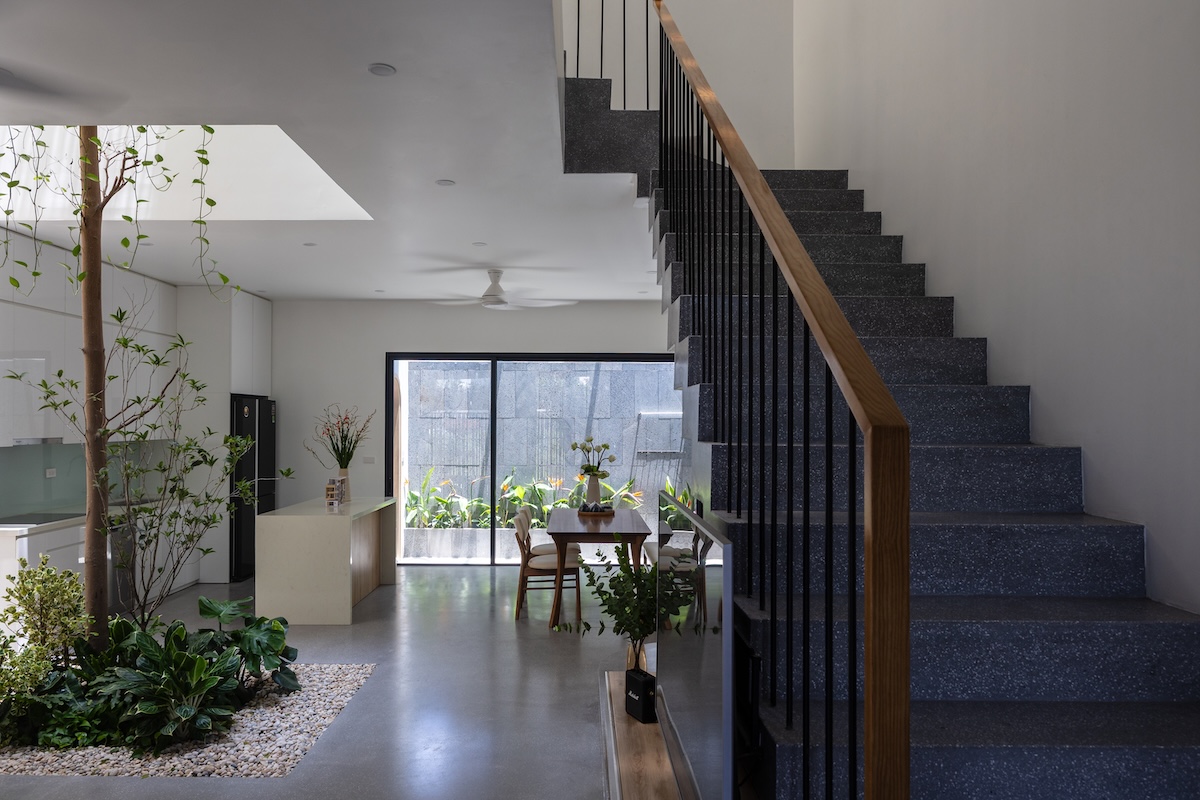 Bằng việc hy sinh một phần diện tích để tạo khe thoáng chạy dọc theo mặt tiền. “Ống dẫn gió” tự nhiên được hình thành cho phép không khí từ mặt ngoài tiếp cận trực tiếp vào lõi công trình mà không cần qua các không gian khác. Luồng gió dẫn thẳng vào trung tâm ngôi nhà, nơi kết hợp cùng giếng trời hình phễu được mở rộng từ dưới lên trên. Điều này tạo nên hiệu ứng đối lưu mạnh mẽ, tăng cường khả năng thông gió và đưa ánh sáng tự nhiên lan tỏa xuống toàn bộ công trình.