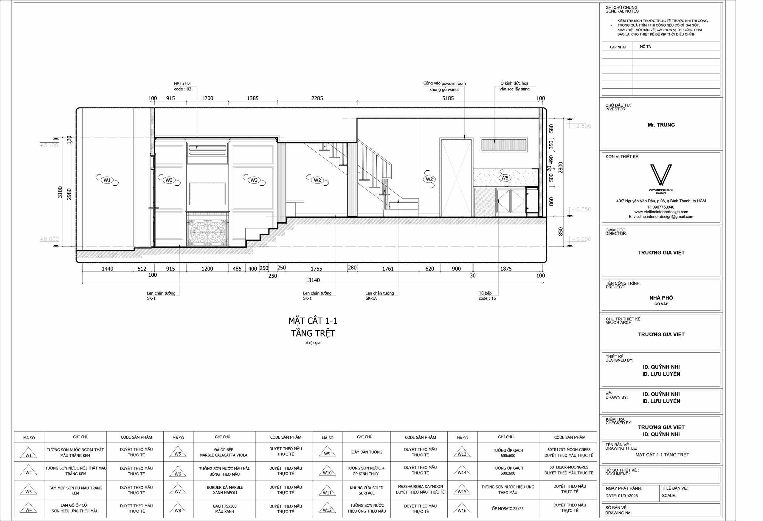 Tuy nhiên, thay vì che giấu, kiến trúc sư xem đây là cơ hội. Độ chênh cao độ giữa phòng khách và khu bếp được tổ chức như một nhịp chuyển không gian rất tự nhiên: chỉ vài bậc tam cấp nhưng đủ để mở ra một “cảnh quan nội thất” mới, tách nhẹ chức năng mà vẫn liền mạch. Người bước qua đó cảm nhận được sự thay đổi không khí, giống như chuyển chương trong một câu chuyện liền mạch.