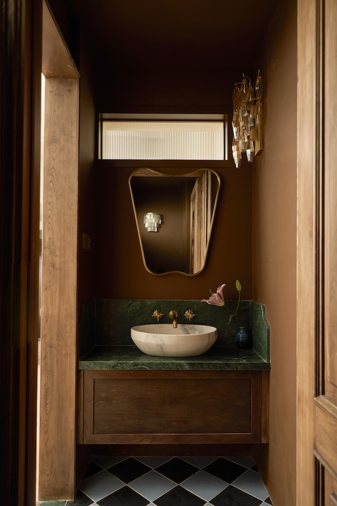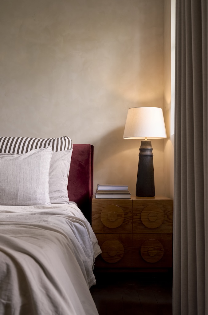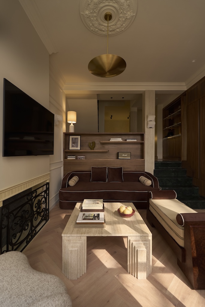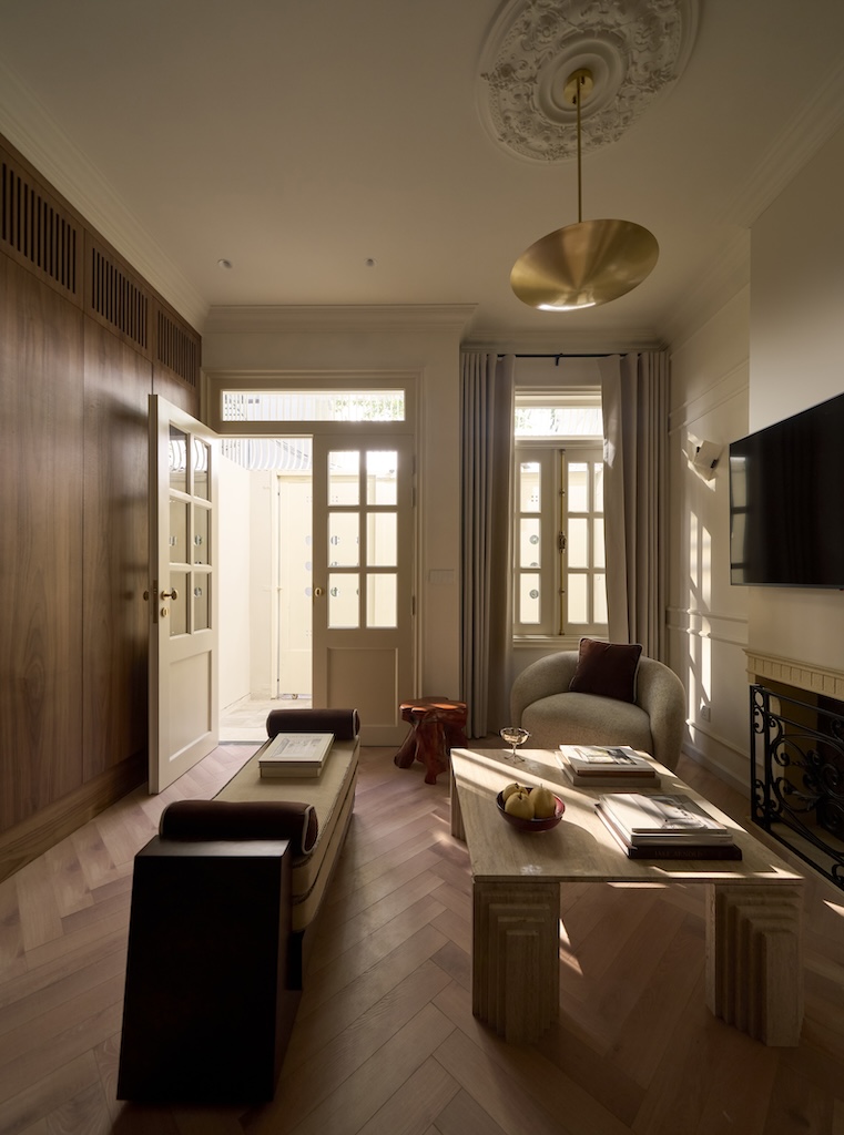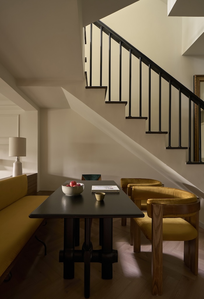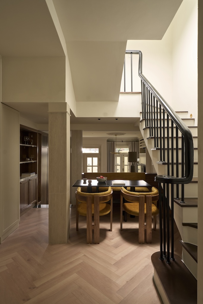 Phòng khách là trung tâm kết nối, nơi ánh sáng dịu trải lên sàn gỗ xương cá, sofa nâu trầm và bàn đá travertine. Dưới cầu thang, khu bàn ăn được làm ấm bằng sắc vàng mật ong và bàn đen mờ tạo tương phản tinh tế. Phòng ngủ giữ nhịp lặng, với tông trung tính và một điểm nhấn đỏ sâu để cân bằng cảm xúc.