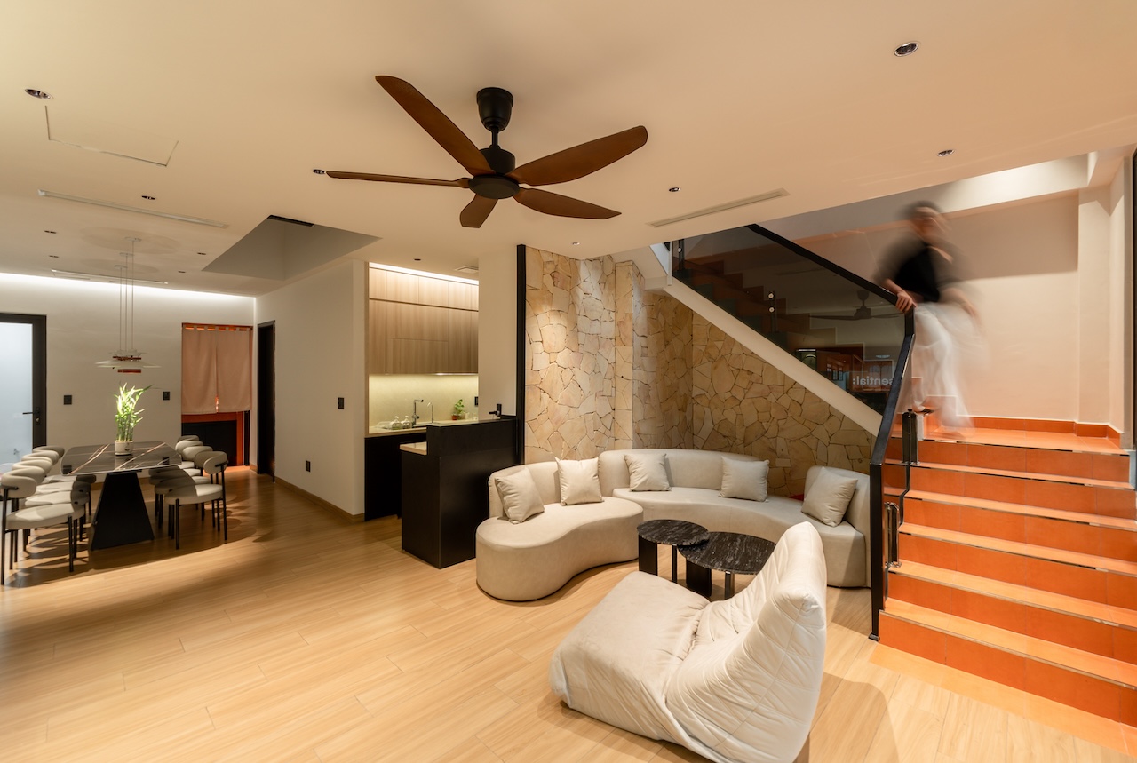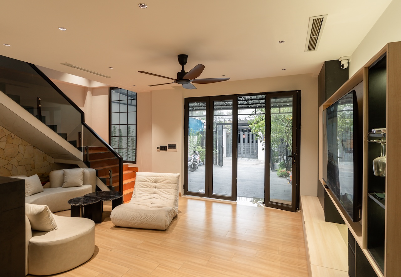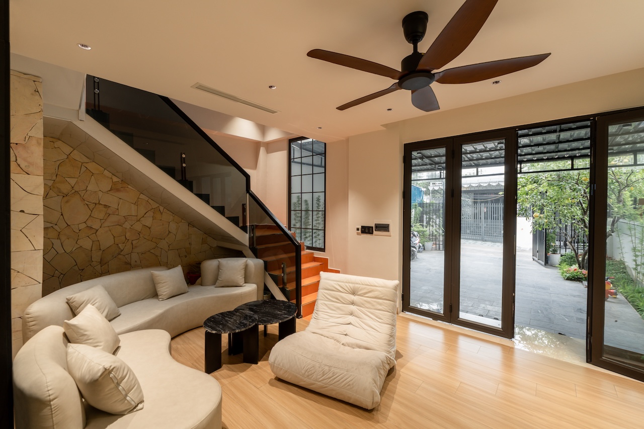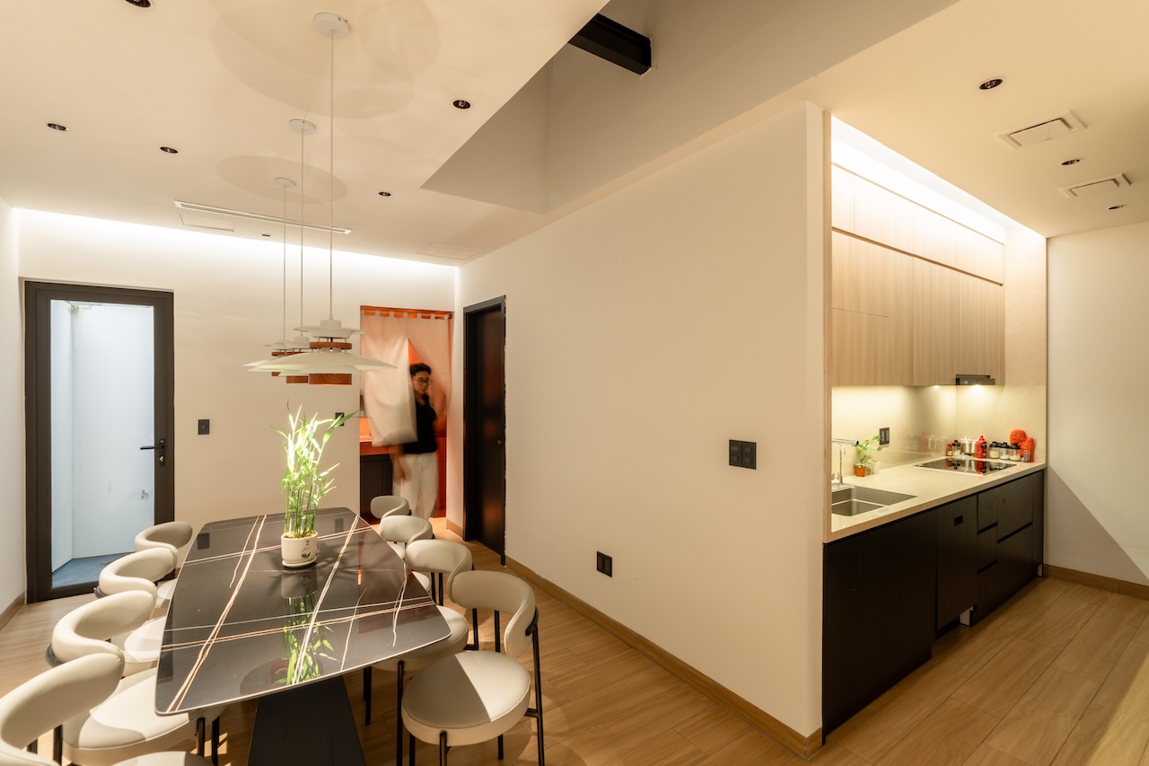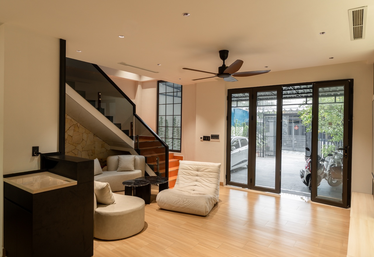 Giải pháp thiết kế của HoA House tập trung tối đa vào việc xóa nhòa ranh giới giữa các khu vực chức năng nhằm tối ưu hóa trải nghiệm sống cho gia chủ. Mặt bằng tầng 1 được tái thiết kế theo lối mở, kết nối liên hoàn từ phòng khách, bếp đến bàn ăn, giúp tạo ra biên độ không gian rộng lớn hơn nhiều so với diện tích thực tế. Điểm cốt lõi của giải pháp này là khoảng giếng trời được bố trí ngay tại lõi nhà, không chỉ giúp tối ưu hóa thông gió mà còn dẫn dắt ánh sáng tự nhiên từ mái đâm xuyên qua các tầng, làm sáng cả khu vực phòng ngủ phía trên lẫn phòng ăn tầng dưới.