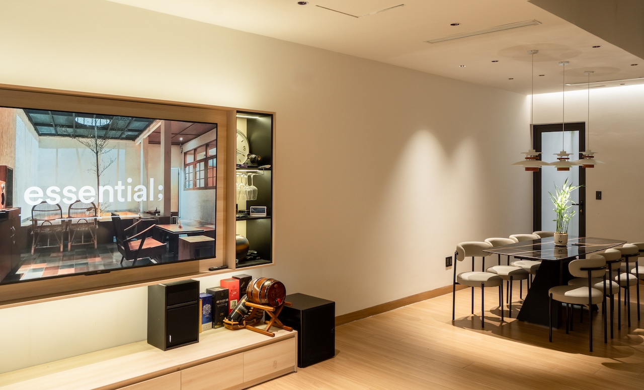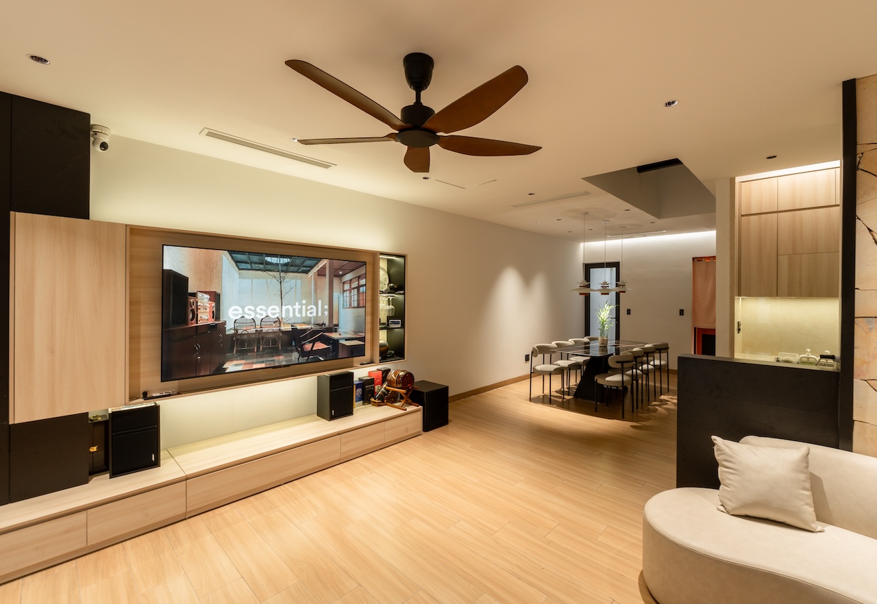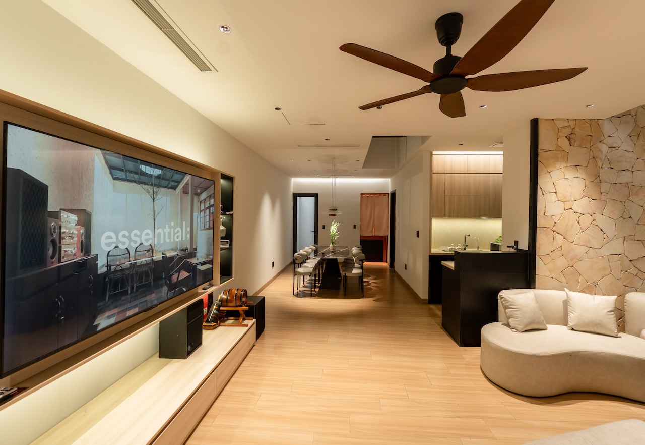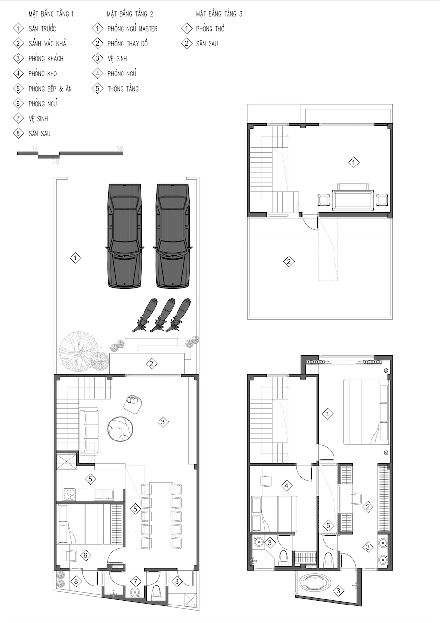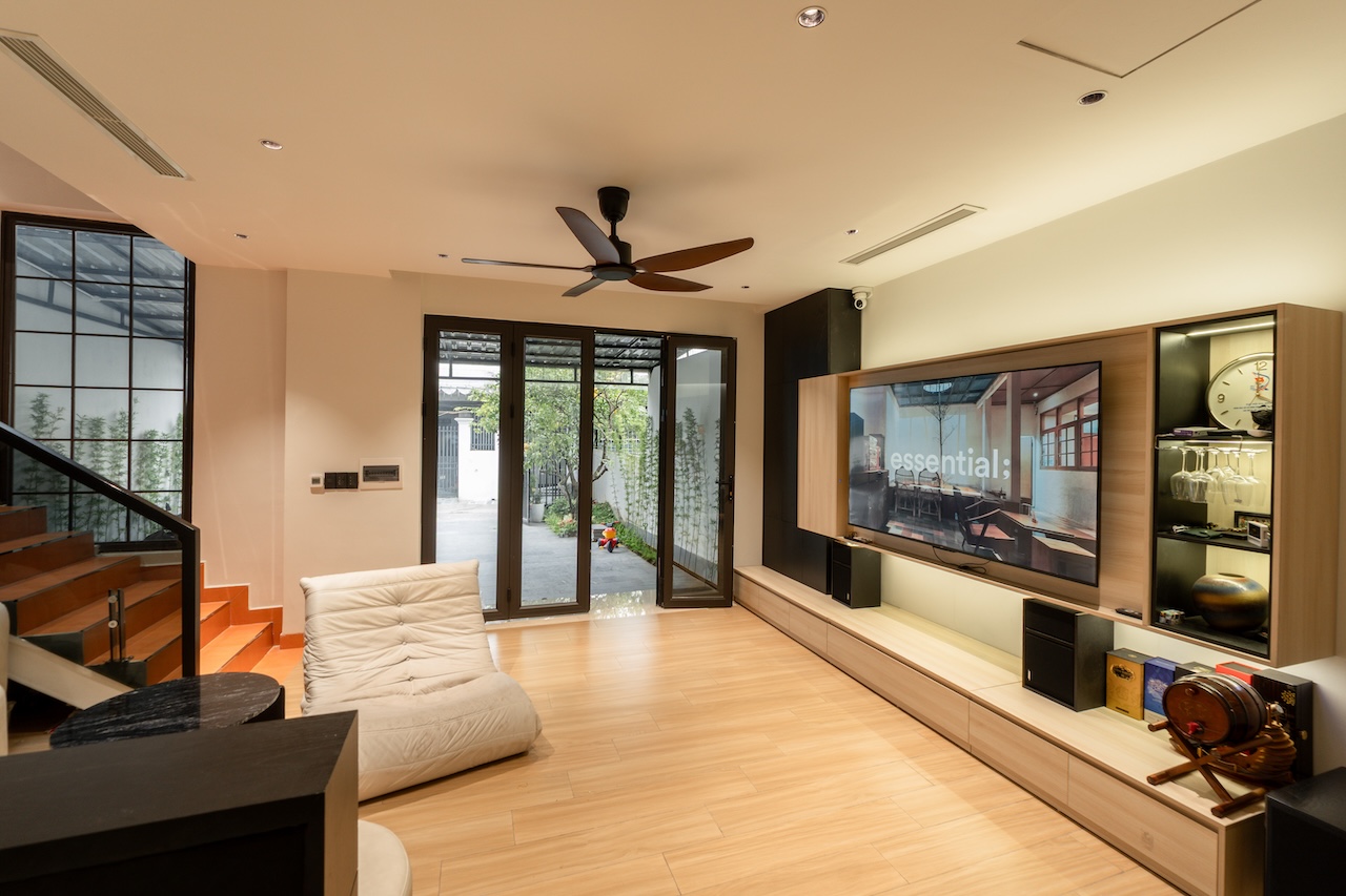 Giải pháp thiết kế của HoA House tập trung tối đa vào việc xóa nhòa ranh giới giữa các khu vực chức năng nhằm tối ưu hóa trải nghiệm sống cho gia chủ. Mặt bằng tầng 1 được tái thiết kế theo lối mở, kết nối liên hoàn từ phòng khách, bếp đến bàn ăn, giúp tạo ra biên độ không gian rộng lớn hơn nhiều so với diện tích thực tế. Điểm cốt lõi của giải pháp này là khoảng giếng trời được bố trí ngay tại lõi nhà, không chỉ giúp tối ưu hóa thông gió mà còn dẫn dắt ánh sáng tự nhiên từ mái đâm xuyên qua các tầng, làm sáng cả khu vực phòng ngủ phía trên lẫn phòng ăn tầng dưới.