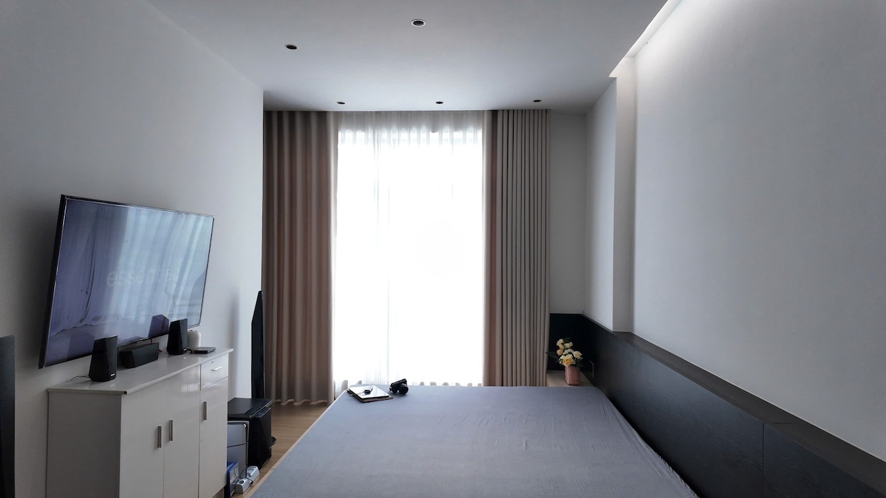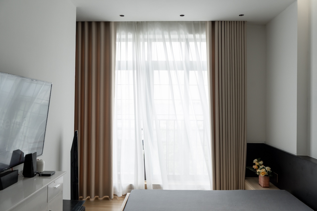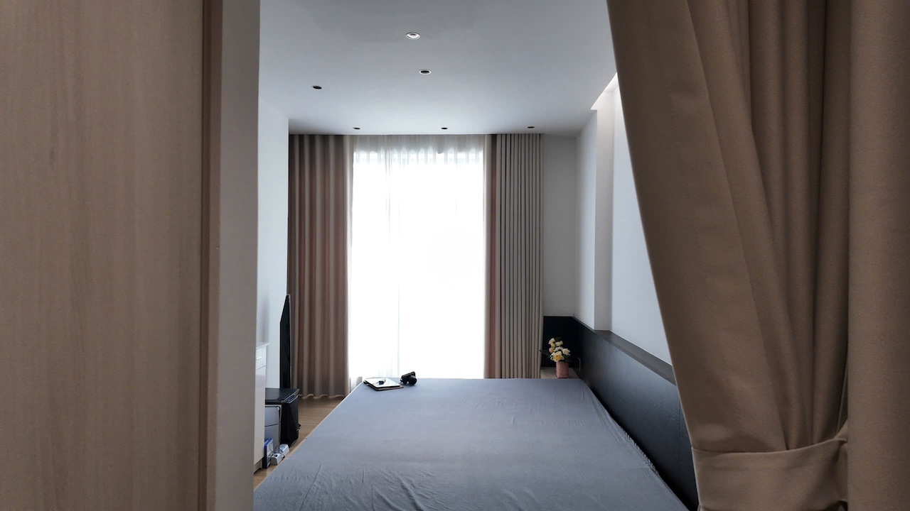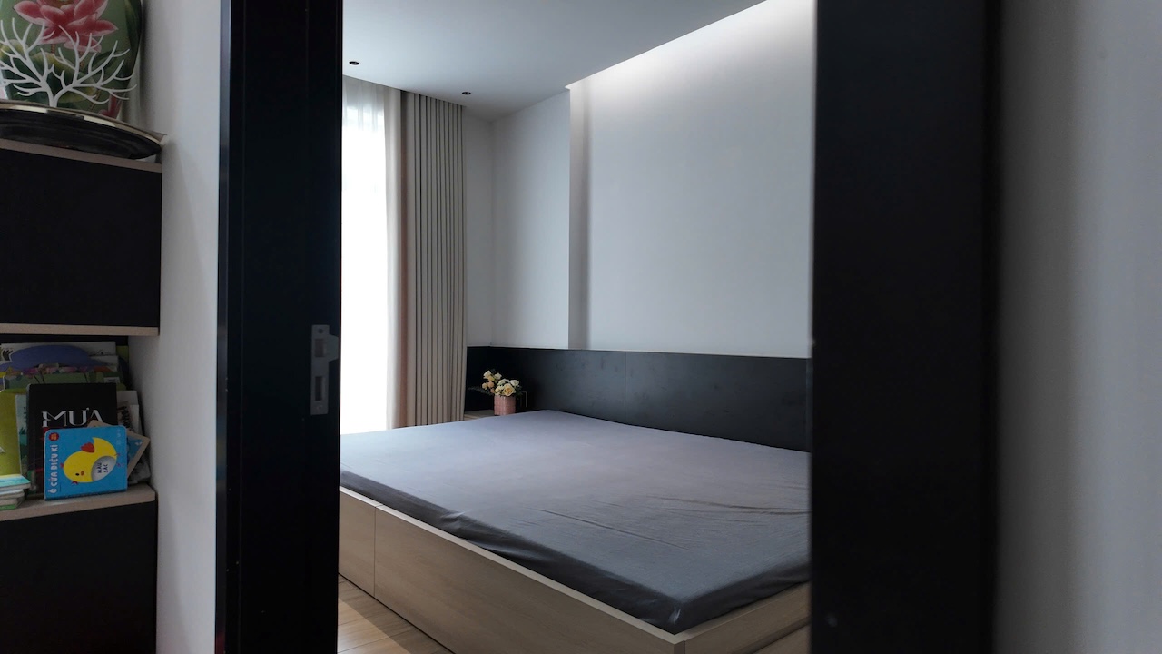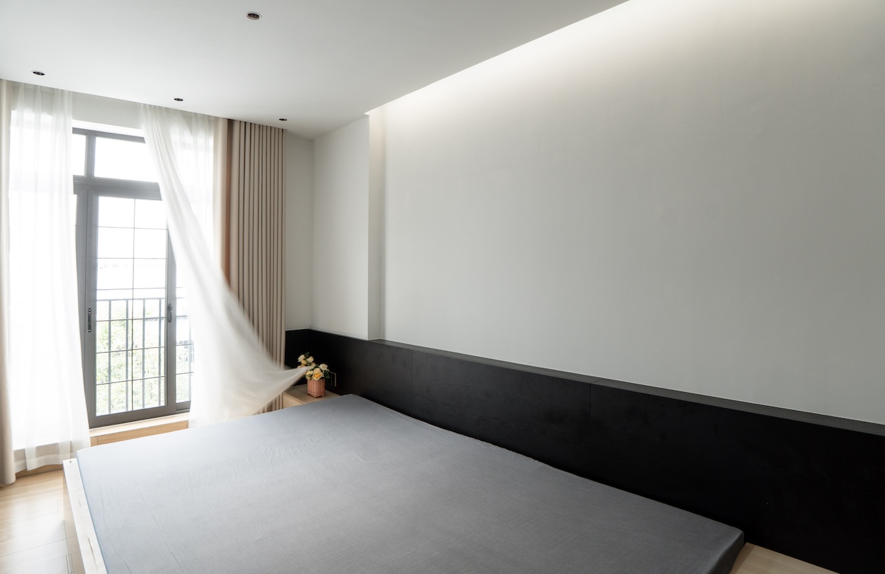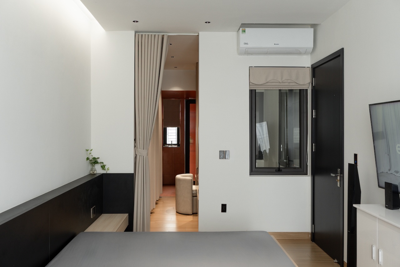 Sự tinh tế của công trình còn nằm ở cách sử dụng chất cảm vật liệu và ánh sáng trên nền màu trung tính chủ đạo. Điểm nhấn kiến trúc đầy thô mộc từ mảng tường đá tự nhiên chạy dọc lối cầu thang tạo nên sự đối lập thú vị với nét tinh giản của tổng thể, trong khi hệ thống chiếu sáng âm trần được tính toán tỉ mỉ để tạo ra các kịch bản cảm xúc và định hình khối không gian về đêm. Càng lên cao, ngôi nhà càng chuyển tiếp sang trạng thái tĩnh lặng và riêng tư tuyệt đối với không gian phòng ngủ tối giản. Tại đây, hệ cửa kính lớn đón trọn ánh sáng tự nhiên được lọc nhẹ nhàng qua các lớp rèm lụa, kết hợp cùng các chi tiết nội thất tinh gọn để tạo nên một chiều sâu thư giãn và bình yên đúng nghĩa.