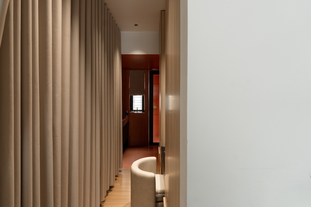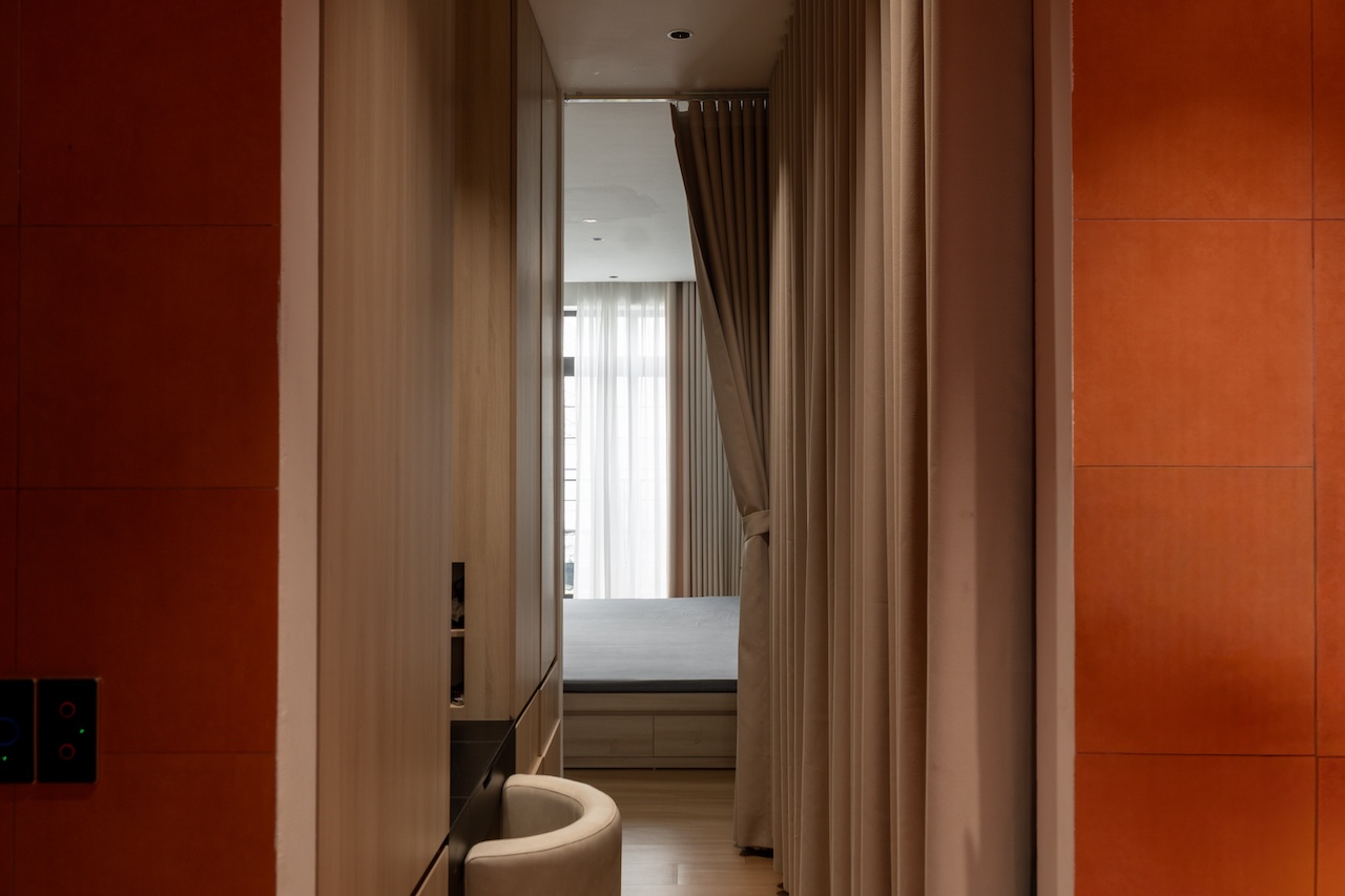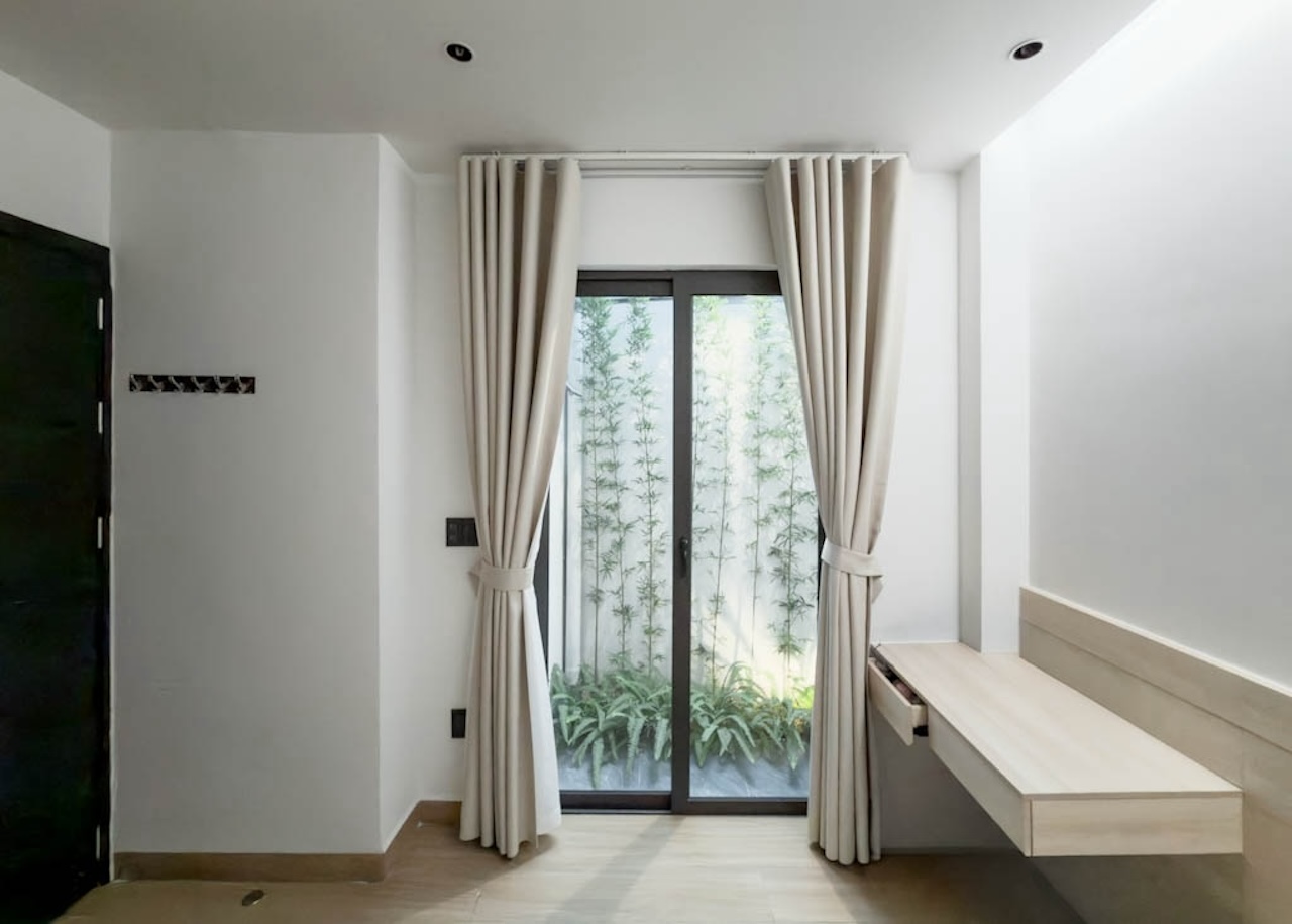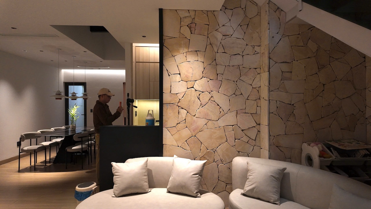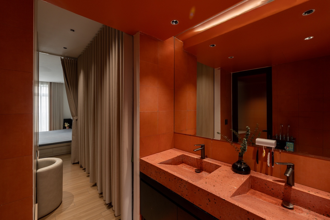 Sự tinh tế của công trình còn nằm ở cách sử dụng chất cảm vật liệu và ánh sáng trên nền màu trung tính chủ đạo. Điểm nhấn kiến trúc đầy thô mộc từ mảng tường đá tự nhiên chạy dọc lối cầu thang tạo nên sự đối lập thú vị với nét tinh giản của tổng thể, trong khi hệ thống chiếu sáng âm trần được tính toán tỉ mỉ để tạo ra các kịch bản cảm xúc và định hình khối không gian về đêm. Càng lên cao, ngôi nhà càng chuyển tiếp sang trạng thái tĩnh lặng và riêng tư tuyệt đối với không gian phòng ngủ tối giản. Tại đây, hệ cửa kính lớn đón trọn ánh sáng tự nhiên được lọc nhẹ nhàng qua các lớp rèm lụa, kết hợp cùng các chi tiết nội thất tinh gọn để tạo nên một chiều sâu thư giãn và bình yên đúng nghĩa.