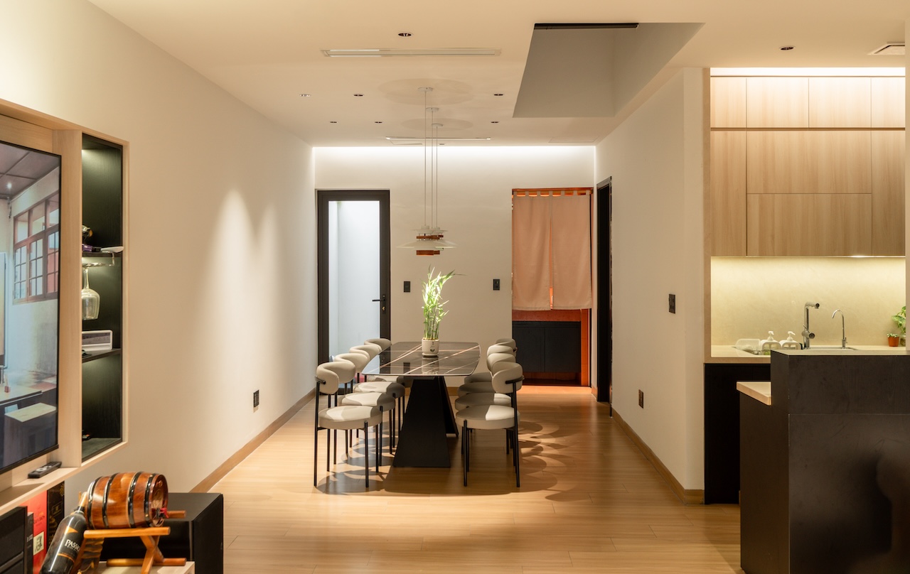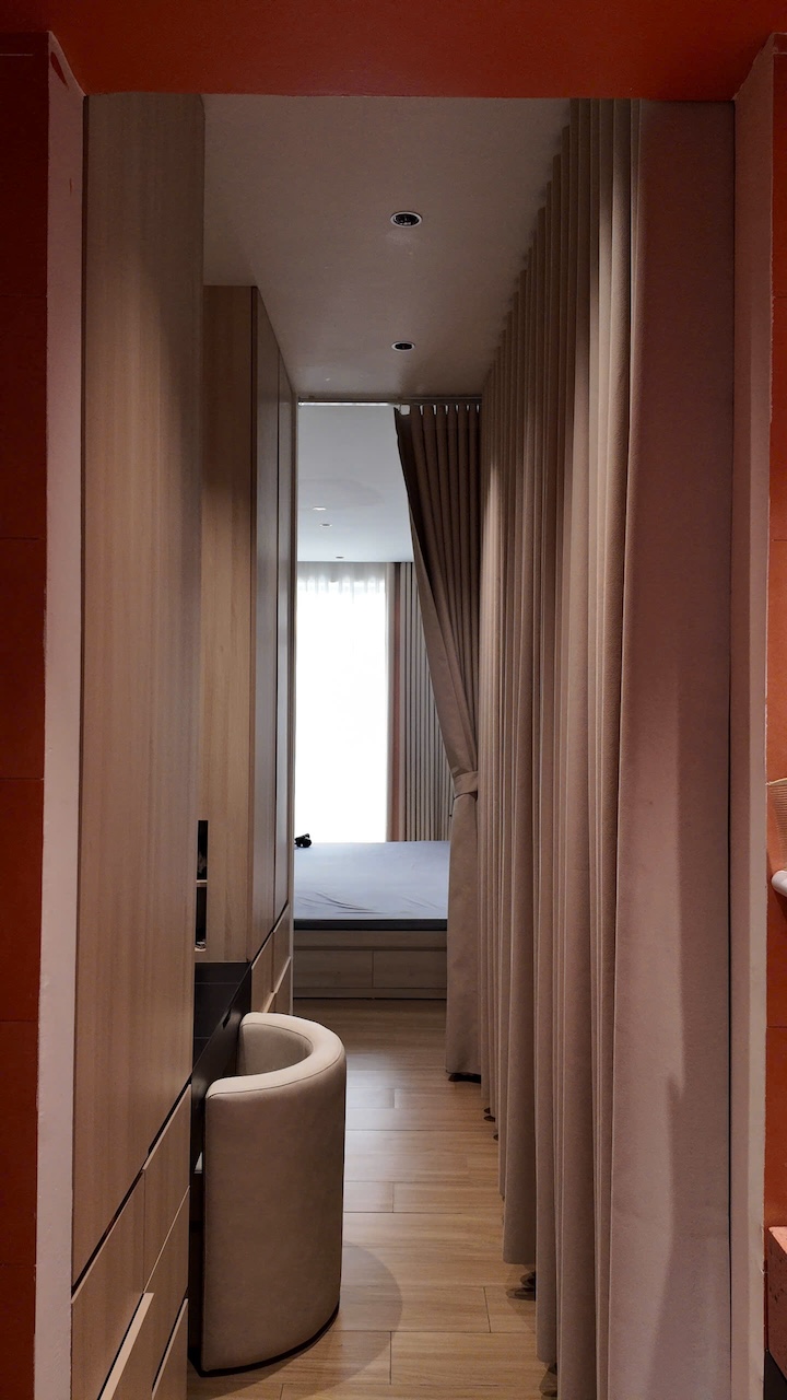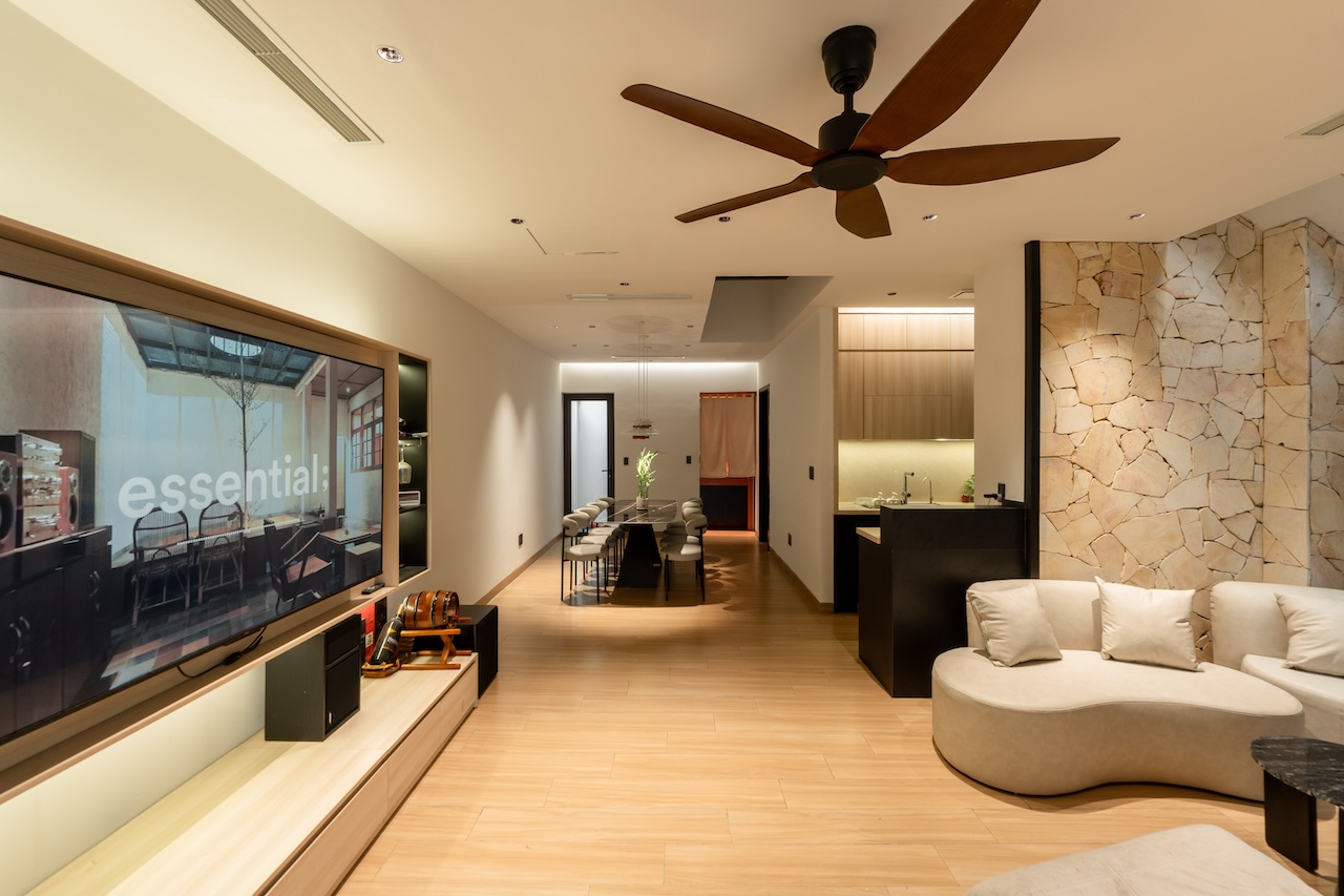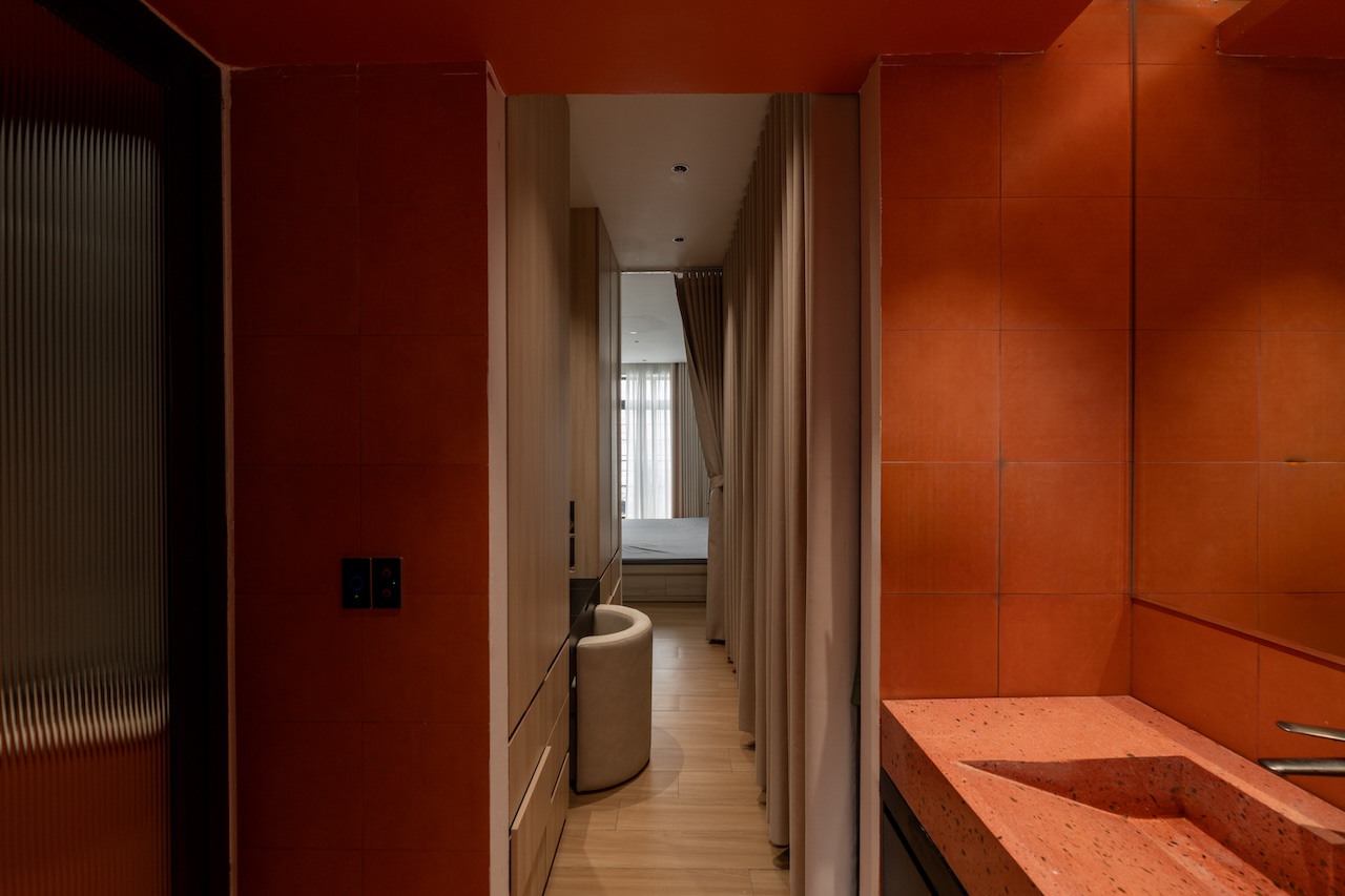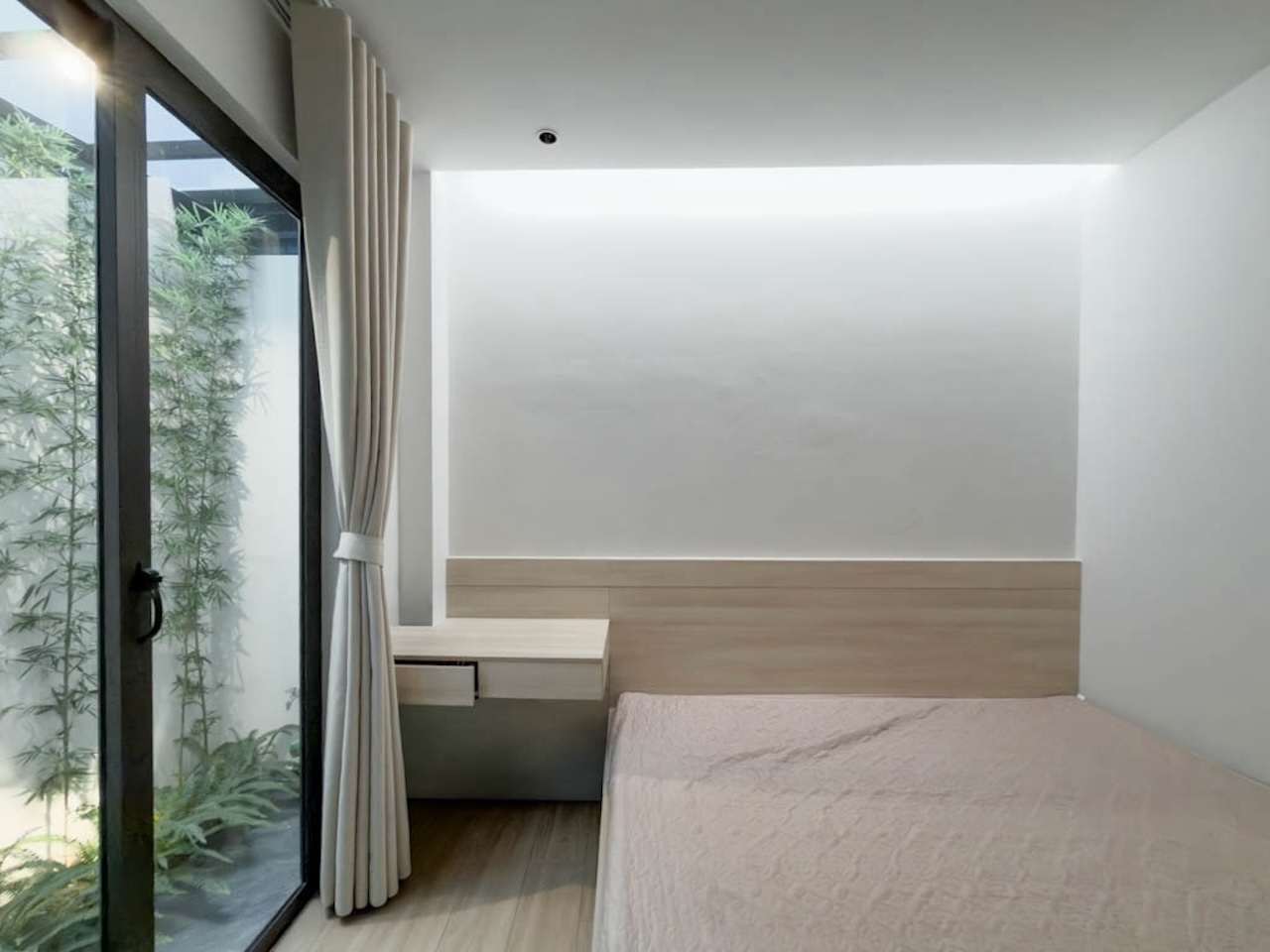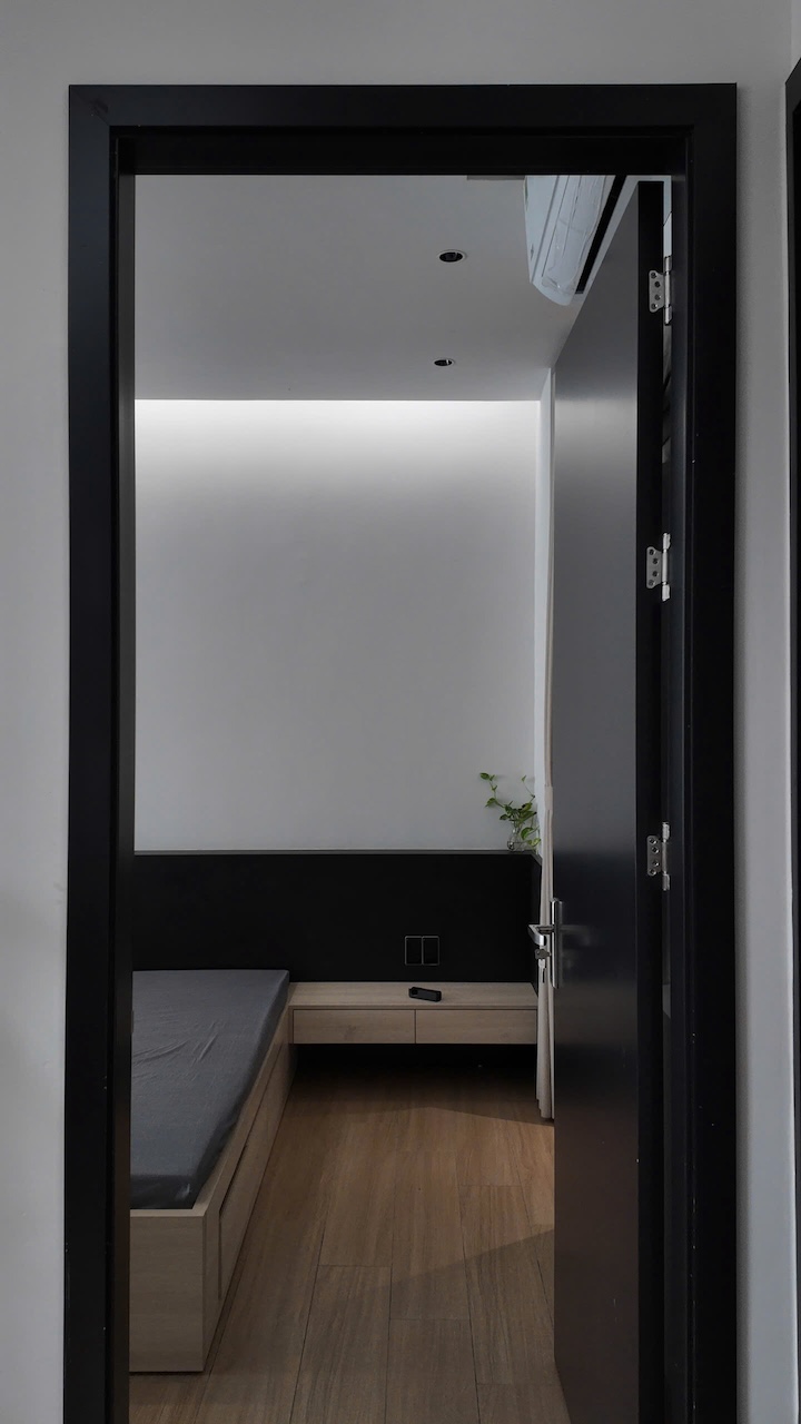 Sự tinh tế của công trình còn nằm ở cách sử dụng chất cảm vật liệu và ánh sáng trên nền màu trung tính chủ đạo. Điểm nhấn kiến trúc đầy thô mộc từ mảng tường đá tự nhiên chạy dọc lối cầu thang tạo nên sự đối lập thú vị với nét tinh giản của tổng thể, trong khi hệ thống chiếu sáng âm trần được tính toán tỉ mỉ để tạo ra các kịch bản cảm xúc và định hình khối không gian về đêm. Càng lên cao, ngôi nhà càng chuyển tiếp sang trạng thái tĩnh lặng và riêng tư tuyệt đối với không gian phòng ngủ tối giản. Tại đây, hệ cửa kính lớn đón trọn ánh sáng tự nhiên được lọc nhẹ nhàng qua các lớp rèm lụa, kết hợp cùng các chi tiết nội thất tinh gọn để tạo nên một chiều sâu thư giãn và bình yên đúng nghĩa.
