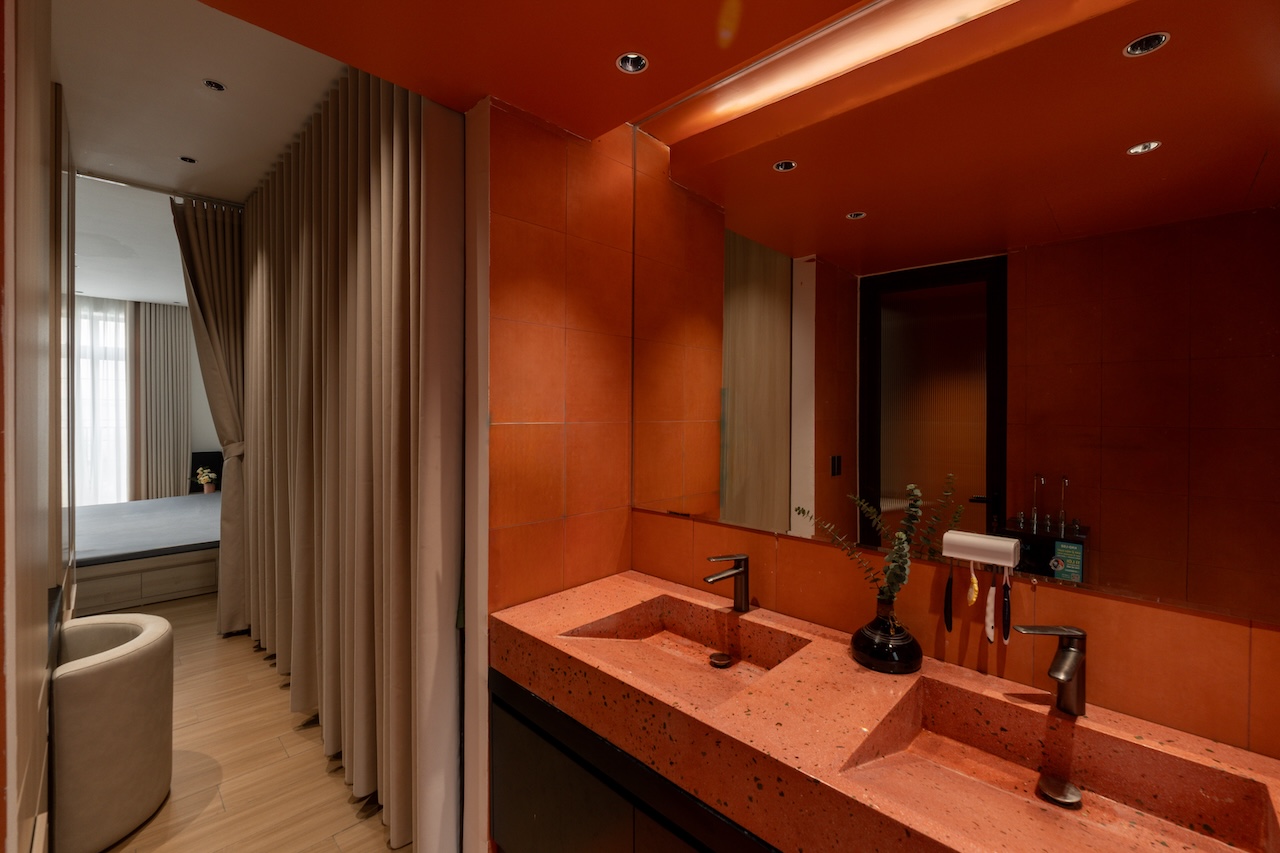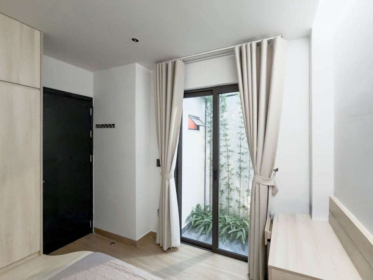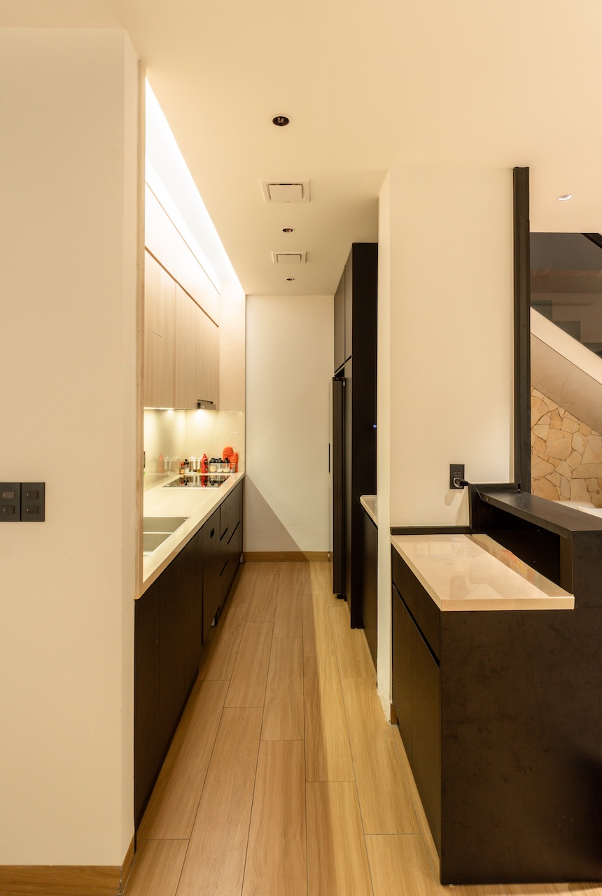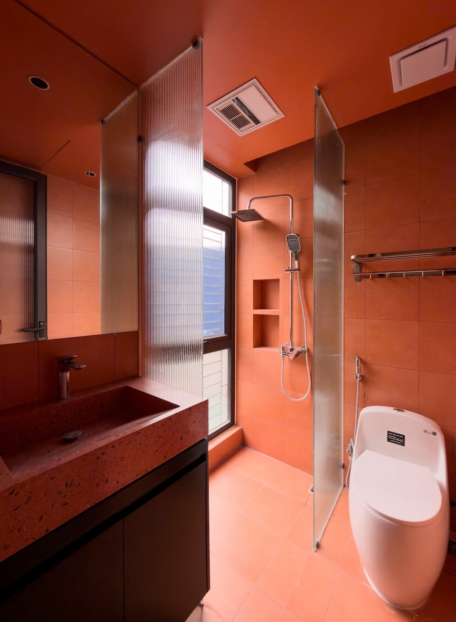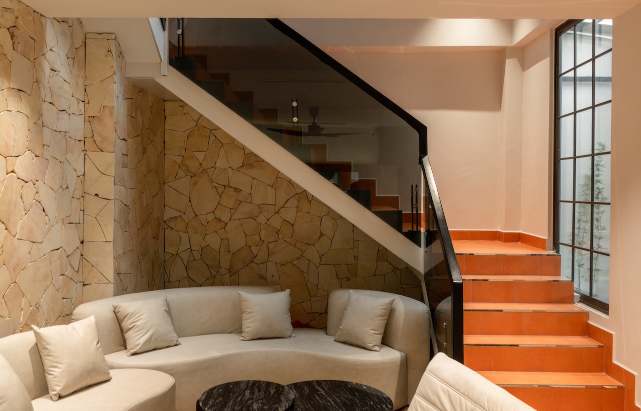 Sự tinh tế của công trình còn nằm ở cách sử dụng chất cảm vật liệu và ánh sáng trên nền màu trung tính chủ đạo. Điểm nhấn kiến trúc đầy thô mộc từ mảng tường đá tự nhiên chạy dọc lối cầu thang tạo nên sự đối lập thú vị với nét tinh giản của tổng thể, trong khi hệ thống chiếu sáng âm trần được tính toán tỉ mỉ để tạo ra các kịch bản cảm xúc và định hình khối không gian về đêm. Càng lên cao, ngôi nhà càng chuyển tiếp sang trạng thái tĩnh lặng và riêng tư tuyệt đối với không gian phòng ngủ tối giản. Tại đây, hệ cửa kính lớn đón trọn ánh sáng tự nhiên được lọc nhẹ nhàng qua các lớp rèm lụa, kết hợp cùng các chi tiết nội thất tinh gọn để tạo nên một chiều sâu thư giãn và bình yên đúng nghĩa.
