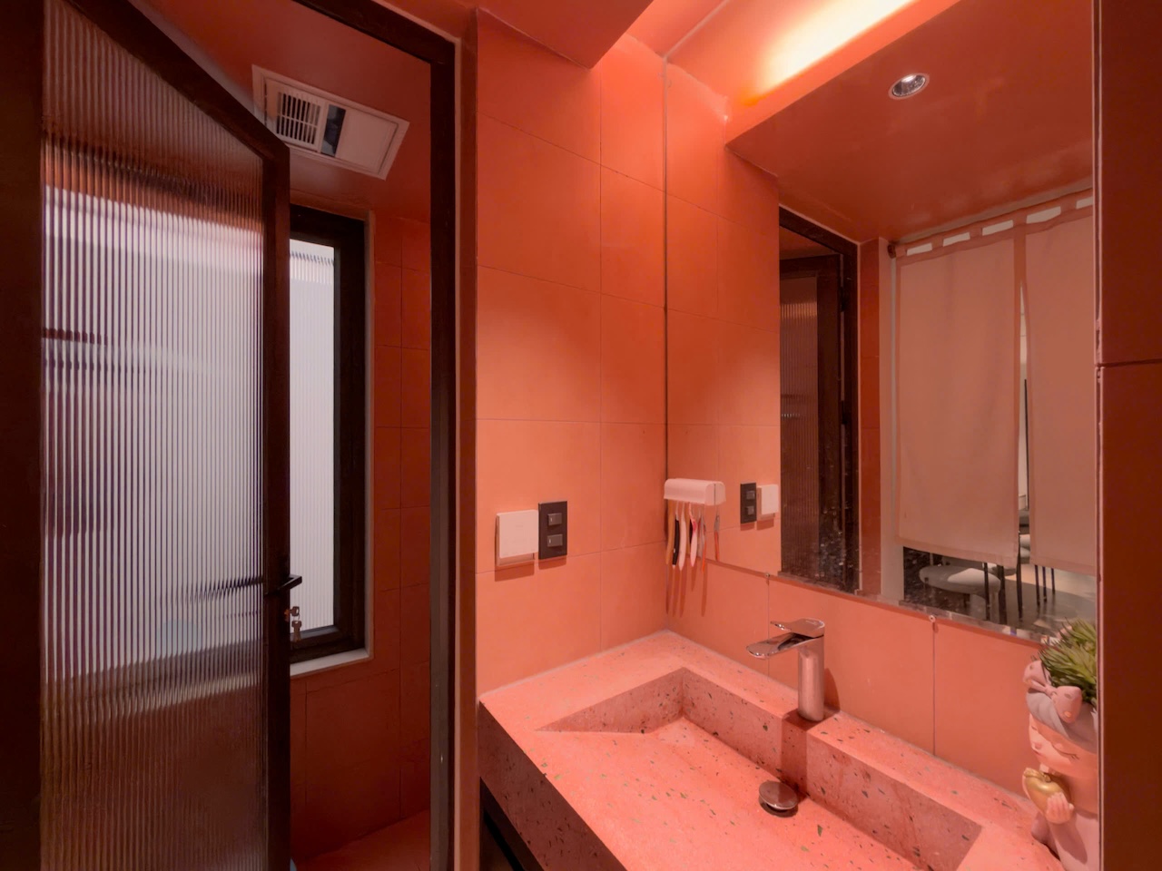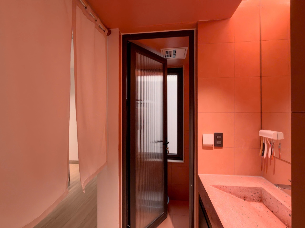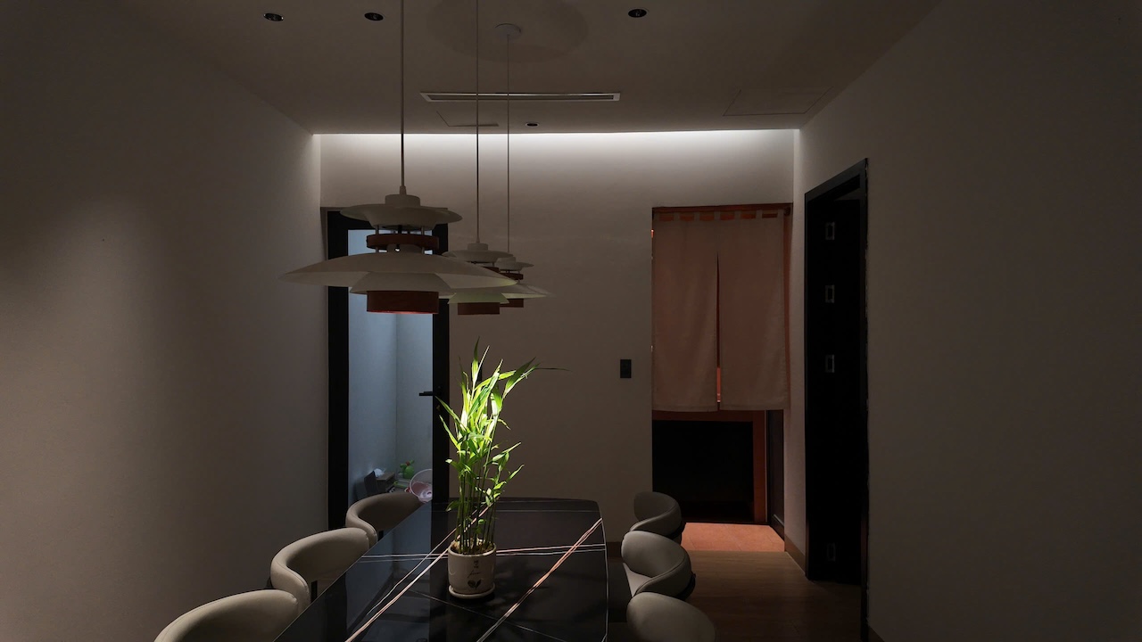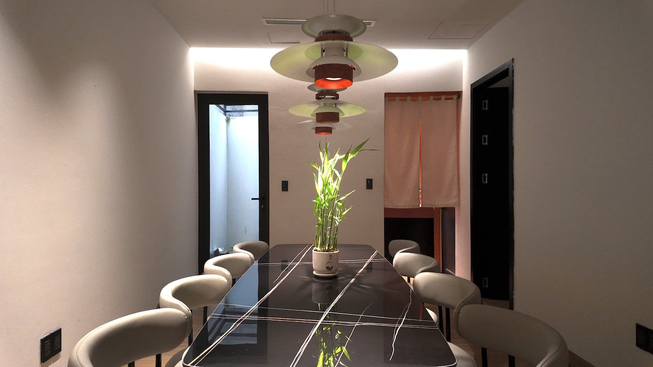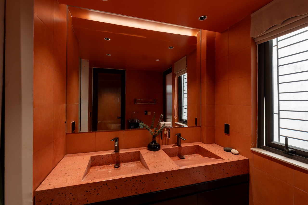 Sự tinh tế của công trình còn nằm ở cách sử dụng chất cảm vật liệu và ánh sáng trên nền màu trung tính chủ đạo. Điểm nhấn kiến trúc đầy thô mộc từ mảng tường đá tự nhiên chạy dọc lối cầu thang tạo nên sự đối lập thú vị với nét tinh giản của tổng thể, trong khi hệ thống chiếu sáng âm trần được tính toán tỉ mỉ để tạo ra các kịch bản cảm xúc và định hình khối không gian về đêm. Càng lên cao, ngôi nhà càng chuyển tiếp sang trạng thái tĩnh lặng và riêng tư tuyệt đối với không gian phòng ngủ tối giản. Tại đây, hệ cửa kính lớn đón trọn ánh sáng tự nhiên được lọc nhẹ nhàng qua các lớp rèm lụa, kết hợp cùng các chi tiết nội thất tinh gọn để tạo nên một chiều sâu thư giãn và bình yên đúng nghĩa.