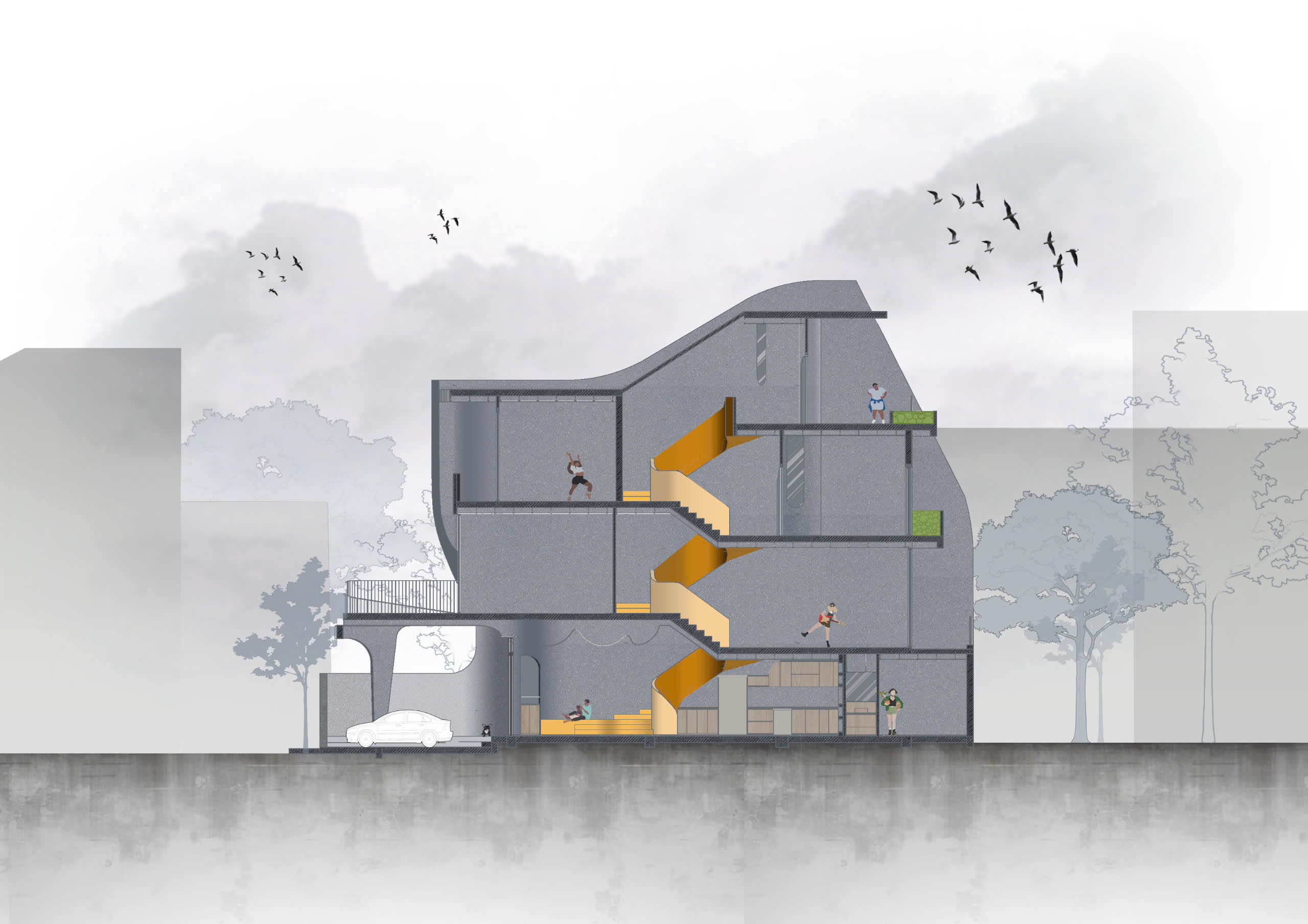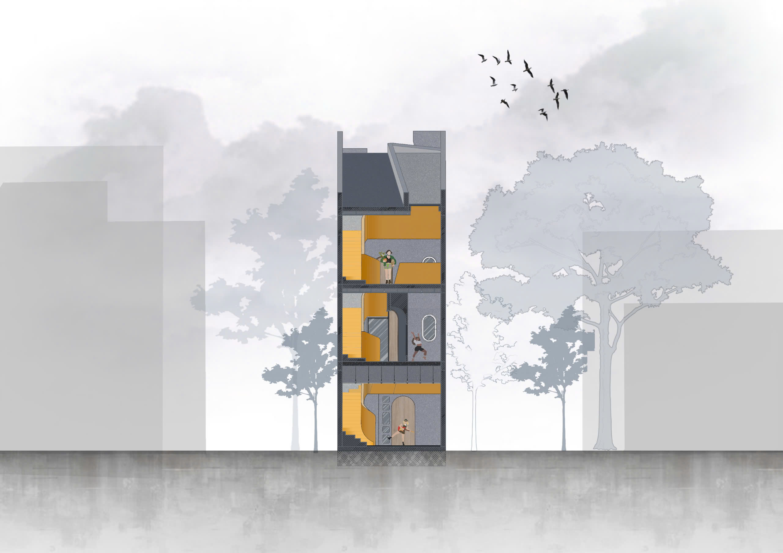Để thích ứng hiệu quả với khí hậu nóng ẩm đặc trưng của miền Trung, ngôi nhà được trang bị các “lớp đệm” sân trước và sân sau nhằm giảm thiểu bức xạ mặt trời và thiết lập dòng gió tự nhiên lưu thông xuyên suốt. Hệ giếng trời tại trung tâm phối hợp cùng cấu trúc lệch tầng đóng vai trò như một bộ máy đối lưu không khí theo phương đứng, cung cấp nguồn sáng ổn định cho khu vực bếp ăn và giữ cho toàn bộ công trình luôn duy trì được sự mát mẻ. Giải pháp kiến trúc này đã giải quyết triệt để bài toán bí khí và thiếu sáng của những ngôi nhà ống có bề ngang hẹp, thay thế sự ngột ngạt bằng một bầu không khí trong lành, nơi mọi ngóc ngách đều có thể chạm vào nắng và gió trời bất chấp mật độ cư dân dày đặc xung quanh.