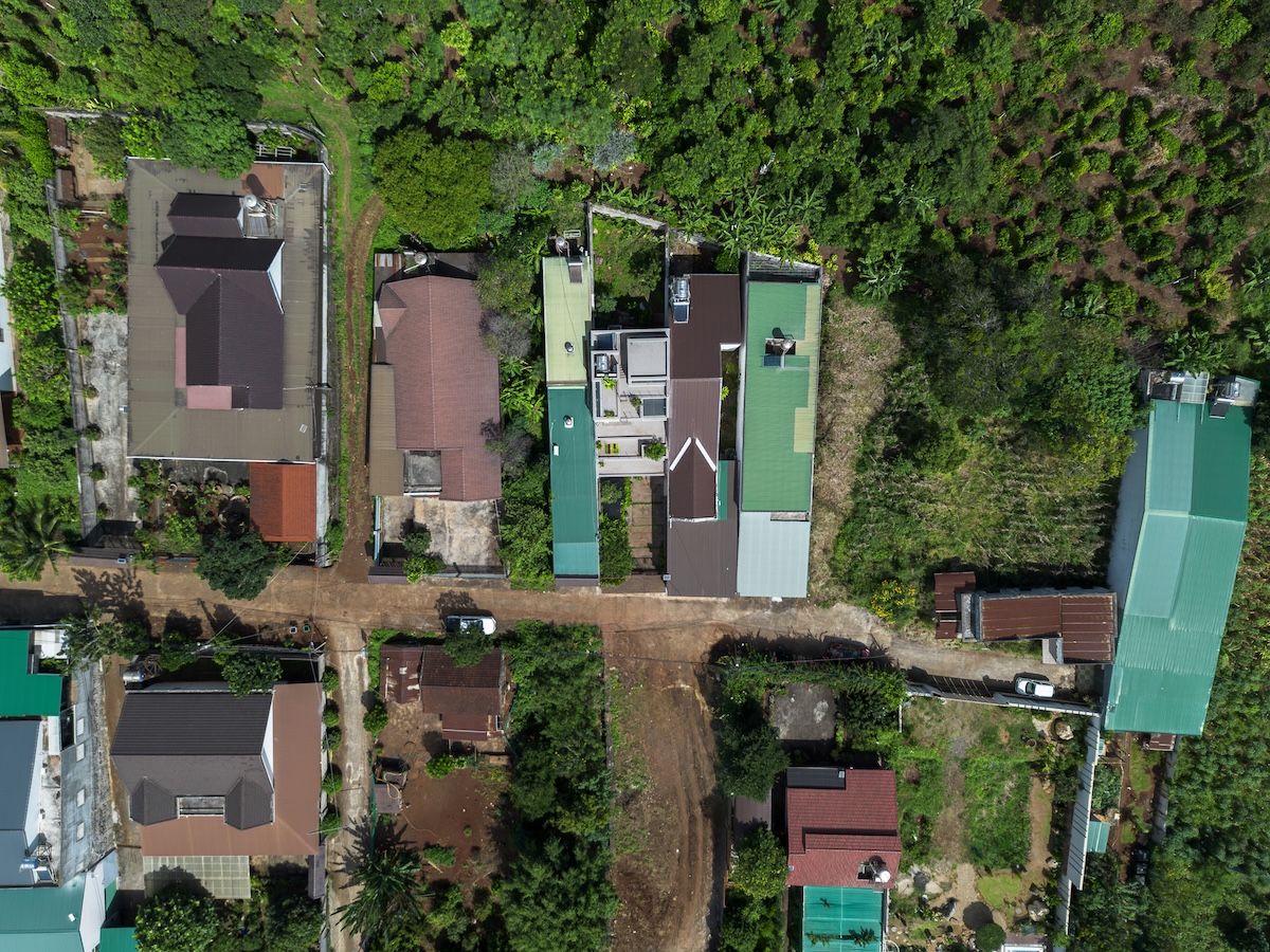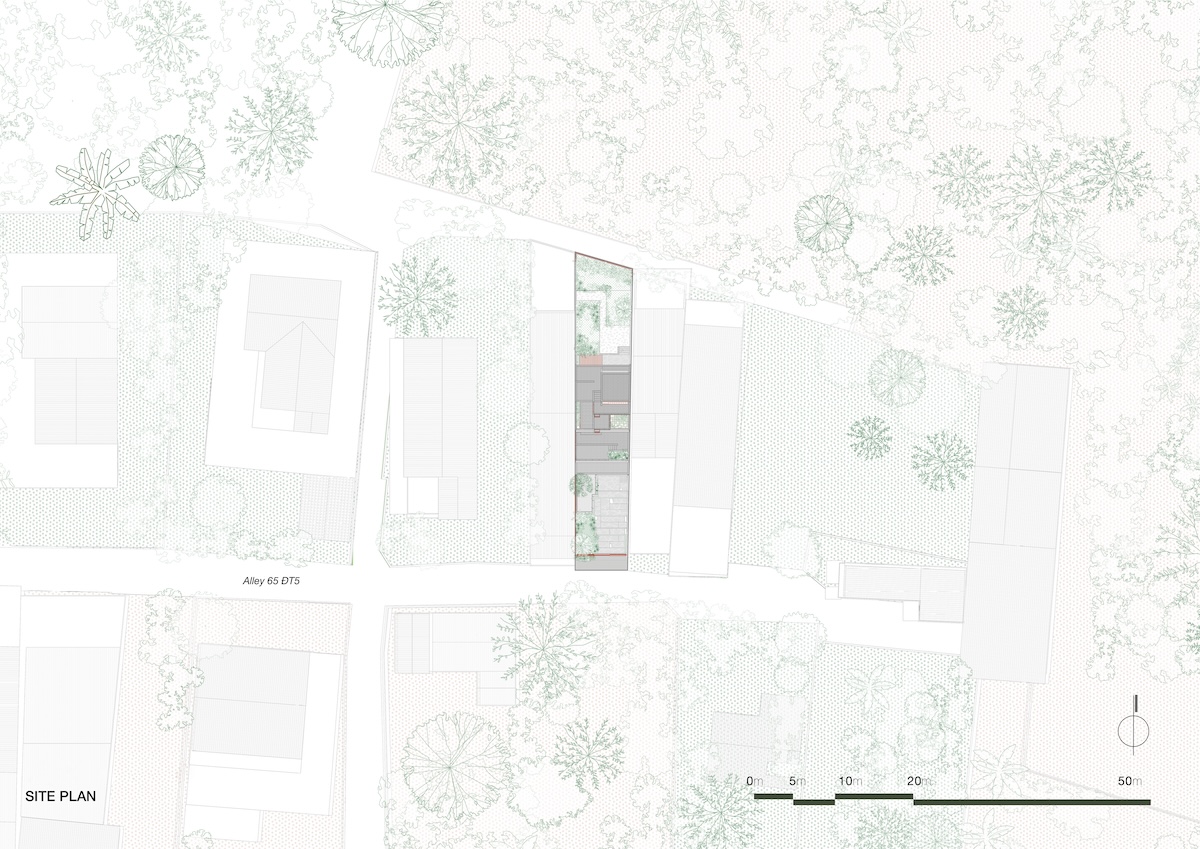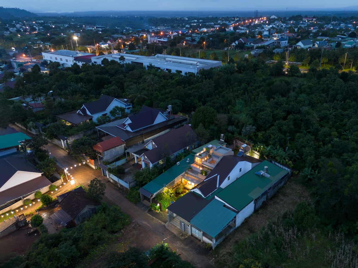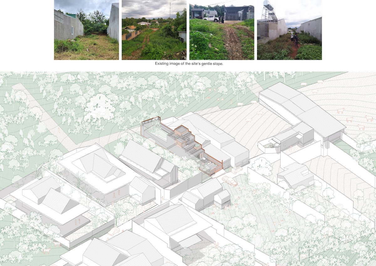 Ngôi nhà tọa lạc tại vùng ven đô Buôn Ma Thuột, trên khu đất có kích thước 7×40 mét, thoải nhẹ về phía thung lũng. Được thiết kế cho một gia đình trẻ bốn người, công trình chọn lối tiếp cận “vừa đủ” thay vì chạy theo xu hướng xây dựng dày đặc phổ biến trong khu vực. Giải pháp kiến trúc được định hình dựa trên địa hình tự nhiên và nếp sinh hoạt hằng ngày của gia đình.