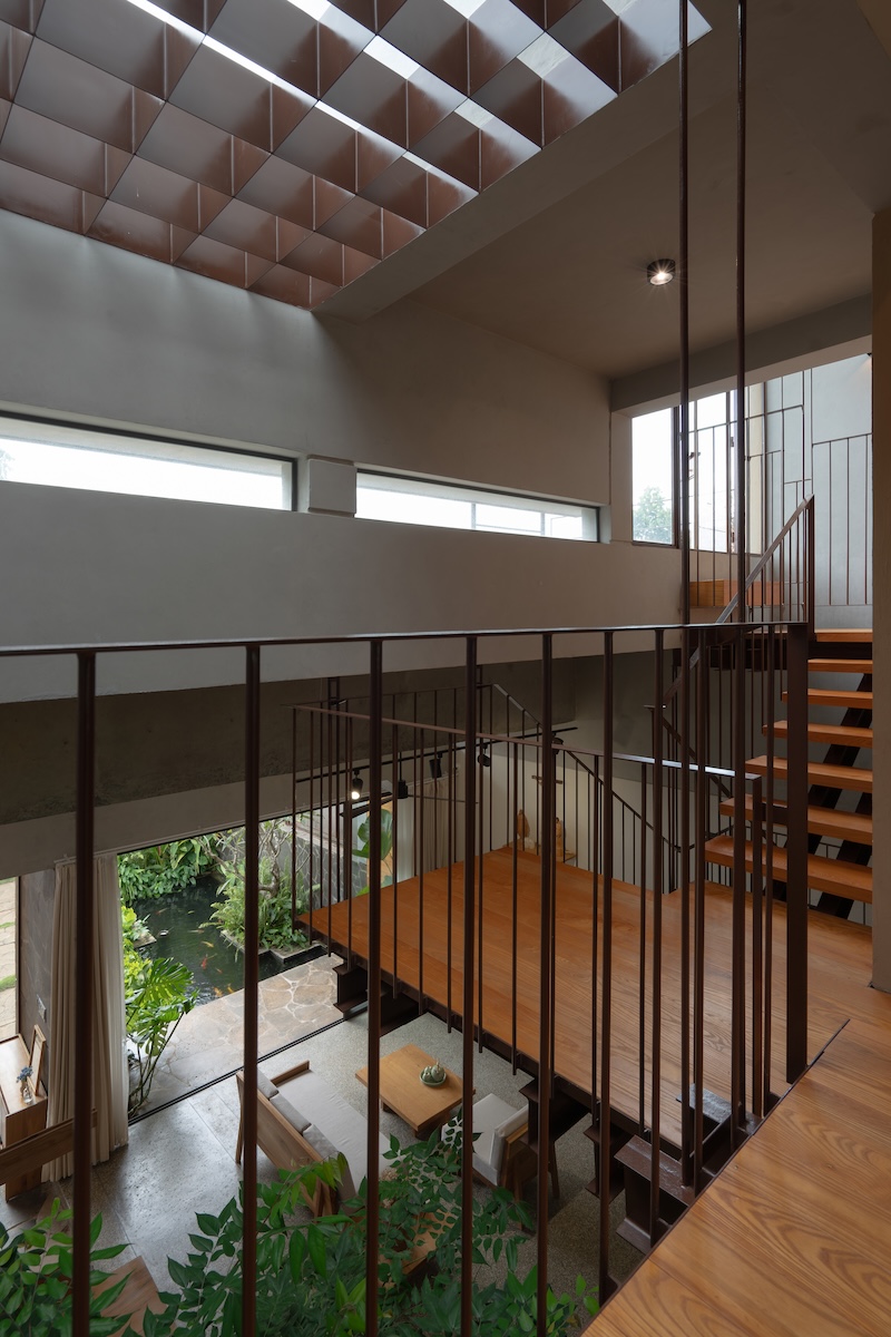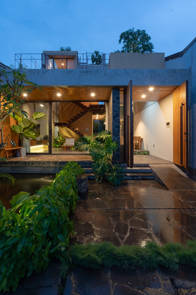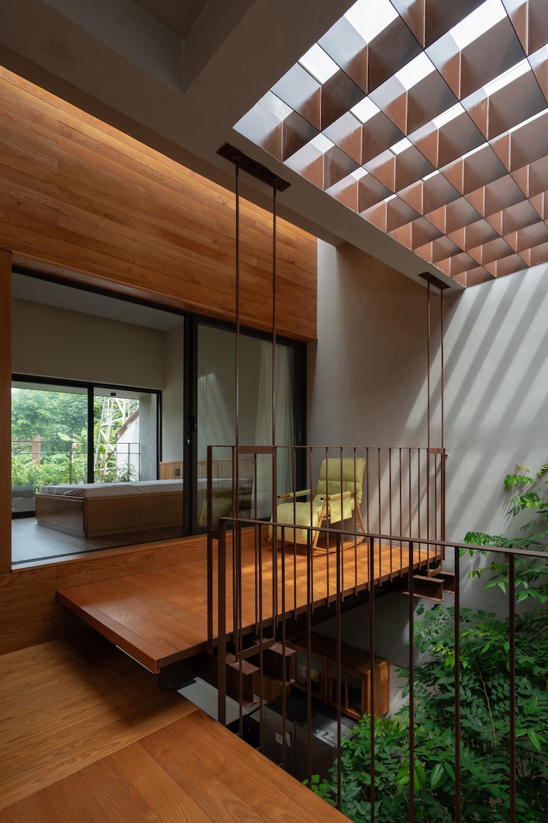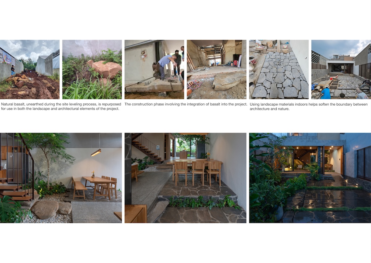 Thiết kế mái phẳng được chia nhỏ theo độ dốc của khu dân cư xung quanh nhưng vẫn giữ hình khối ngang đặc trưng, từ đó tạo ra những khu vườn trên mái dành cho các hoạt động ngoài trời của gia đình. Sự kết hợp giữa vật liệu thô mộc như đá tự nhiên với các chi tiết hoàn thiện tinh tế như gỗ và terrazzo, cùng ánh sáng tự nhiên được bố trí khéo léo, tạo nên những tương phản về chất liệu và sắc độ. Những đối lập này mang lại chiều sâu cảm xúc và trải nghiệm không gian phong phú cho người sử dụng.