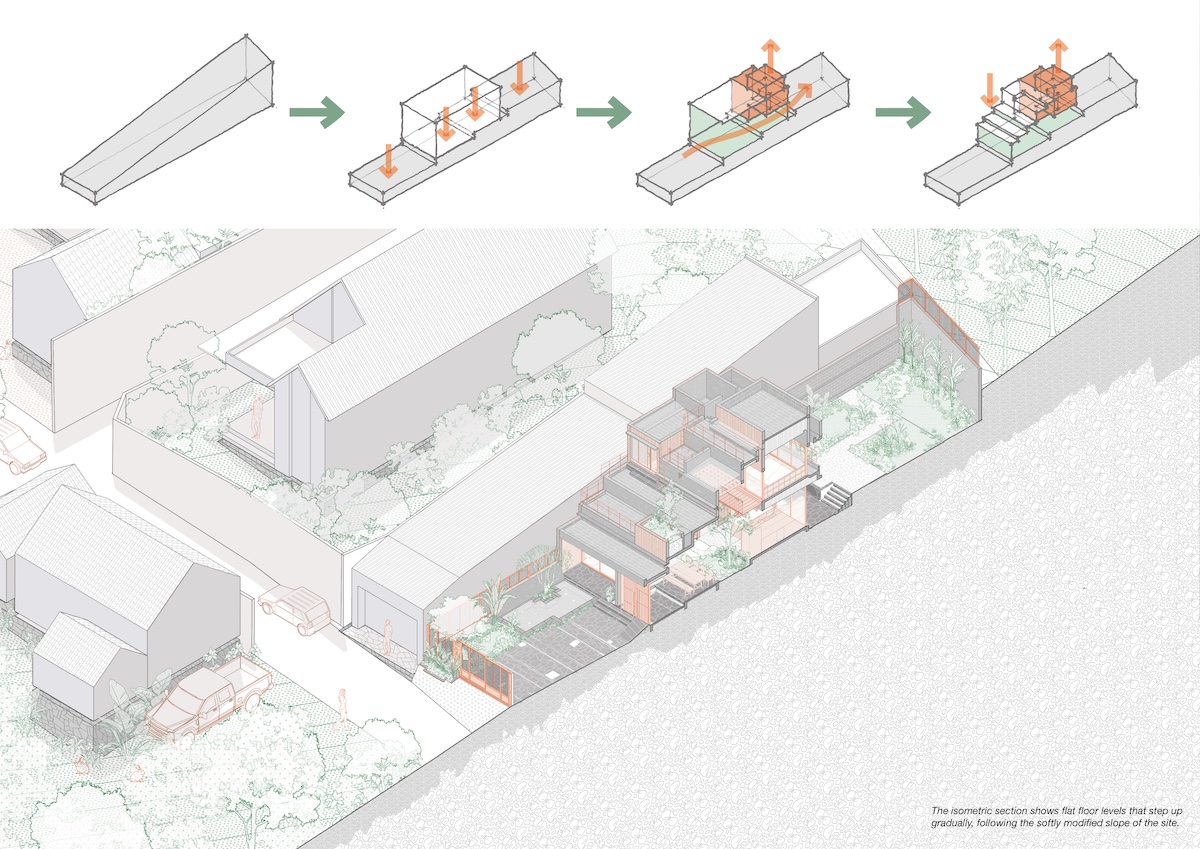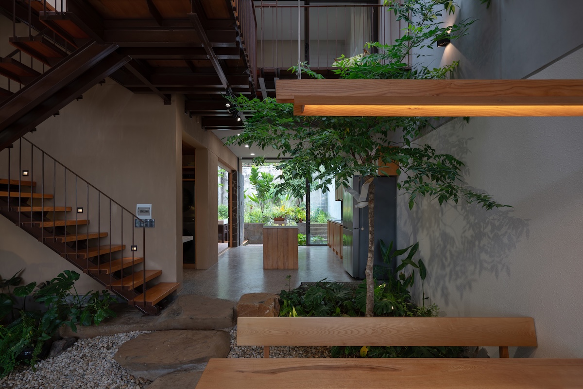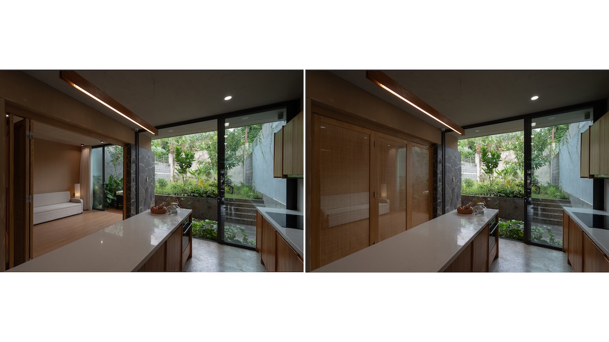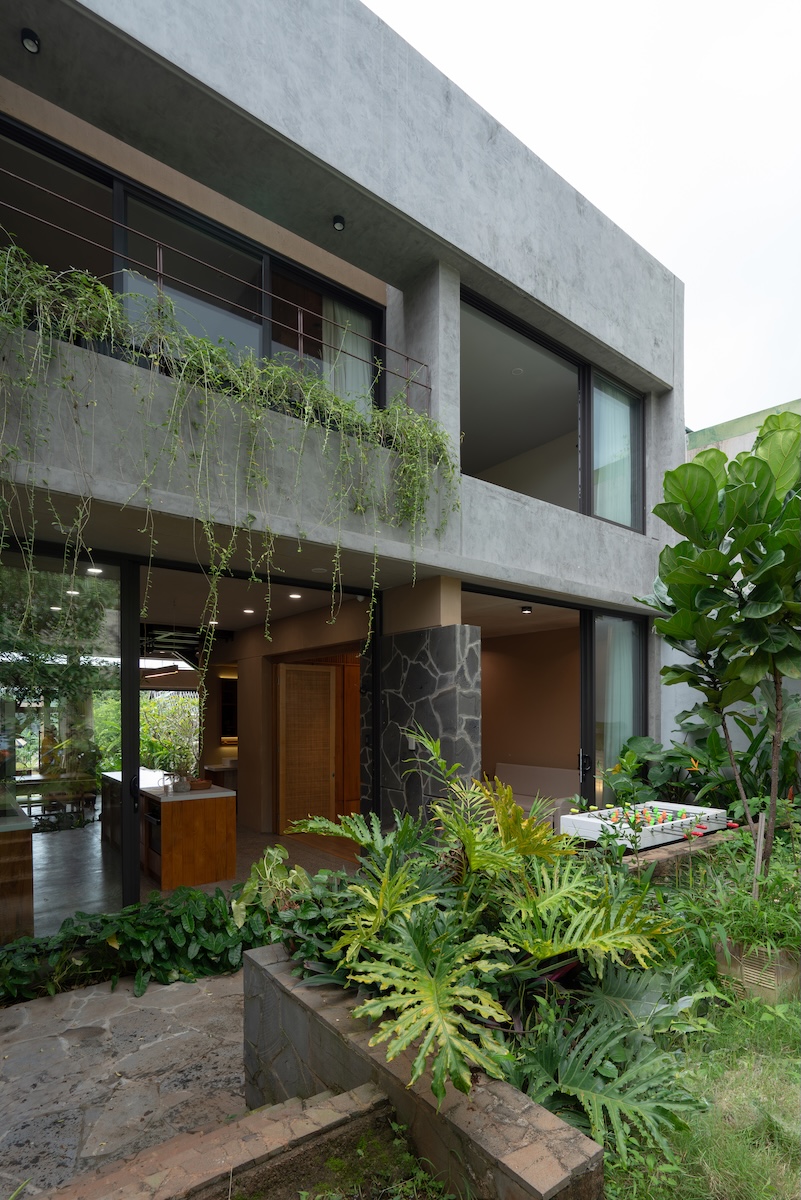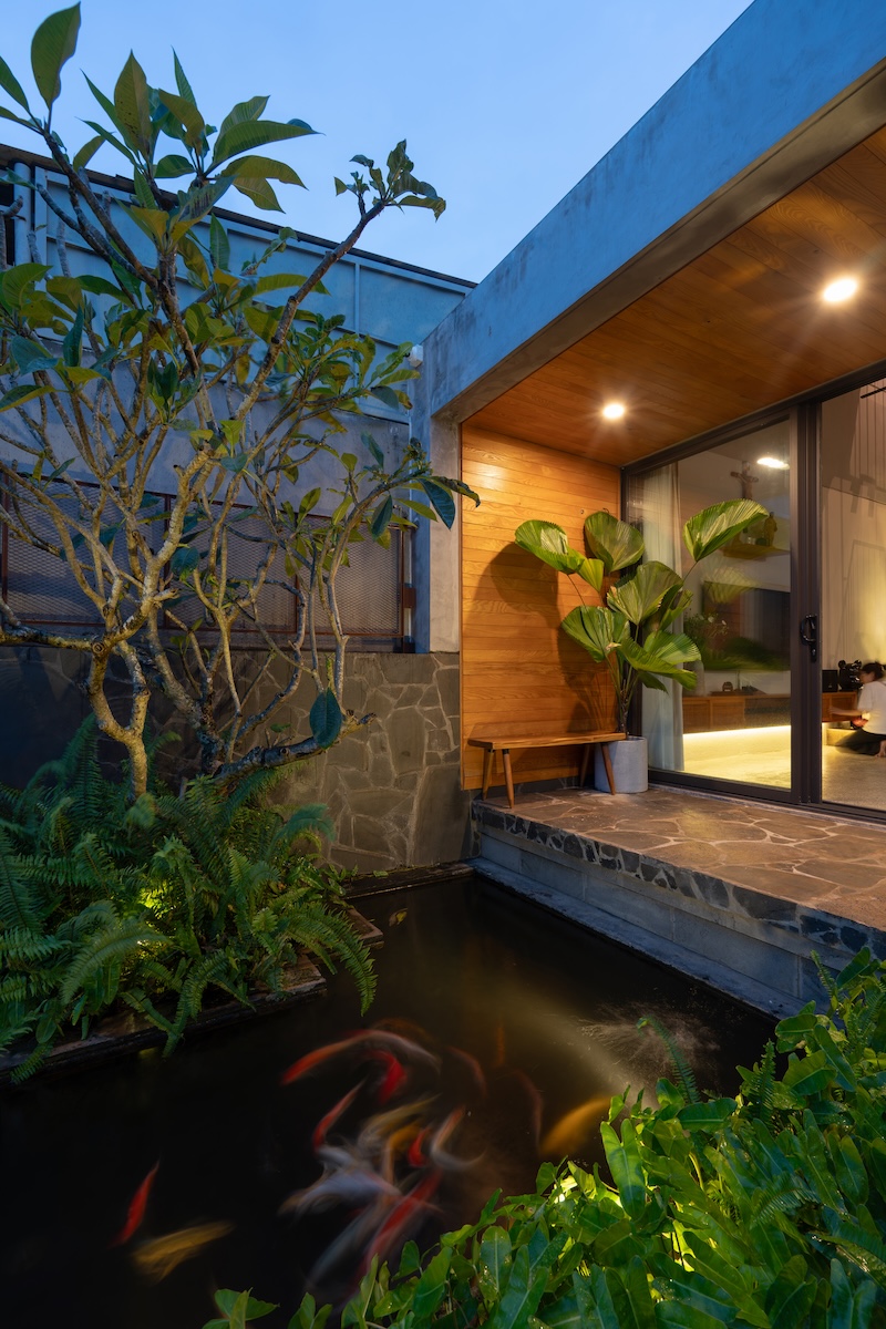 Thiết kế mái phẳng được chia nhỏ theo độ dốc của khu dân cư xung quanh nhưng vẫn giữ hình khối ngang đặc trưng, từ đó tạo ra những khu vườn trên mái dành cho các hoạt động ngoài trời của gia đình. Sự kết hợp giữa vật liệu thô mộc như đá tự nhiên với các chi tiết hoàn thiện tinh tế như gỗ và terrazzo, cùng ánh sáng tự nhiên được bố trí khéo léo, tạo nên những tương phản về chất liệu và sắc độ. Những đối lập này mang lại chiều sâu cảm xúc và trải nghiệm không gian phong phú cho người sử dụng.
