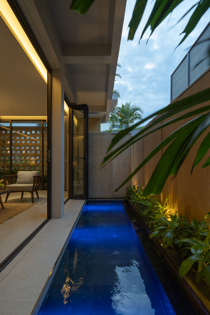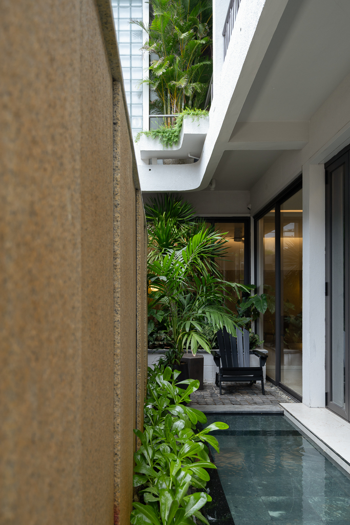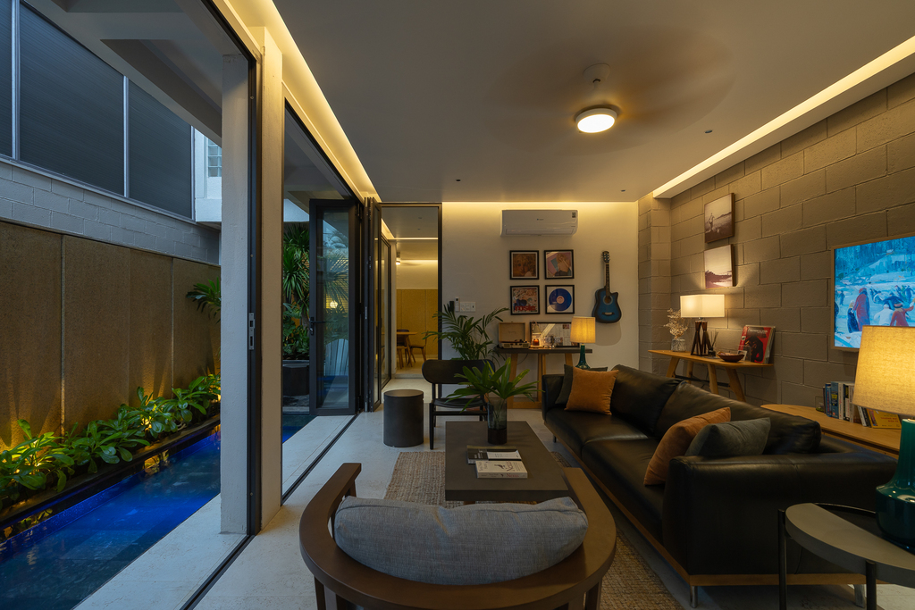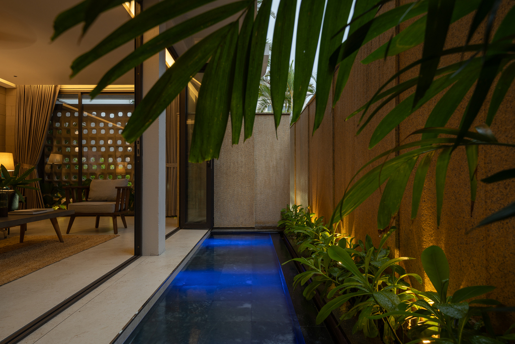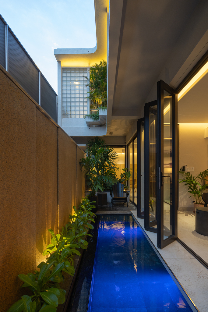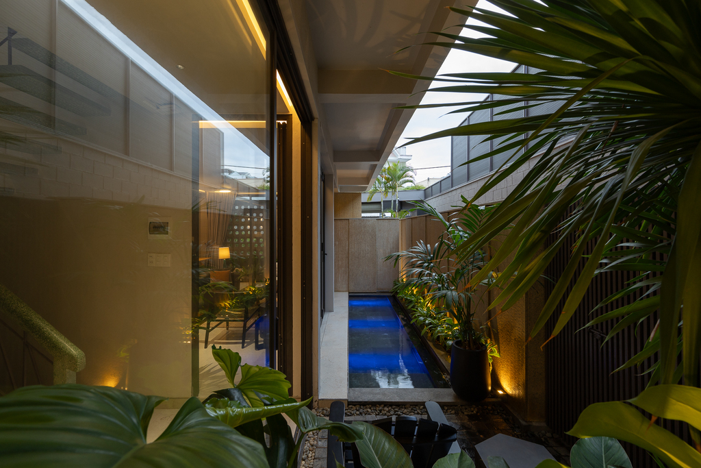 Từ cấu trúc nhà ở truyền thống, công trình được cải tạo thành villa cho thuê với đầy đủ các không gian chức năng: 4 phòng ngủ, khu khách – bếp riêng biệt, hồ tràn dạng hồ bơi, gara ô tô, khu giặt phơi, cùng hệ giếng trời và sân vườn giúp cải thiện vi khí hậu.