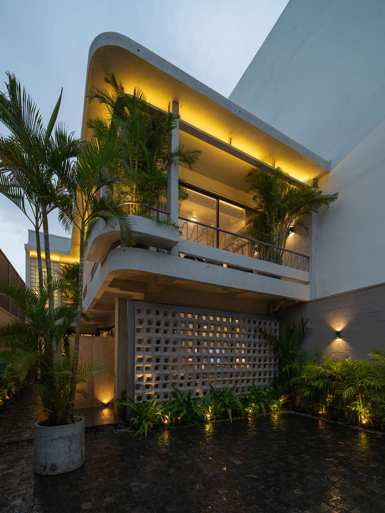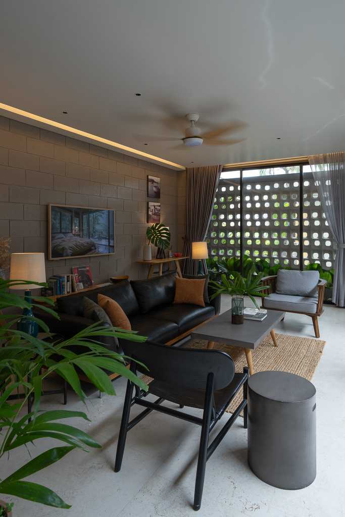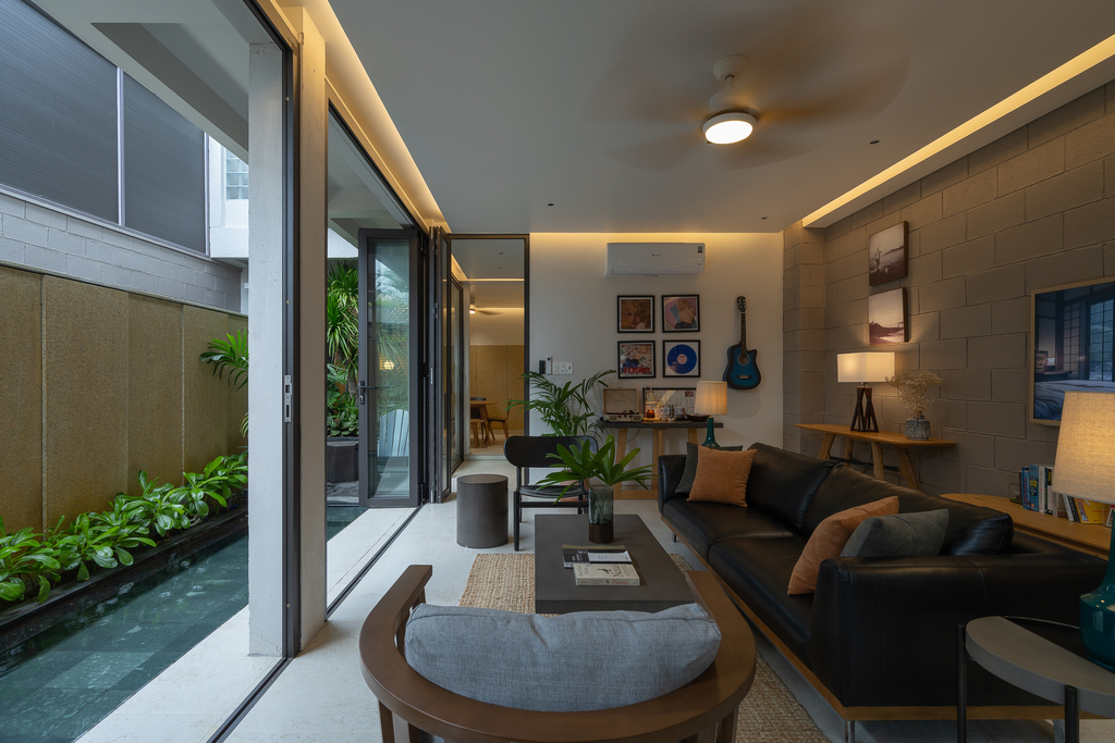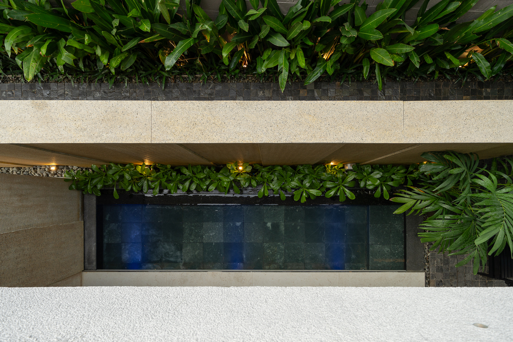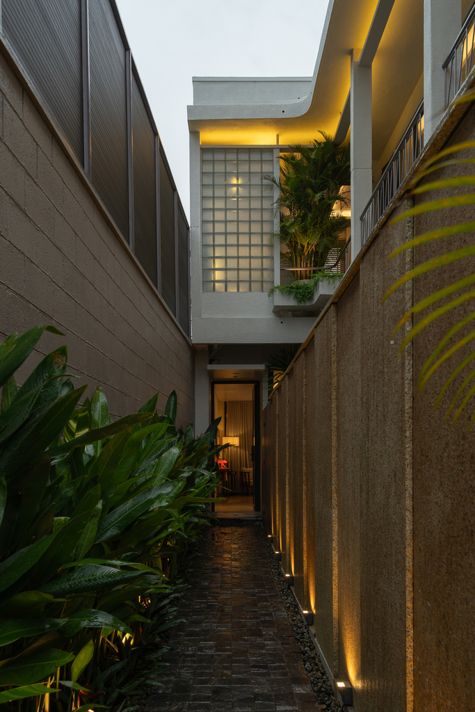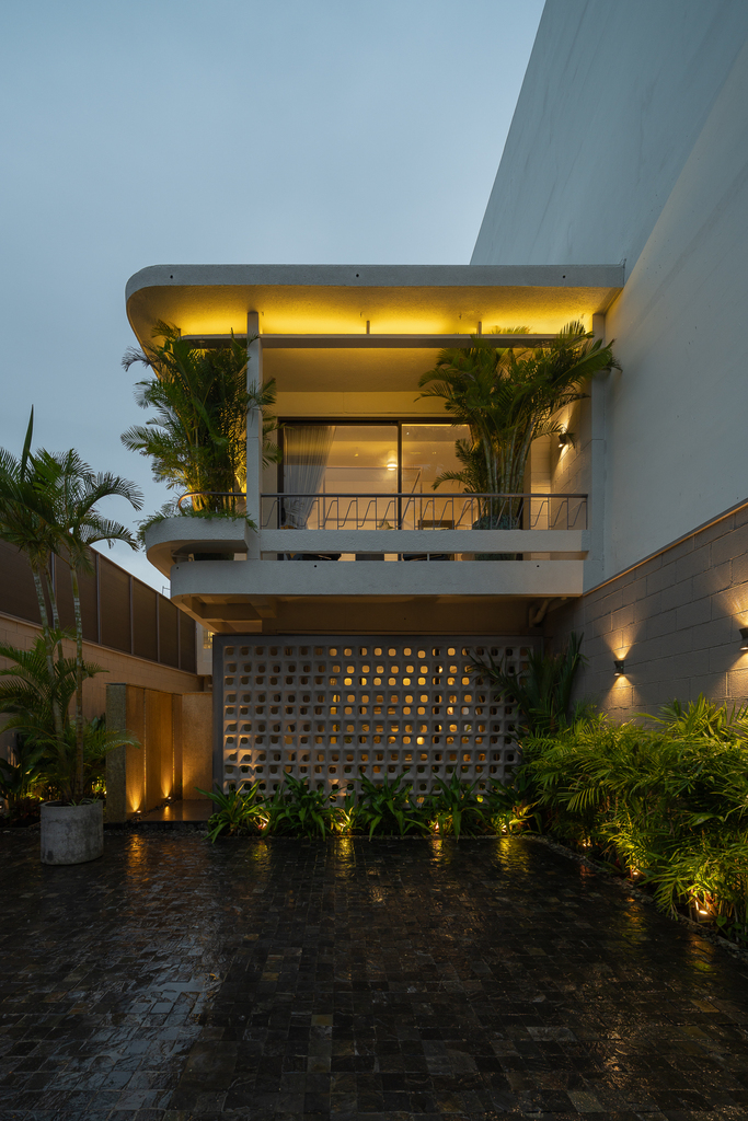 Từ cấu trúc nhà ở truyền thống, công trình được cải tạo thành villa cho thuê với đầy đủ các không gian chức năng: 4 phòng ngủ, khu khách – bếp riêng biệt, hồ tràn dạng hồ bơi, gara ô tô, khu giặt phơi, cùng hệ giếng trời và sân vườn giúp cải thiện vi khí hậu.