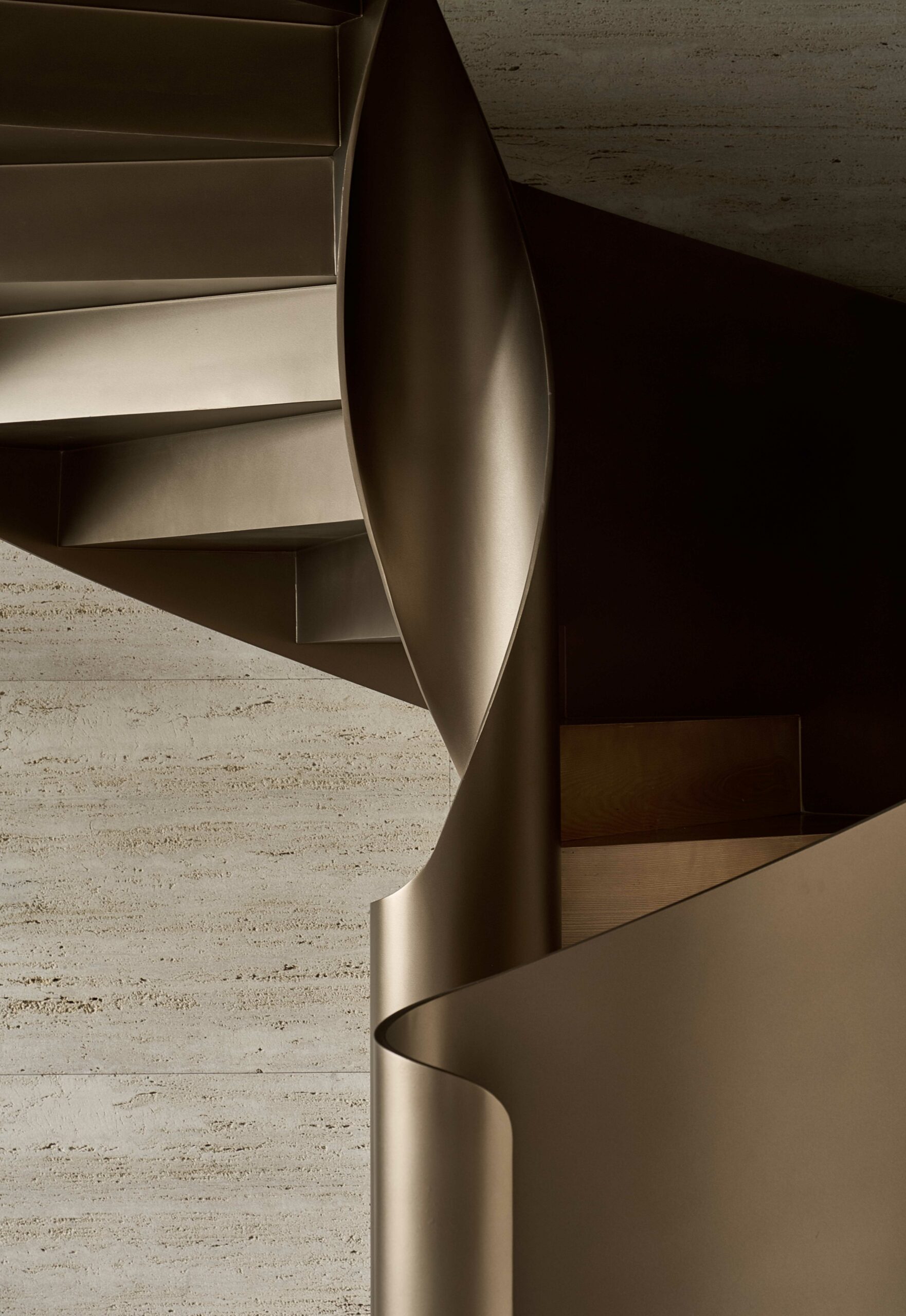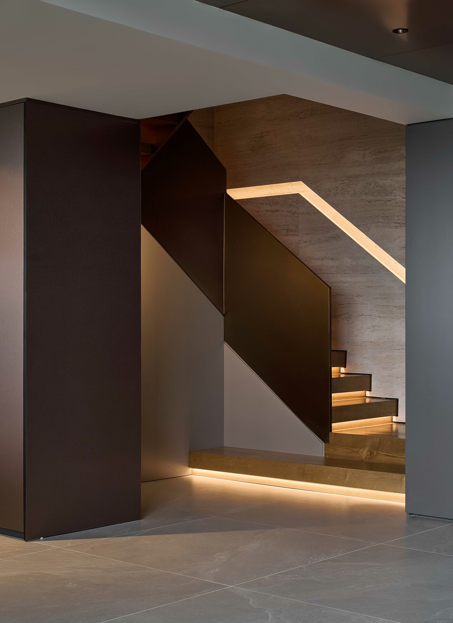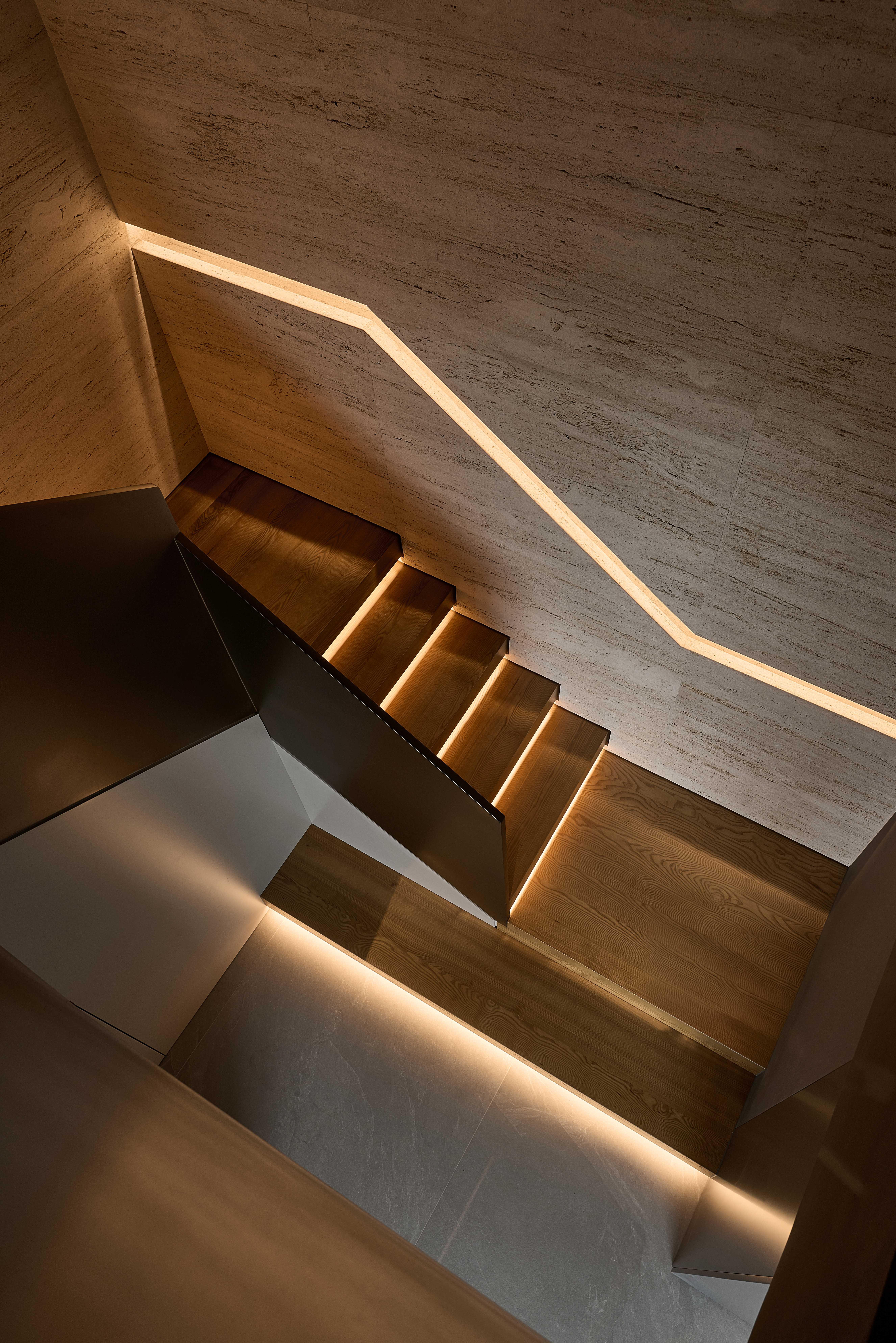 Một trục giao thông trung tâm định hình bố cục, chia công trình thành hai phần: các không gian chức năng chính nằm một bên, trong khi bên còn lại mở ra tầm nhìn rộng đẹp xuống cảnh quan thành phố. Ở hai đầu, một cầu thang vuông và một cầu thang xoắn tạo kết nối liên tục giữa hai tầng, cho phép dòng lưu thông xuyên suốt toàn bộ công trình.