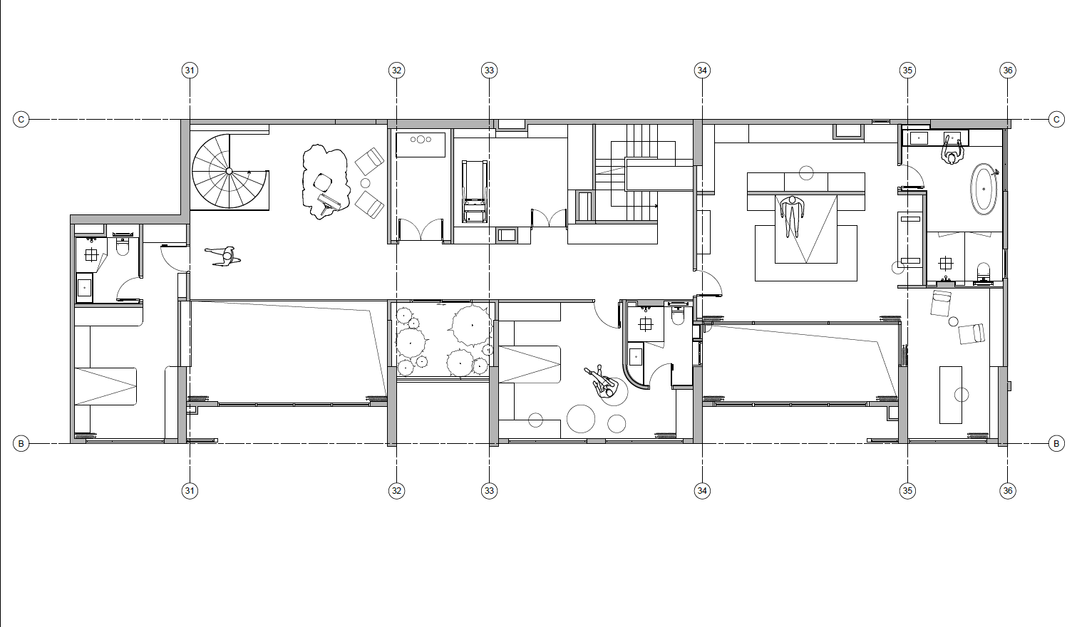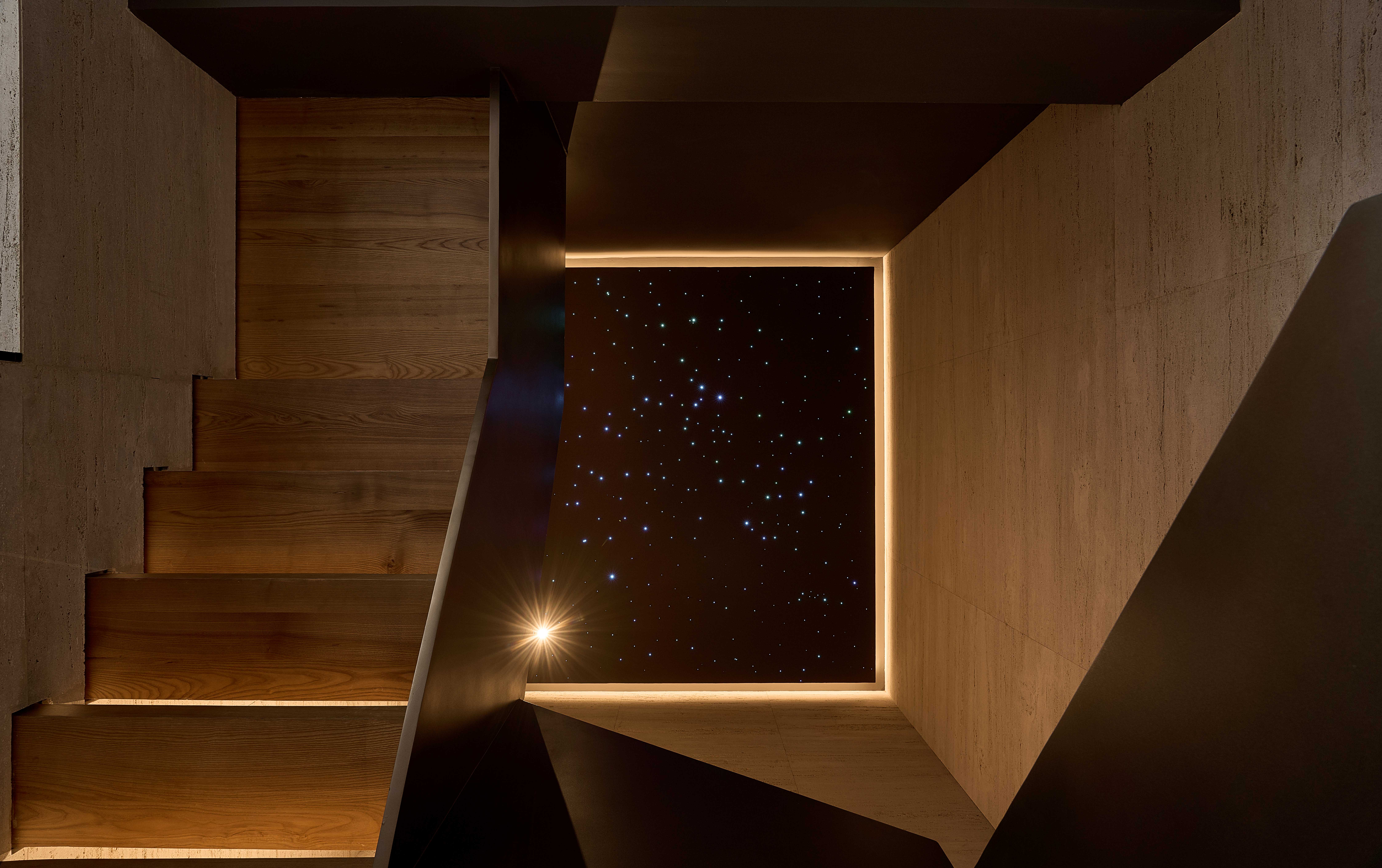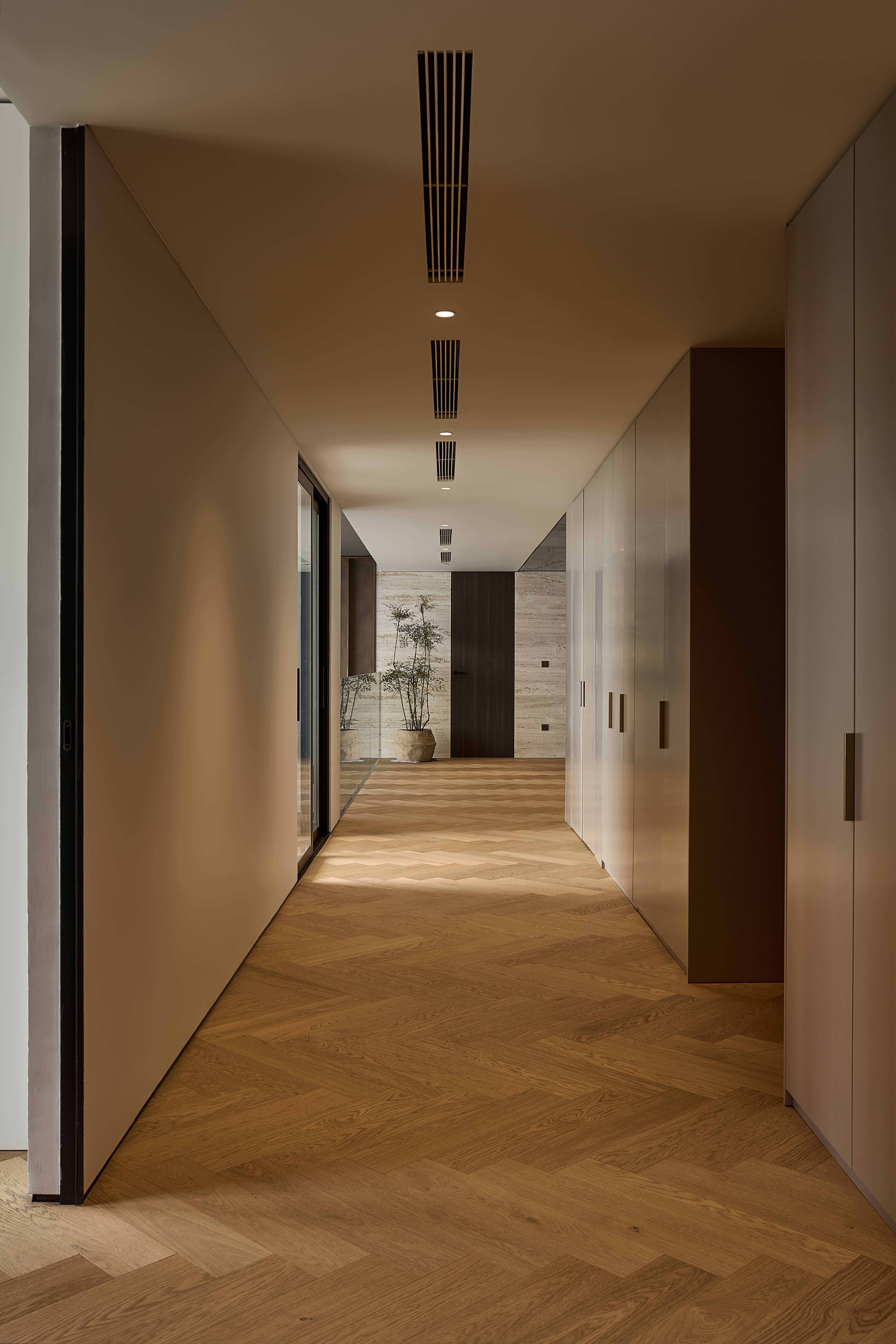 Một trục giao thông trung tâm định hình bố cục, chia công trình thành hai phần: các không gian chức năng chính nằm một bên, trong khi bên còn lại mở ra tầm nhìn rộng đẹp xuống cảnh quan thành phố. Ở hai đầu, một cầu thang vuông và một cầu thang xoắn tạo kết nối liên tục giữa hai tầng, cho phép dòng lưu thông xuyên suốt toàn bộ công trình.