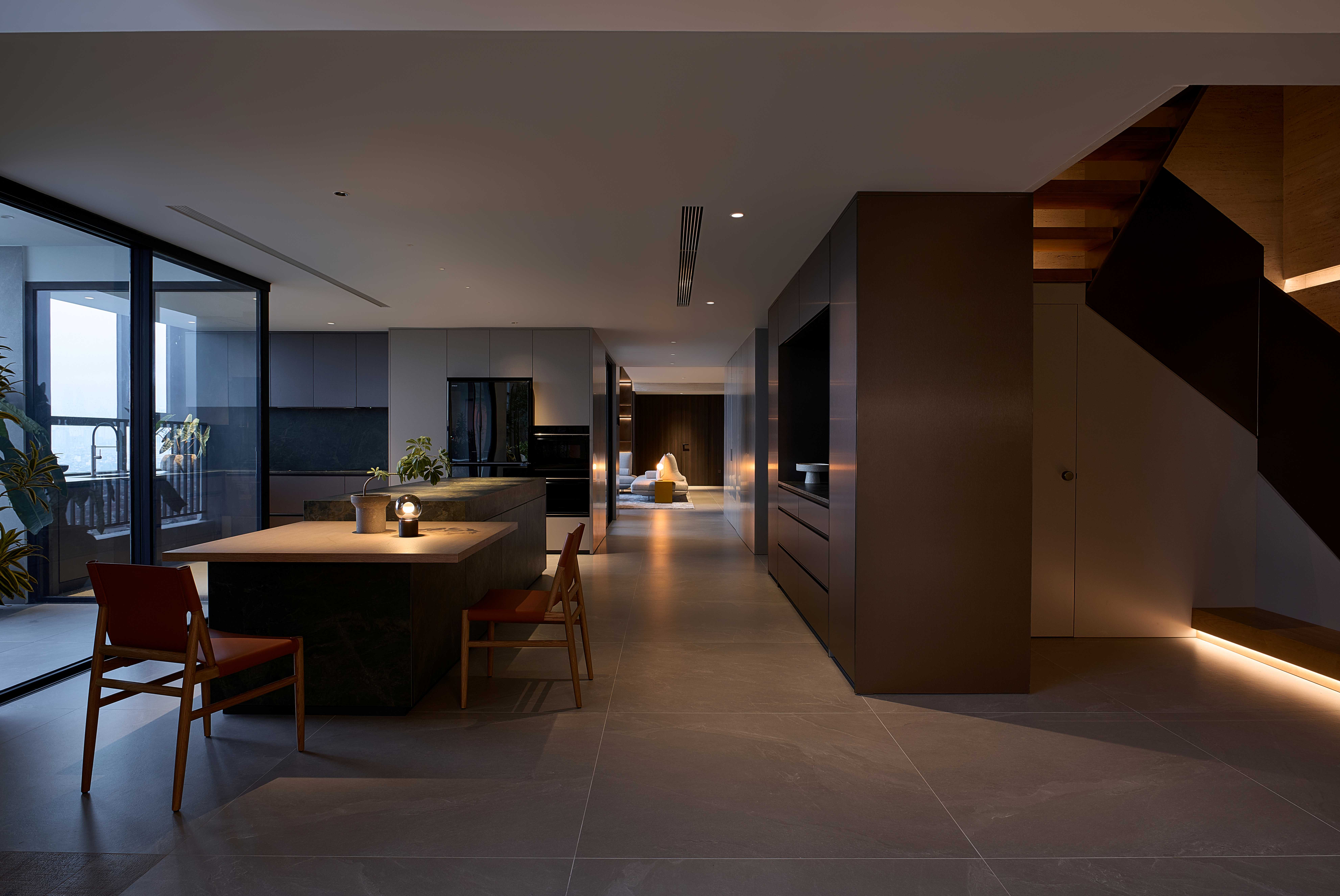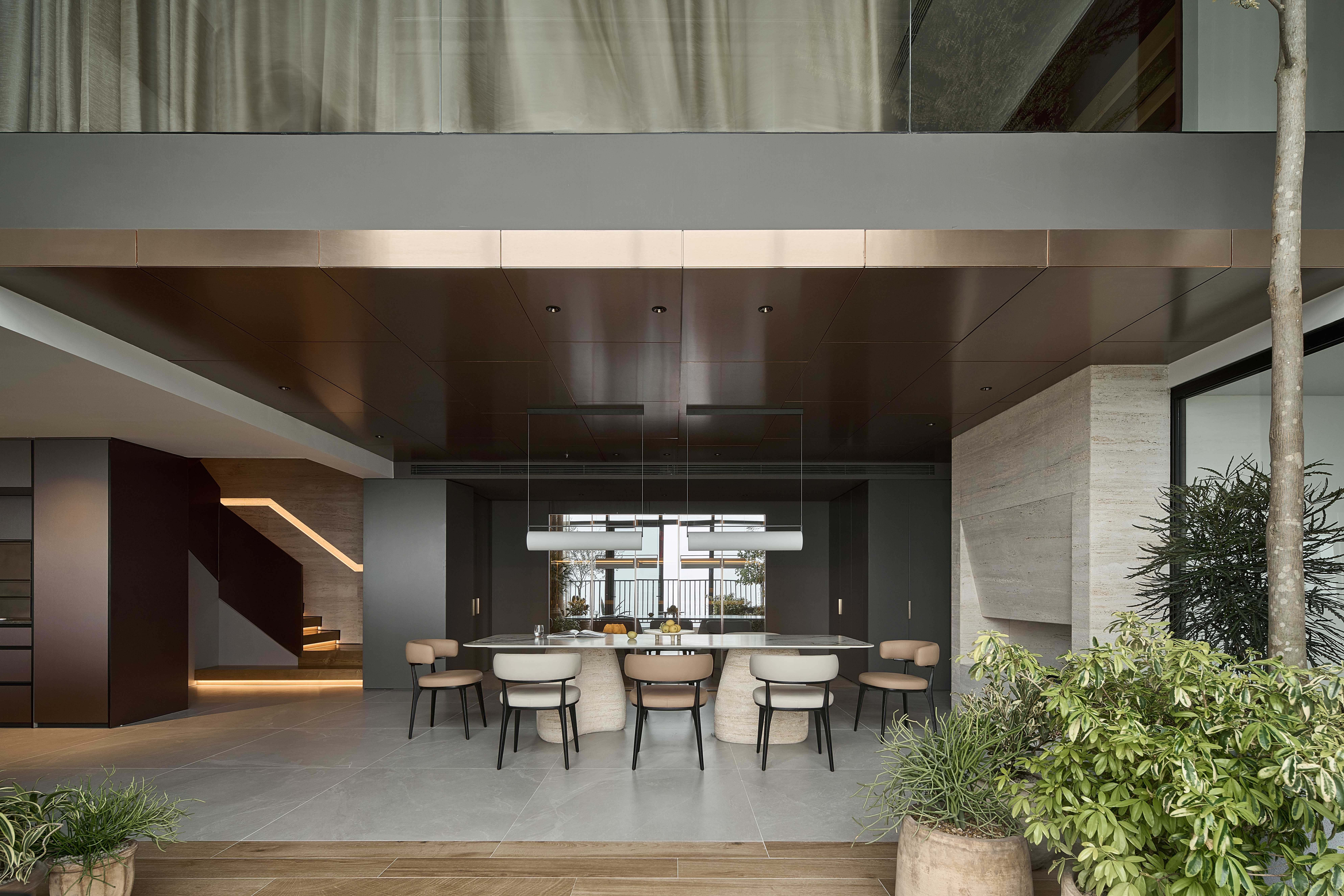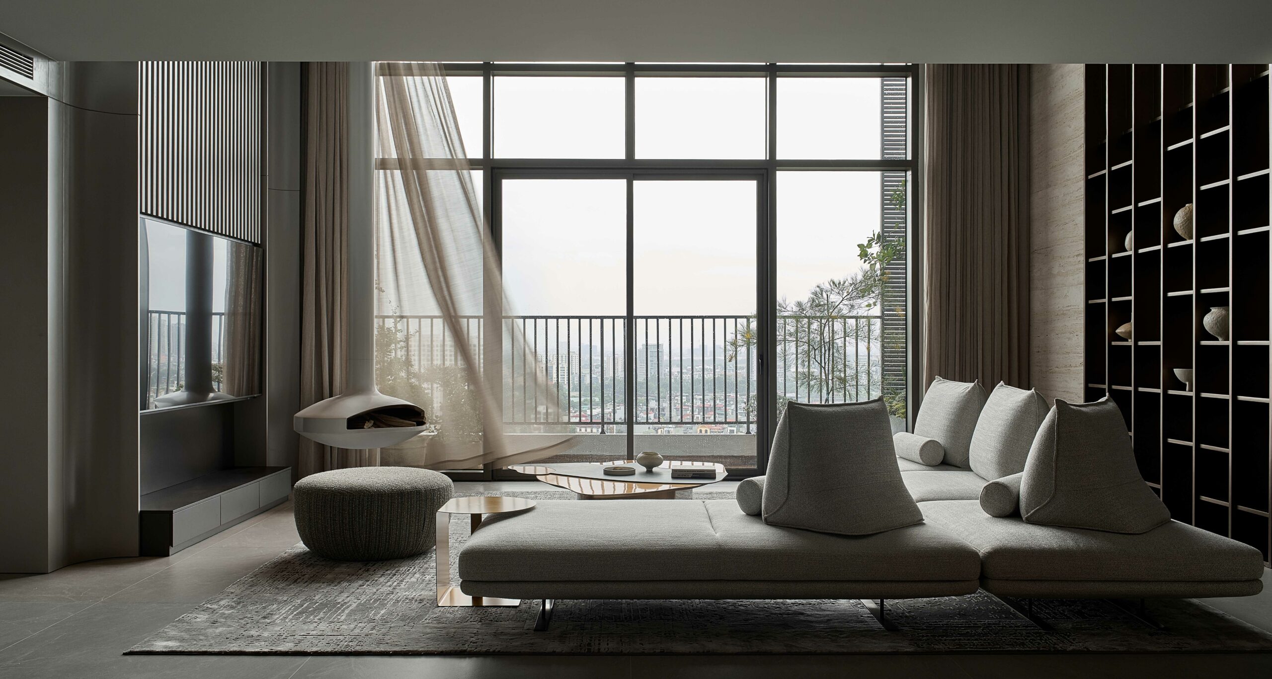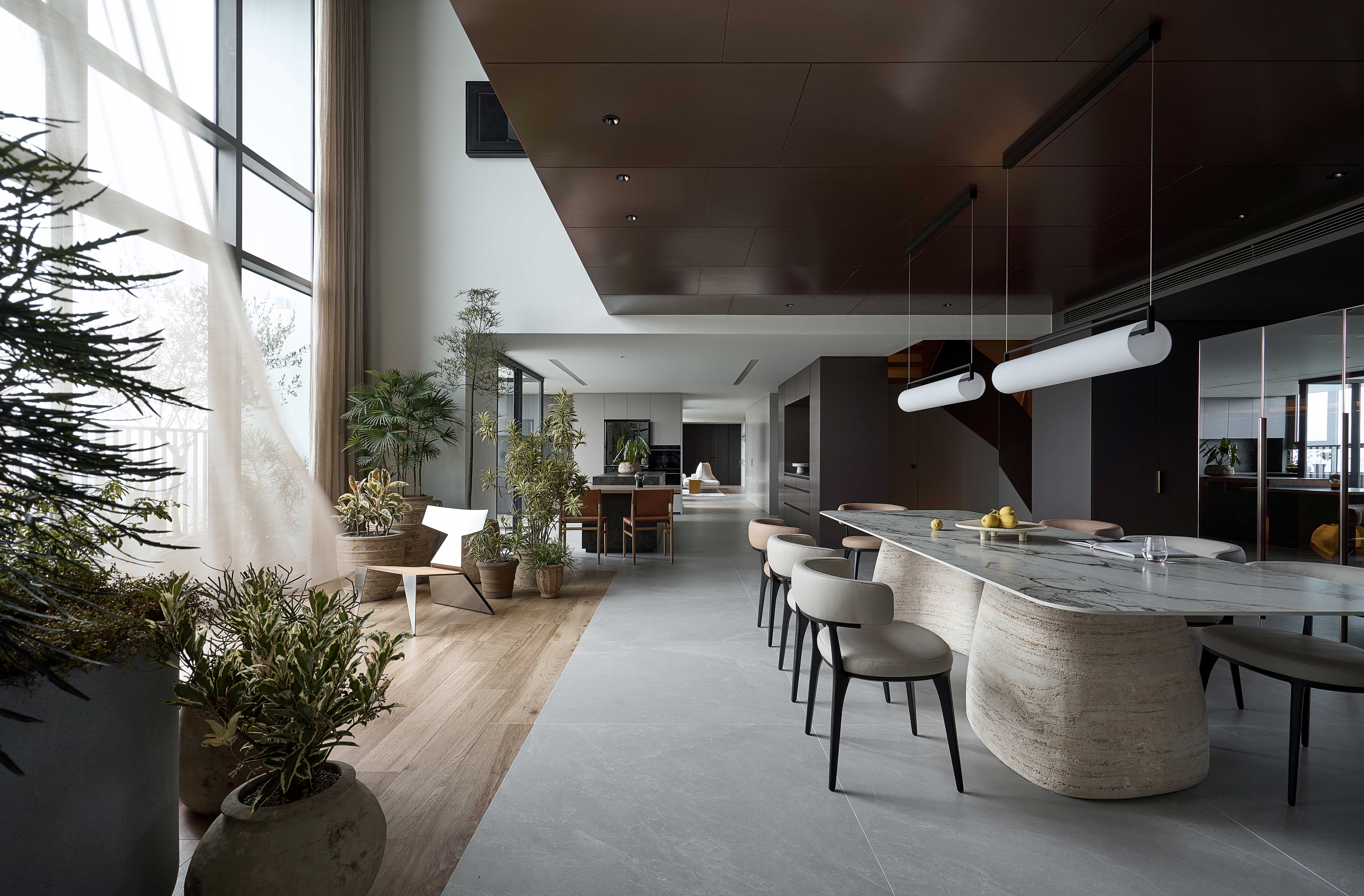Ngôn ngữ kiến trúc hiện đại được thể hiện rõ rệt qua đường nét mạch lạc, mạnh mẽ. Đá travertine thô mộc kết hợp cùng vật liệu kim loại tạo nên sự tương phản tinh tế nhưng nổi bật. Khai Sơn Penthouse không chỉ là nơi ở, mà còn là biểu hiện của sự cởi mở, sáng tạo và gắn kết gia đình trong một không gian sống trên cao.