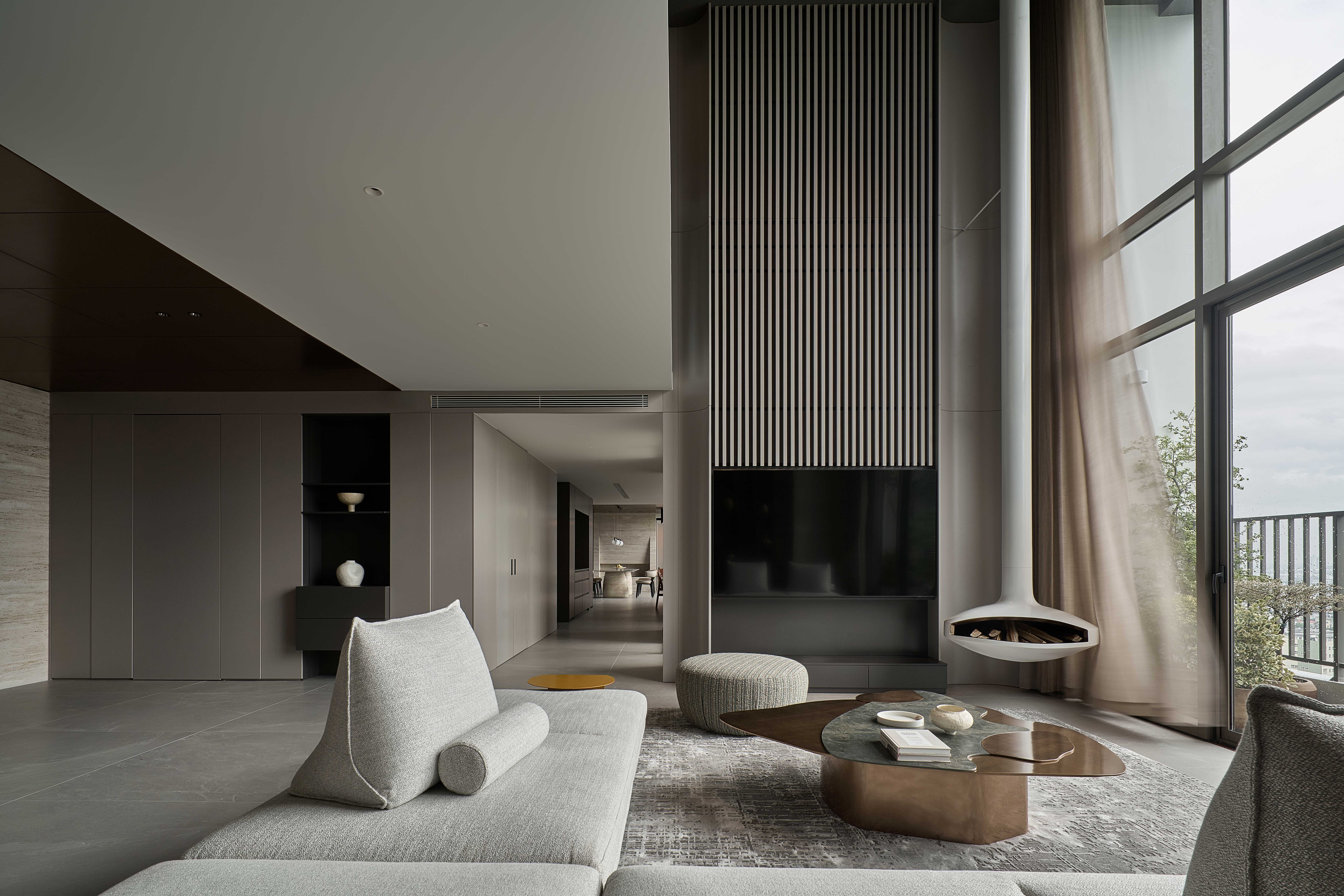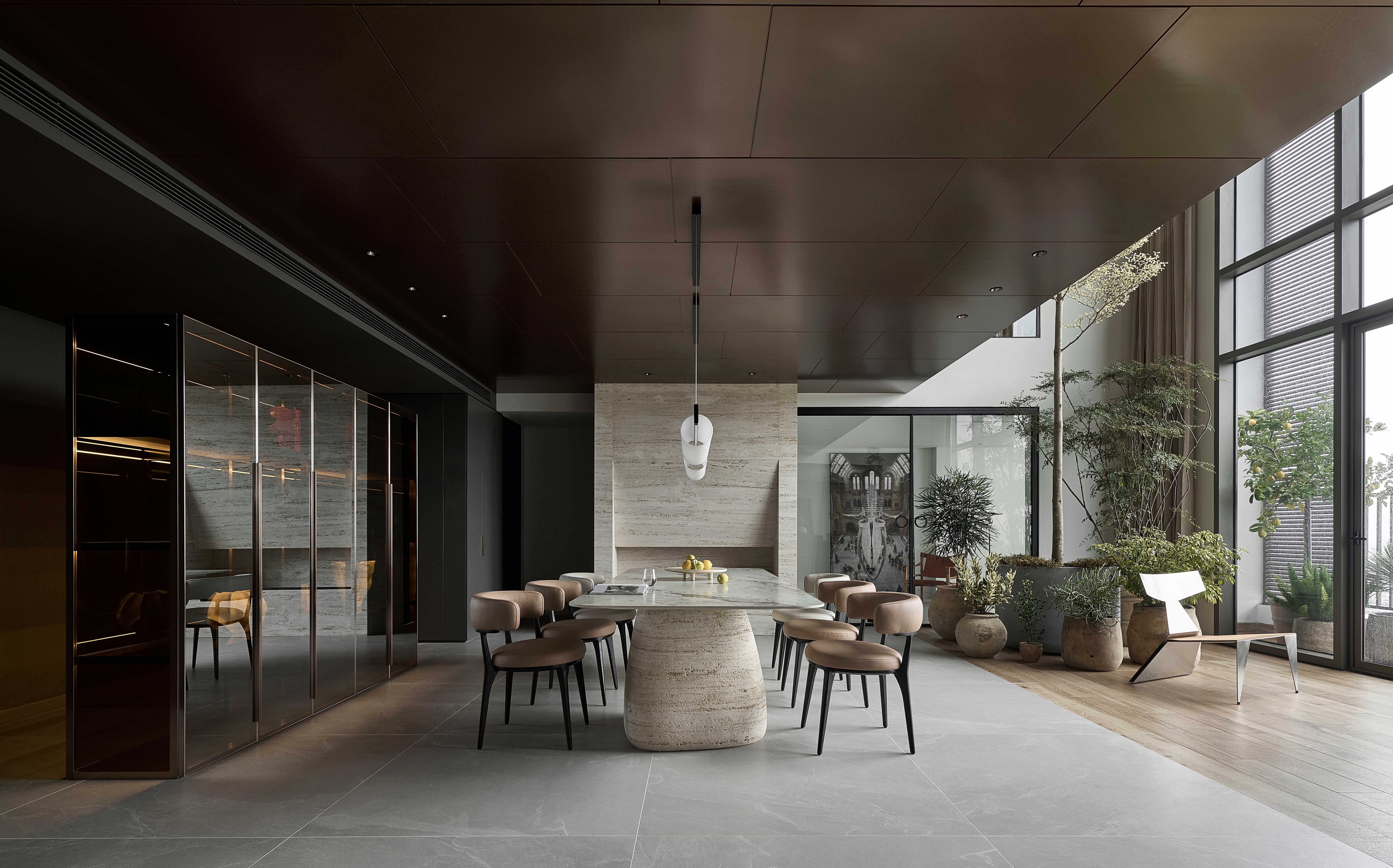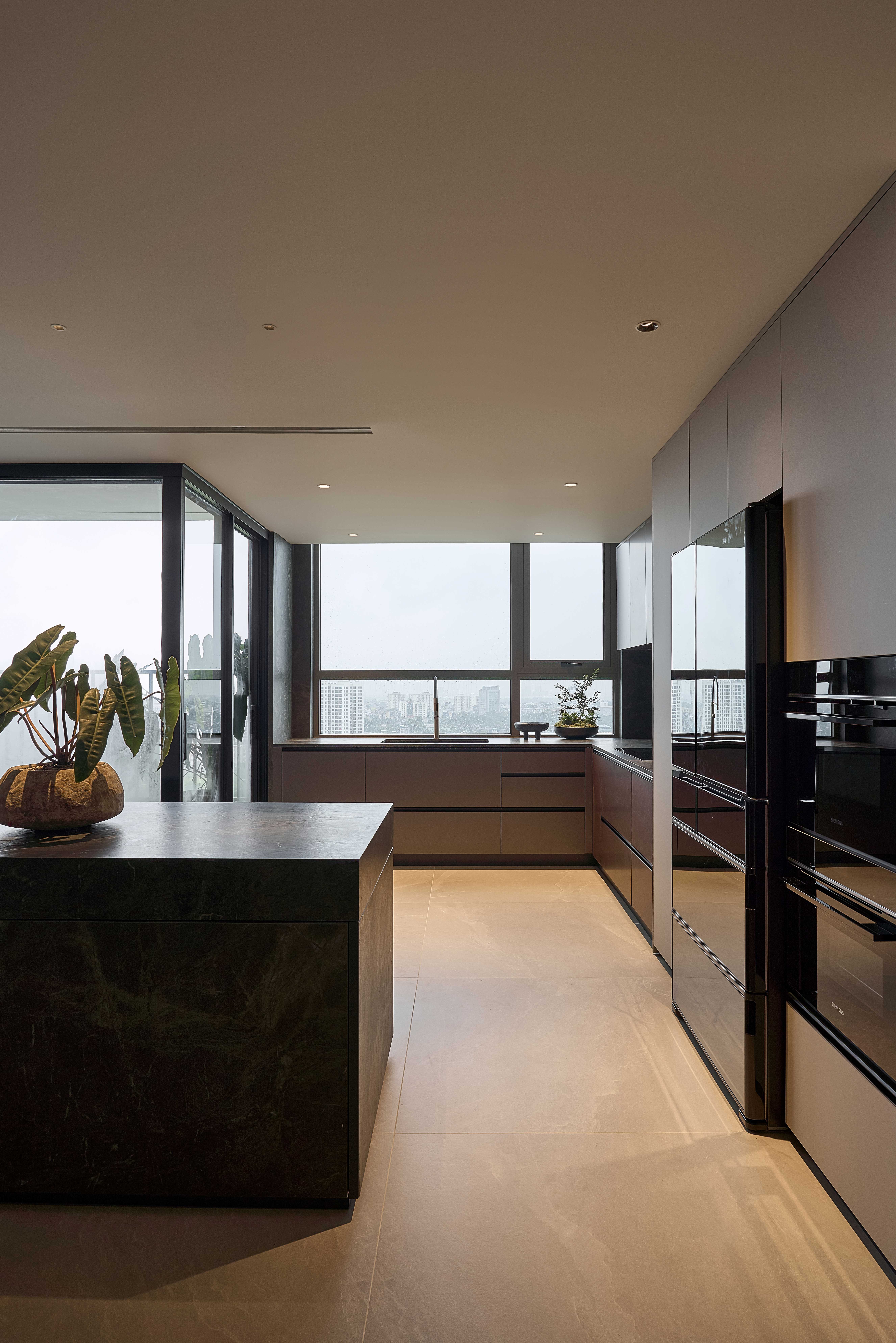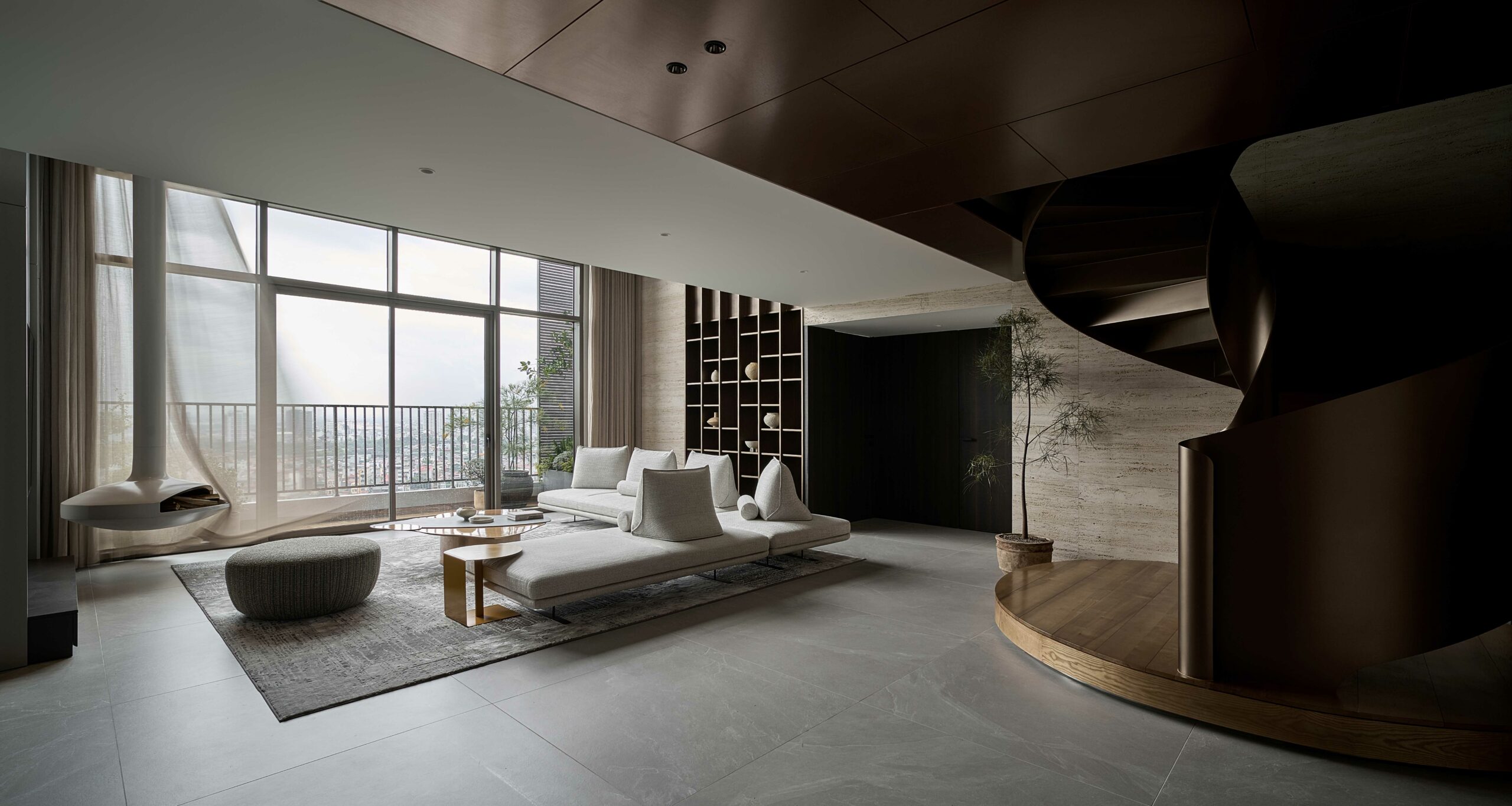 Ngôn ngữ kiến trúc hiện đại được thể hiện rõ rệt qua đường nét mạch lạc, mạnh mẽ. Đá travertine thô mộc kết hợp cùng vật liệu kim loại tạo nên sự tương phản tinh tế nhưng nổi bật. Khai Sơn Penthouse không chỉ là nơi ở, mà còn là biểu hiện của sự cởi mở, sáng tạo và gắn kết gia đình trong một không gian sống trên cao.