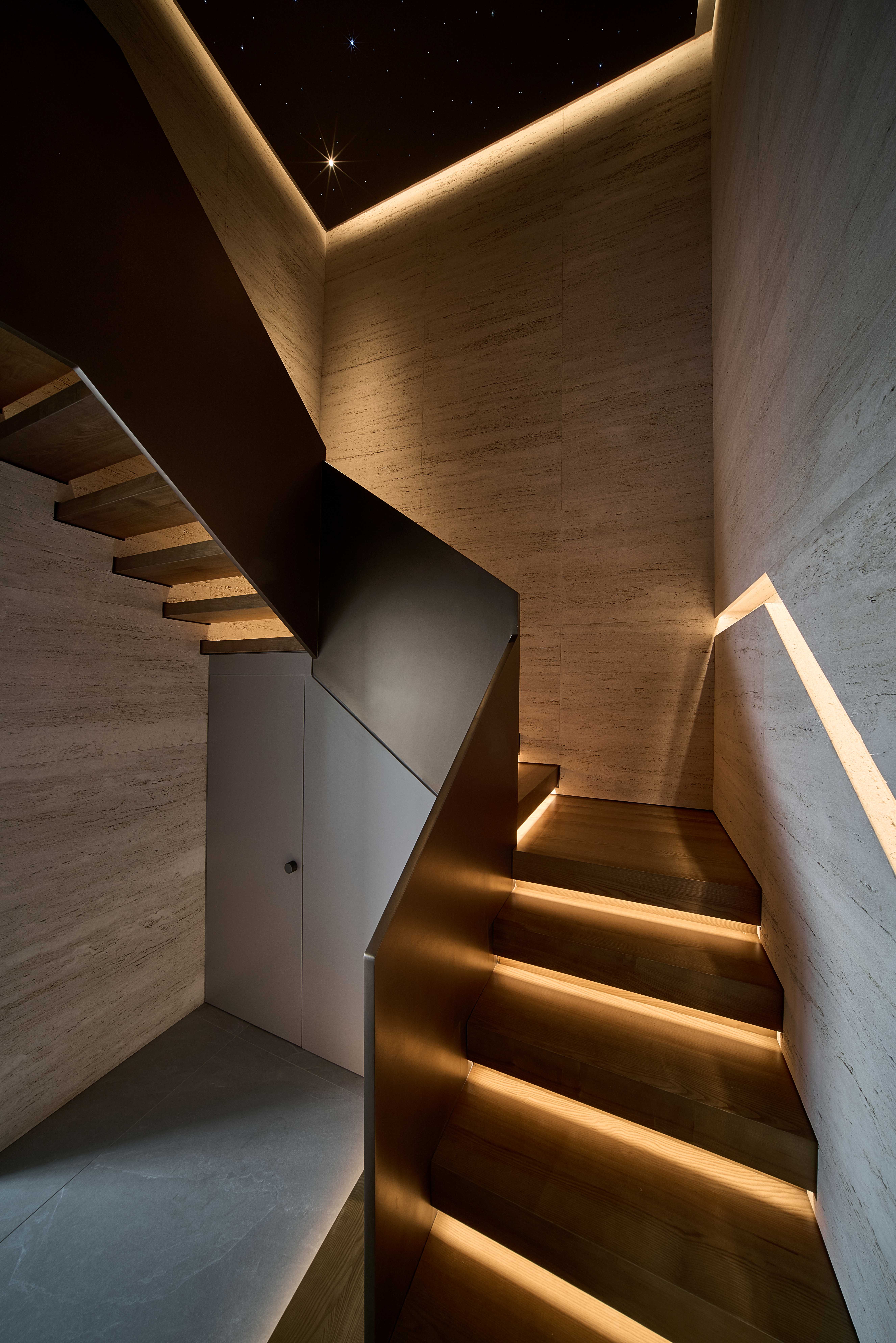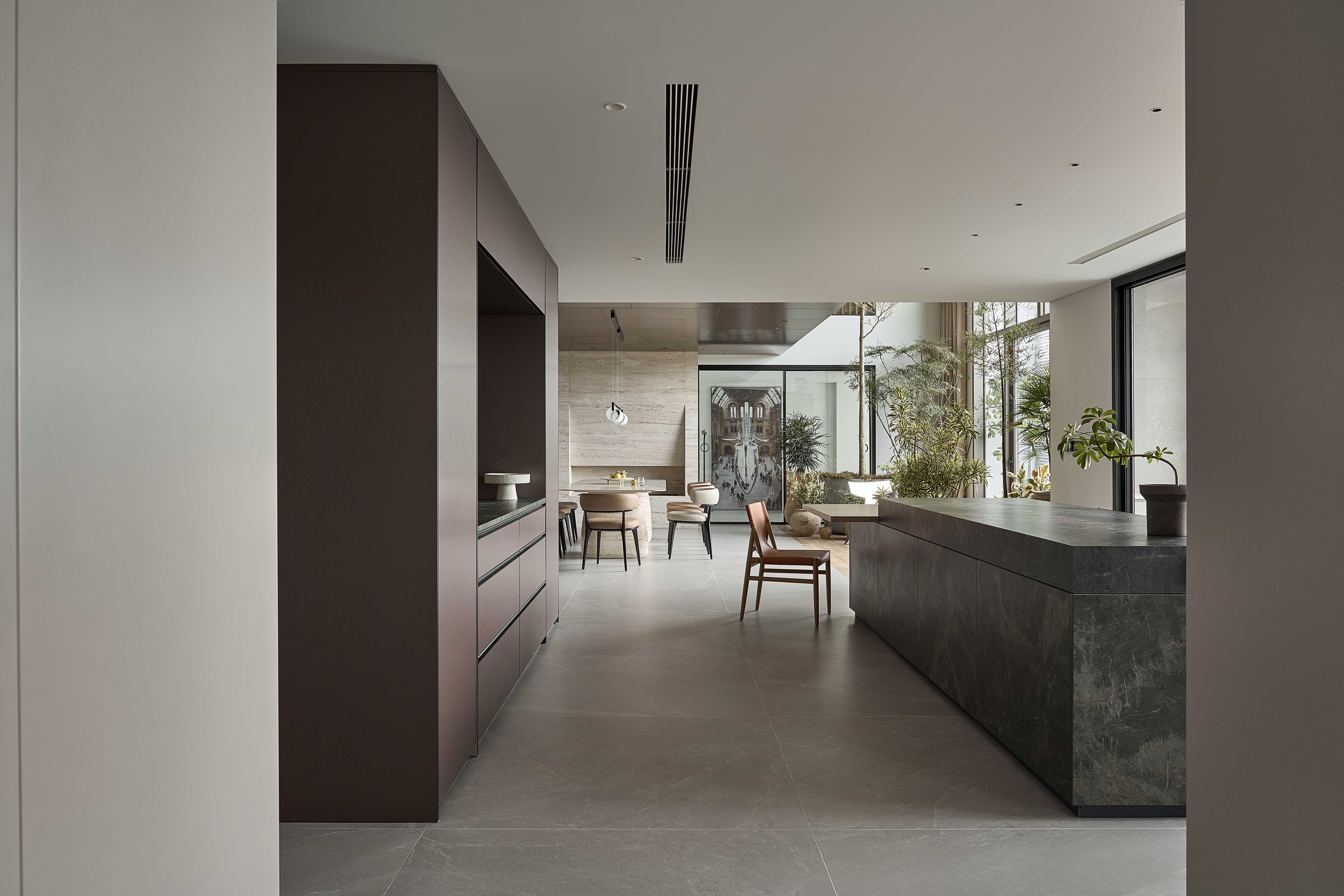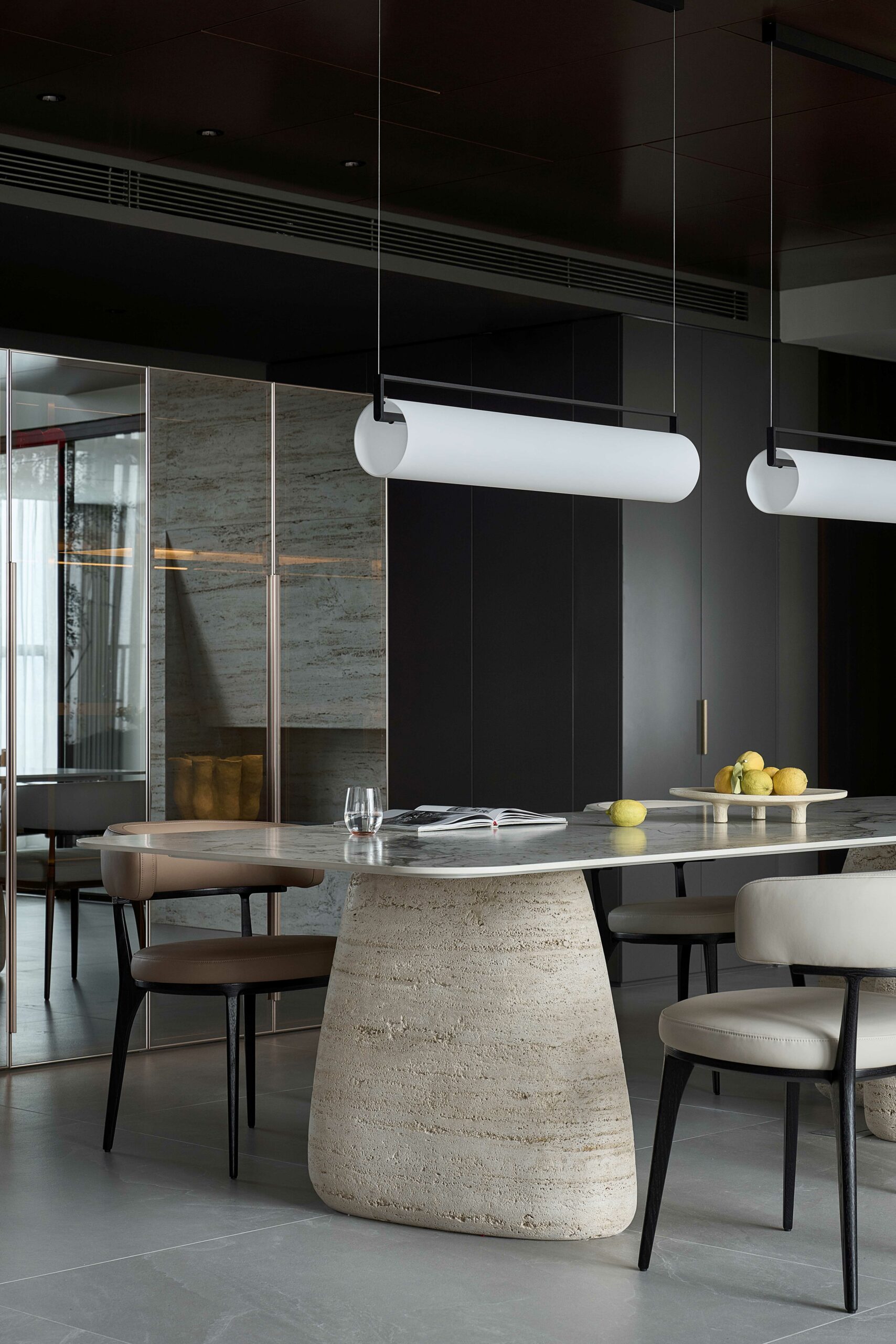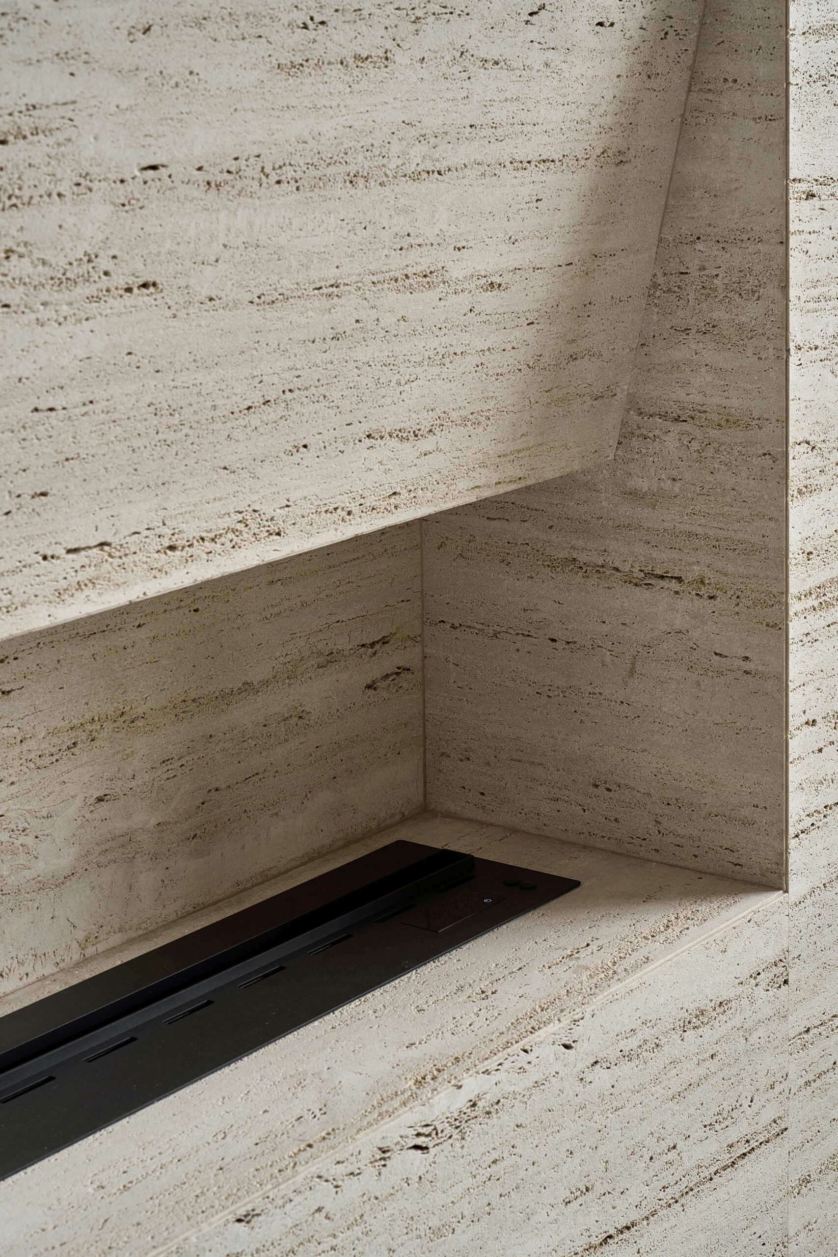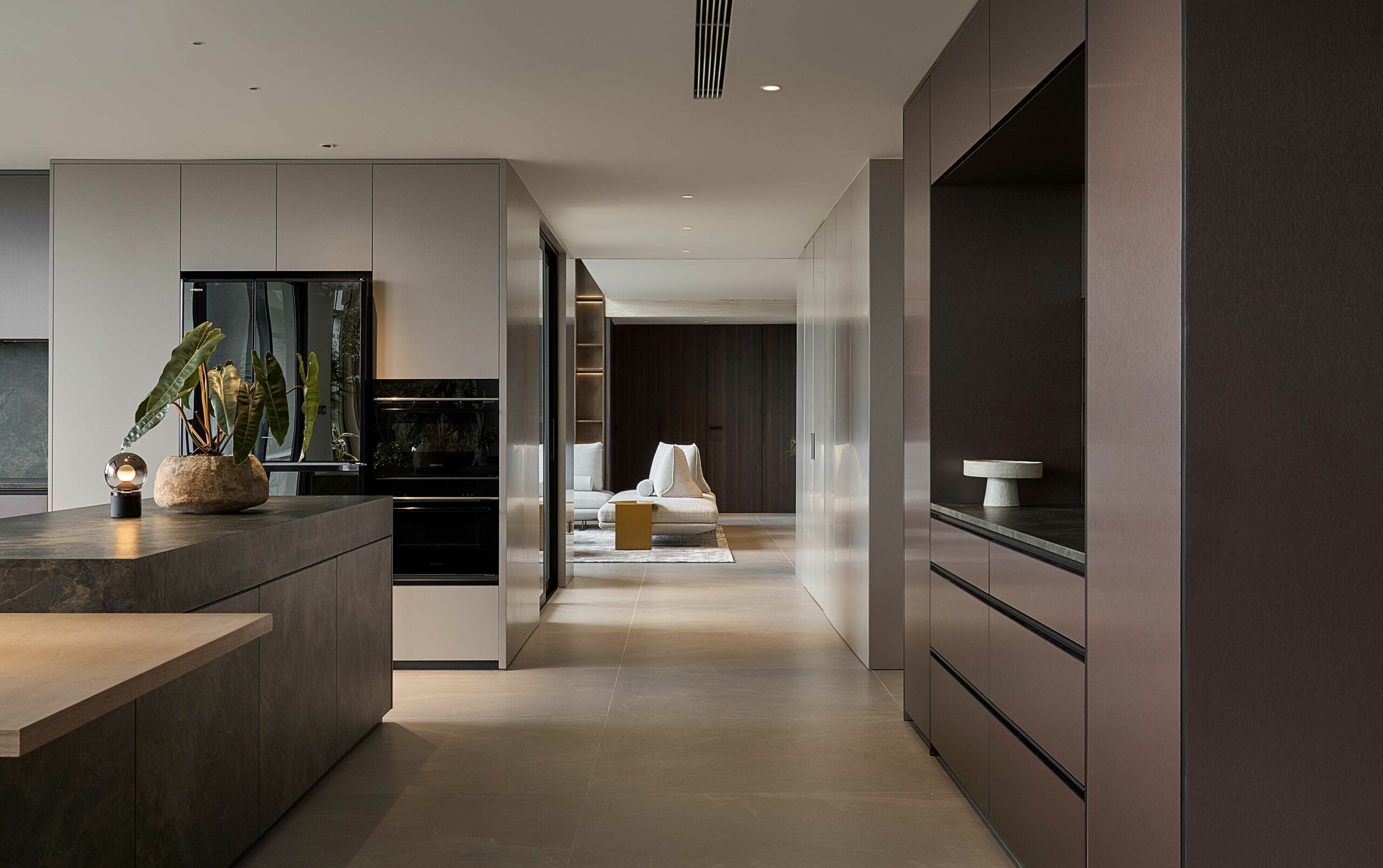 Ngôn ngữ kiến trúc hiện đại được thể hiện rõ rệt qua đường nét mạch lạc, mạnh mẽ. Đá travertine thô mộc kết hợp cùng vật liệu kim loại tạo nên sự tương phản tinh tế nhưng nổi bật. Khai Sơn Penthouse không chỉ là nơi ở, mà còn là biểu hiện của sự cởi mở, sáng tạo và gắn kết gia đình trong một không gian sống trên cao.