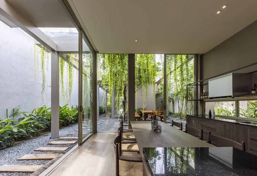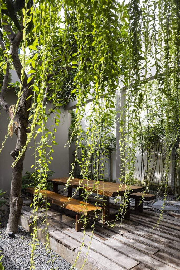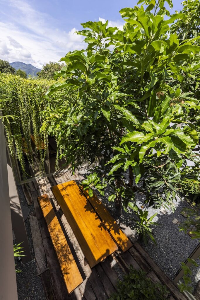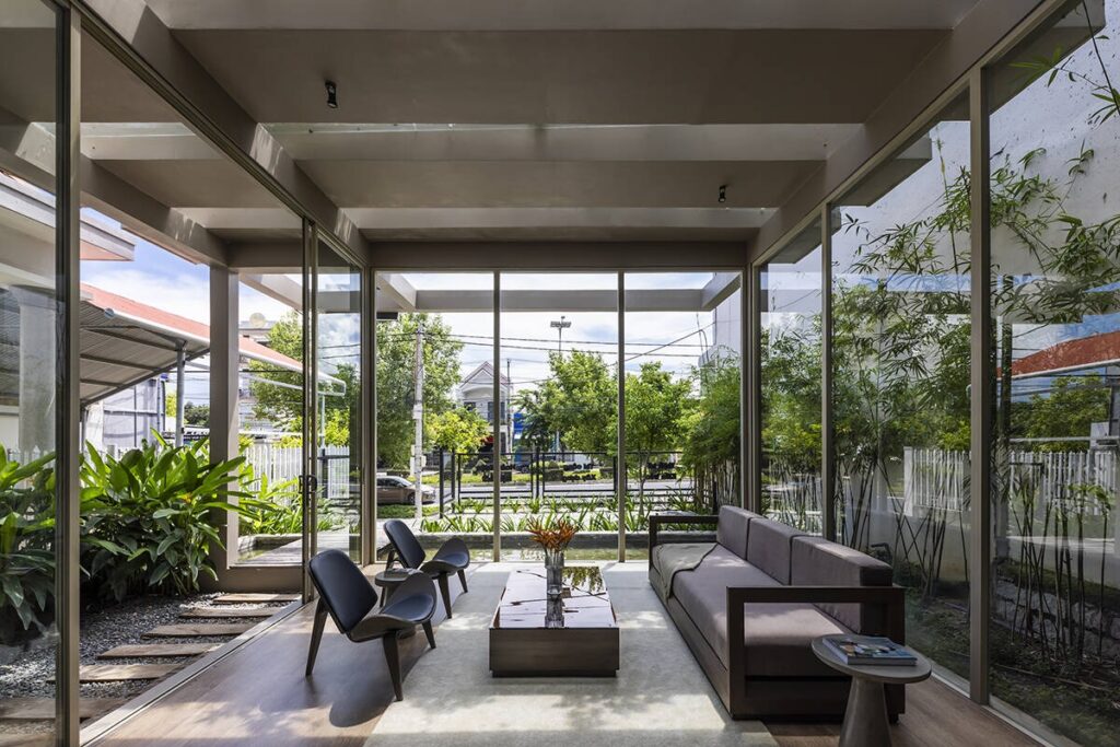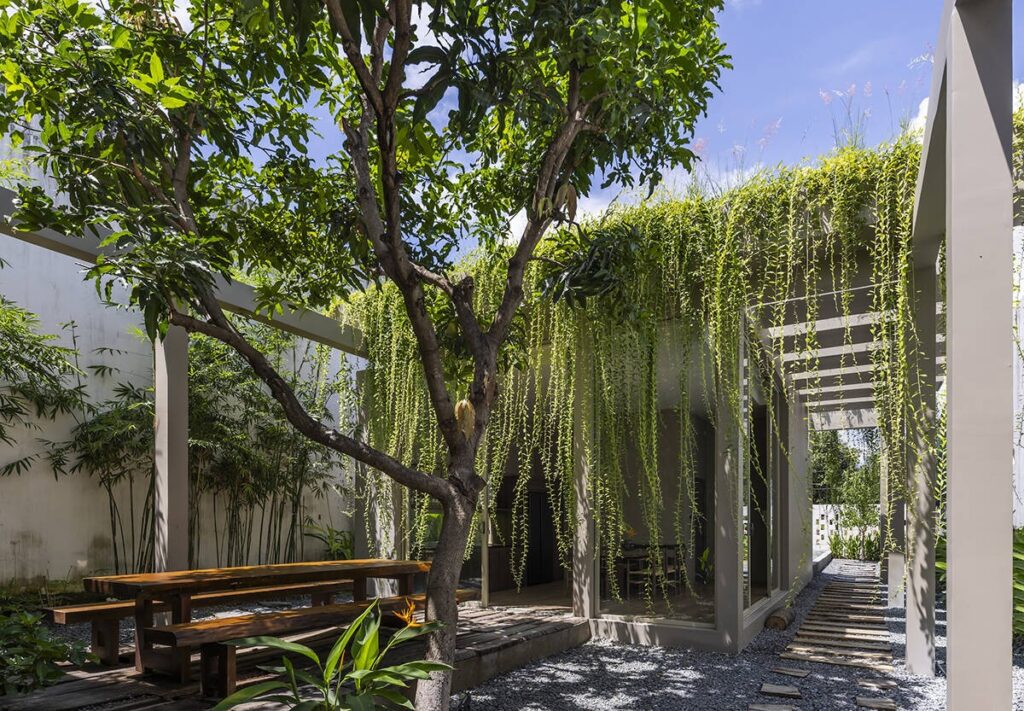 Việc tích hợp đa công năng luôn là bài toán khó về giao thông và sự riêng tư. Tuy nhiên, chúng tôi tìm thấy chìa khóa để giải đề bài ngay tại hiện trạng khu đất, một gốc cây xoài lớn tự nhiên thay vì chặt bỏ, chúng tôi biến nó thành tâm điểm của một sân trong. Không gian đệm này vừa là không gian làm việc ngoài trời, vừa đóng vai trò như một nút thắt giao thông tự nhiên, phân tách rạch ròi nhưng vẫn kết nối tinh tế giữa khu vực văn phòng làm việc phía trước và không gian nhà mẫu phía sau.