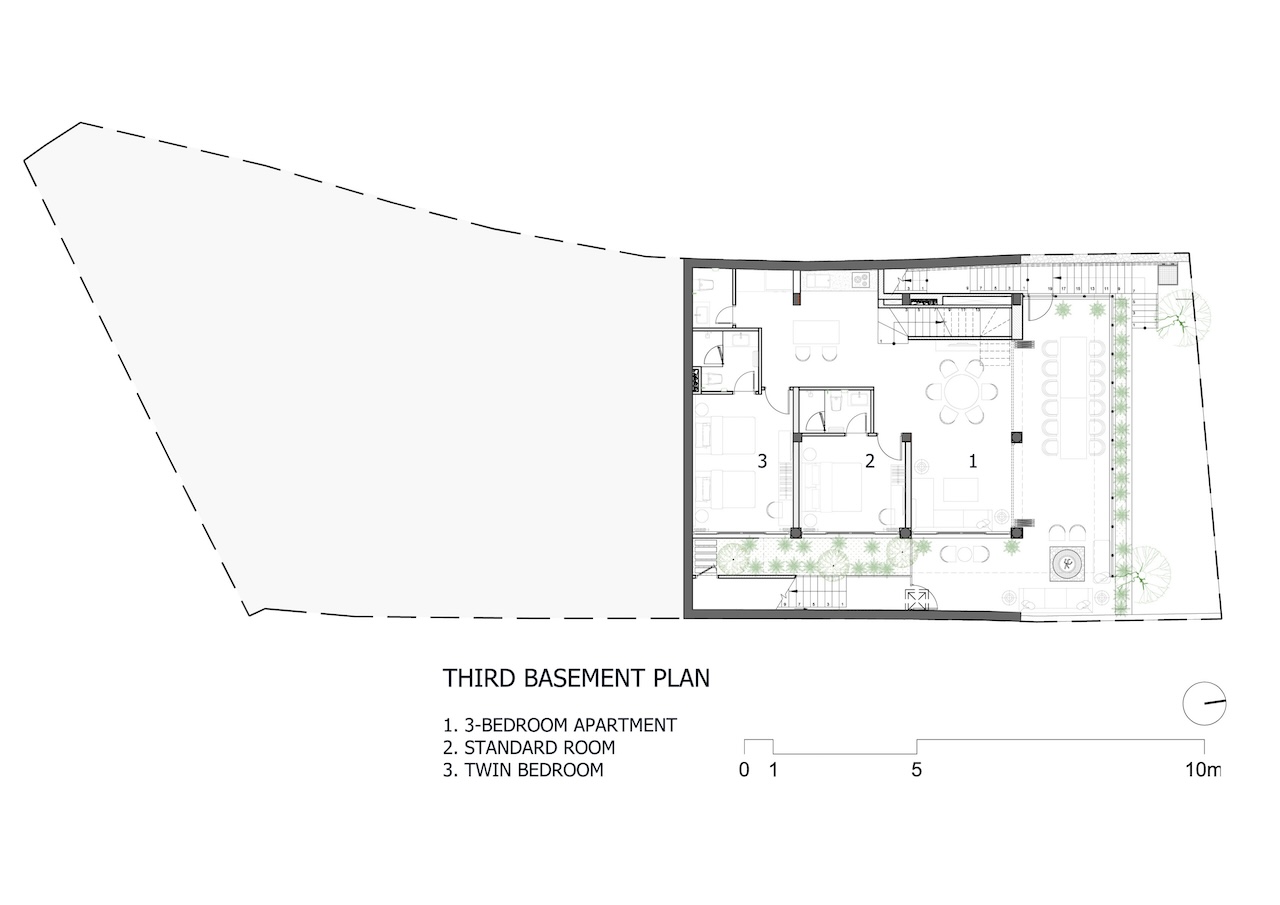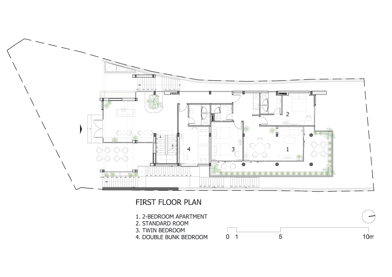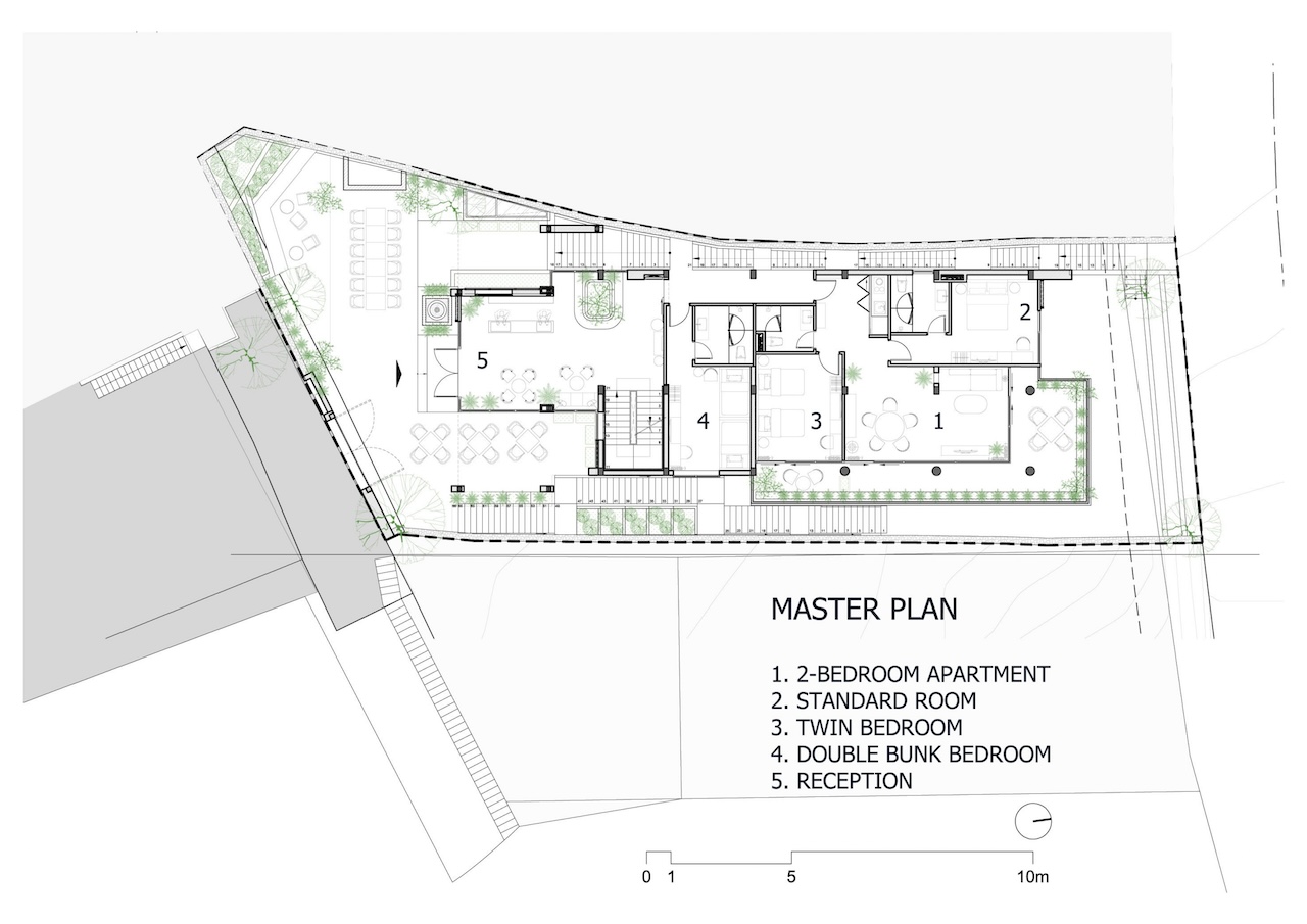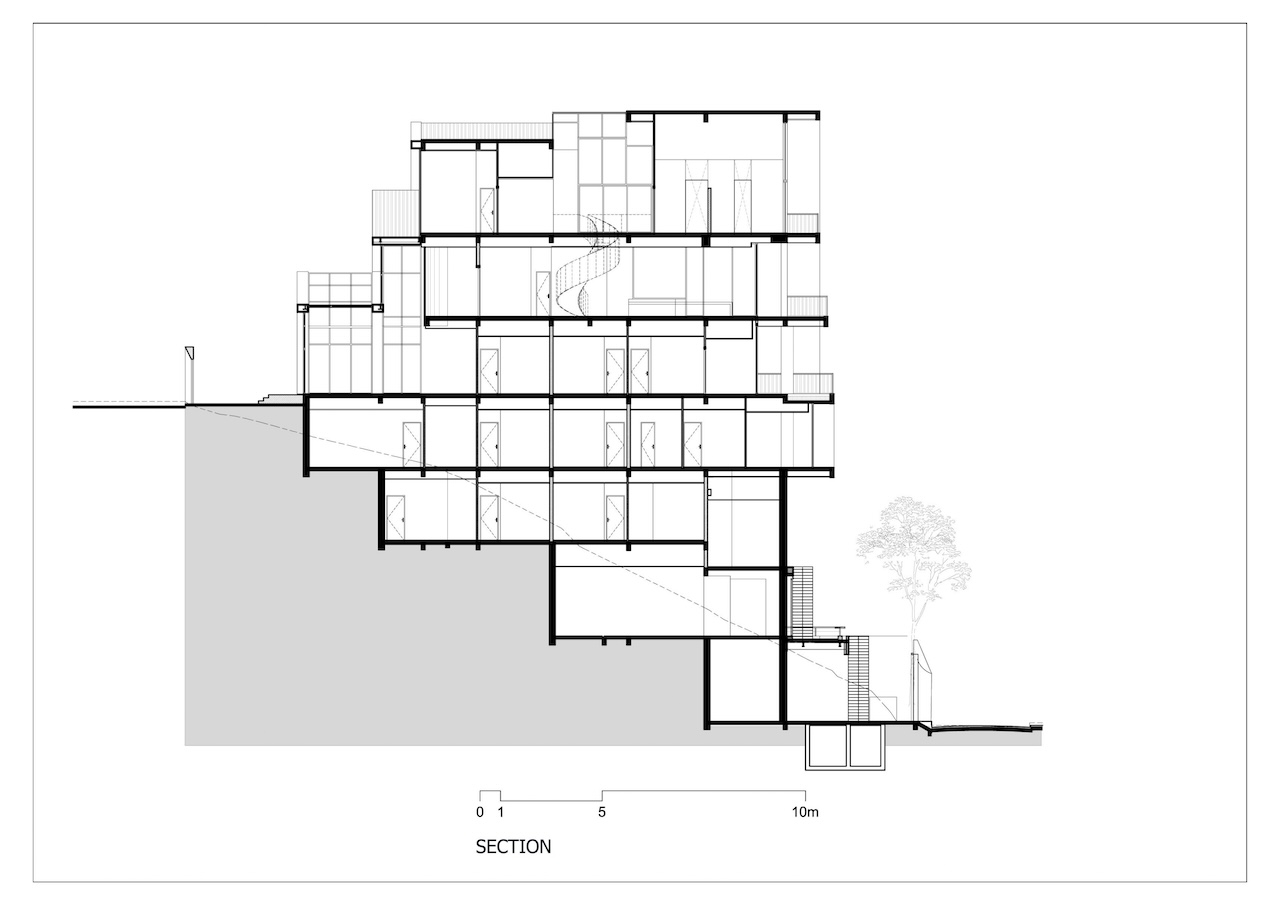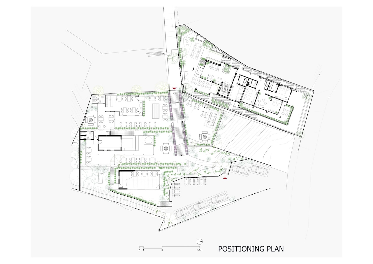 Với công trình này, nhóm thiết kế lựa chọn giải pháp kiến trúc phân lớp theo dạng bậc thang, bám sát địa hình tự nhiên để tổ chức không gian theo nhiều cao độ khác nhau. Cách này vừa hạn chế tác động đến thảm thực vật hiện trạng, vừa đảm bảo mỗi không gian bên trong đều có khả năng tiếp cận trực tiếp với cảnh quan rừng thông và thung lũng.