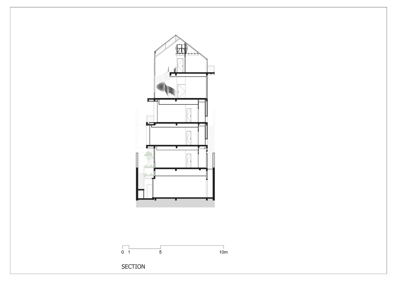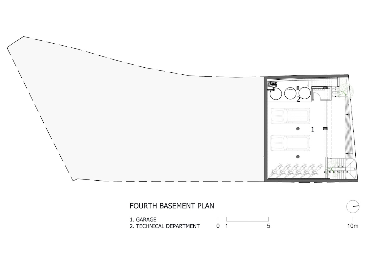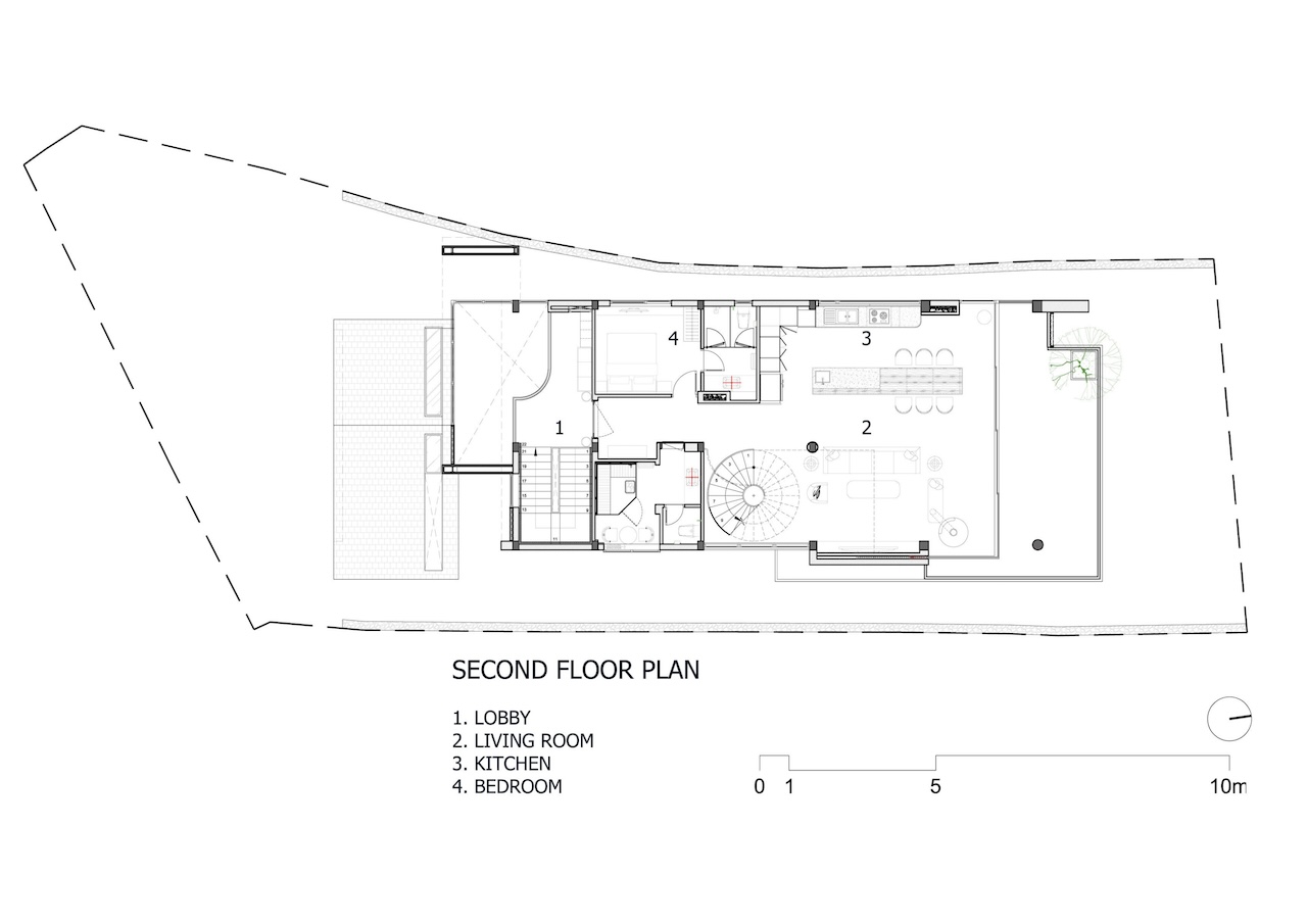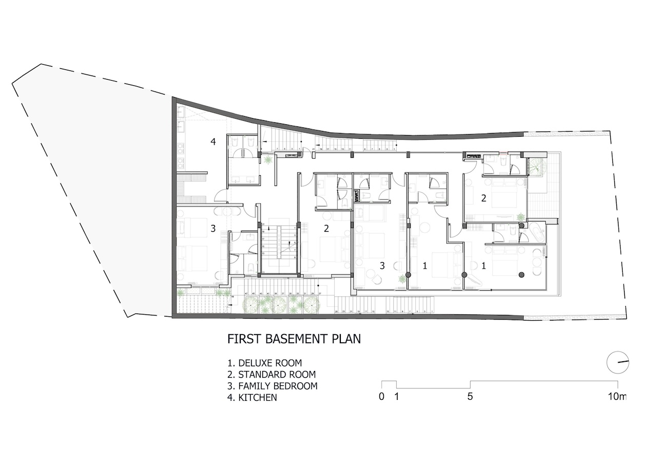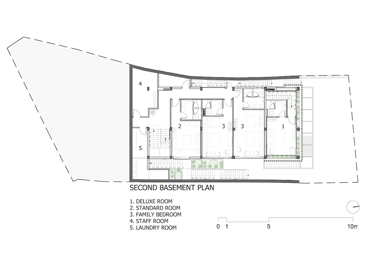 Với công trình này, nhóm thiết kế lựa chọn giải pháp kiến trúc phân lớp theo dạng bậc thang, bám sát địa hình tự nhiên để tổ chức không gian theo nhiều cao độ khác nhau. Cách này vừa hạn chế tác động đến thảm thực vật hiện trạng, vừa đảm bảo mỗi không gian bên trong đều có khả năng tiếp cận trực tiếp với cảnh quan rừng thông và thung lũng.